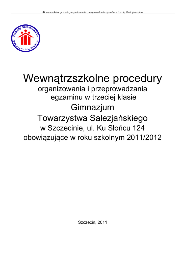 Wewnątrzszkolne procedury organizowania i przeprowadzania egzaminu w trzeciej klasie gimnazjum Wewnątrzszkolne procedury organizowania i przeprowadzania egzaminu w trzeciej klasie Gimnazjum Towarzystwa Salezjańskiego w Szczecinie, ul. Ku Słońcu 124 obowiązujące w roku szkolnym 2011/2012 Szczecin, 2011 Wewnątrzszkolne procedury organizowania i przeprowadzania egzaminu w trzeciej klasie gimnazjum I. Spis treści Wewnątrzszkolna instrukcja przygotowania i organizacji egzaminu w Gimnazjum Towarzystwa Salezjańskiego zawiera: I. II III IV V VI VII Spis treści Wstęp Instrukcja postępowania z niejawnymi materiałami egzaminacyjnymi 1. Sposób zabezpieczenia i przechowywania materiałów egzaminacyjnych 2. Forma i terminy przeszkolenia osób mających dostęp do niejawnych materiałów egzaminacyjnych Terminarz realizacji zadań związanych z przygotowaniem i przeprowadzeniem egzaminu w klasie trzeciej gimnazjum w roku szkolnym 2011/2012. Zasady obiegu informacji dotyczących egzaminu. Przygotowanie i organizacja egzaminu. 1 Miejsce i warunki przeprowadzania egzaminu 2 Zadania przewodniczącego (zastępcy przewodniczącego) szkolnego zespołu egzaminacyjnego 3 Zgłaszanie uczniów do egzaminu 4 Dostosowanie warunków i form egzaminu do indywidualnych potrzeb uczniów ze specjalnymi potrzebami edukacyjnymi 5 Powołanie szkolnego zespołu egzaminacyjnego i zespołów nadzorujących 6 Zadania zespołu nadzorującego egzamin 7 Organizacja i przebieg egzaminu 8 Informacje dla ucznia dotyczące przebiegu egzaminu 9 Postępowanie z materiałami egzaminacyjnymi objętymi ochroną przed nieuprawnionym ujawnieniem 10 Wyniki egzaminu 11 Instrukcje Postępowanie w sytuacjach szczególnych 1. Postępowanie w przypadku zaginięcia pakietu zawierającego zestawy egzaminacyjne 2. Postępowanie w przypadku ujawnienia zadań egzaminacyjnych 3.Postępowanie w przypadku stwierdzenia braku stron lub innych usterek w zestawach egzaminacyjnych 4.Postępowanie w przypadku wystąpienia usterki płyty CD podczas części egzaminu z języka obcego nowożytnego 5. Postępowanie w przypadku zagrożenia/nagłego zakłócenia przebiegu egzaminu 6. Przerwanie pracy z zestawem egzaminacyjnym i unieważnienie części egzaminu Załączniki 1a. 1b. 2 3. 4. 5. 6. 7. 8. 9a. 9b. 9c. 10. 11. Deklaracja przystąpienia do części egzaminu z języka obcego nowożytnego Deklaracja/wniosek o przystąpienia do części egzaminu z języka obcego nowożytnego na poziomie rozszerzonym ucznia, który ma obowiązek przystąpienia do części egzaminu z języka obcego nowożytnego tylko na poziomie podstawowym Wniosek dyrektora szkoły o zwolnienie ucznia z obowiązku przystąpienia do egzaminu / części egzaminu Wniosek rodziców (prawnych opiekunów) o zwolnienie ucznia z obowiązku przystąpienia do egzaminu Deklaracja przystąpienia ucznia szkoły lub oddziału z językiem nauczania mniejszości narodowej do egzaminu / części egzaminu w języku mniejszości narodowej Powołanie zastępcy przewodniczącego szkolnego zespołu egzaminacyjnego Powołanie członków szkolnego zespołu egzaminacyjnego oraz zespołów nadzorujących Oświadczenie w sprawie zabezpieczenia materiałów egzaminacyjnych przed nieuprawnionym ujawnieniem i ochrony danych osobowych Protokół przebiegu egzaminu gimnazjalnego w sali Zbiorczy protokół przebiegu egzaminu gimnazjalnego – część humanistyczna Zbiorczy protokół przebiegu egzaminu gimnazjalnego – część matematyczno-przyrodnicza Zbiorczy protokół przebiegu egzaminu gimnazjalnego – część z języka obcego nowożytnego Decyzja o przerwaniu pracy z zestawem egzaminacyjnym i unieważnieniu odpowiedniej części egzaminu Upoważnienie do odbioru, dostępu i przekazania materiałów egzaminacyjnych 2 Wewnątrzszkolne procedury organizowania i przeprowadzania egzaminu w trzeciej klasie gimnazjum II. Wstęp 1. Procedury i instrukcje zostały opracowane zgodnie z: ─ rozporządzeniem Ministra Edukacji Narodowej z dnia 30 kwietnia 2007 r. w sprawie warunków i sposobu oceniania, klasyfikowania i promowania uczniów i słuchaczy oraz przeprowadzania sprawdzianów i egzaminów w szkołach publicznych (Dz.U. nr 83, poz. 562, z późn. zm.), zwanym dalej rozporządzeniem ─ rozporządzeniem Ministra Kultury i Dziedzictwa Narodowego z dnia 8 kwietnia 2008 r. w sprawie warunków i sposobu oceniania, klasyfikowania i promowania uczniów oraz przeprowadzania sprawdzianów i egzaminów w publicznych szkołach i placówkach artystycznych (Dz.U. nr 65, poz. 400, z późn. zm.) ─ rozporządzeniem Ministra Edukacji Narodowej z dnia 17 listopada 2010 r. w sprawie warunków organizowania kształcenia, wychowania i opieki dla dzieci i młodzieży niepełnosprawnych oraz niedostosowanych społecznie w przedszkolach, szkołach i oddziałach ogólnodostępnych lub integracyjnych (Dz.U. nr 228, poz. 1490) ─ rozporządzeniem Ministra Edukacji Narodowej z dnia 17 listopada 2010 r. w sprawie warunków organizowania kształcenia, wychowania i opieki dla dzieci i młodzieży niepełnosprawnych oraz niedostosowanych społecznie w specjalnych przedszkolach, szkołach i oddziałach oraz w ośrodkach (Dz.U. nr 228, poz. 1489) ─ rozporządzeniem Ministra Edukacji Narodowej z dnia 28 maja 2010 r. w sprawie świadectw, dyplomów państwowych i innych druków szkolnych (Dz.U. nr 97, poz. 624) ─ ustawą z dnia 7 września 1991 r. o systemie oświaty (Dz.U. z 2004 r. nr 256, poz. 2572, z późn. zm.), ─ ustawą z dnia 22 stycznia 1999 r. o ochronie informacji niejawnych (Dz.U. z 2005 r. nr 196, poz. 1631, z późn. zm.) ─ ustawą z dnia 14 lipca 1983 r. o narodowym zasobie archiwalnym i archiwach (Dz.U. z 2006 r. nr 97, poz. 673, z późn. zm.) ─ ustawą z dnia 29 sierpnia 1997 r. o ochronie danych osobowych (Dz.U. z 2002 r. nr 101, poz. 926, z późn. zm.) ─ Informatorem o egzaminie gimnazjalnym od roku szkolnego 2011/2012, opublikowanym na stronie internetowej Centralnej Komisji Egzaminacyjnej ─ Komun
