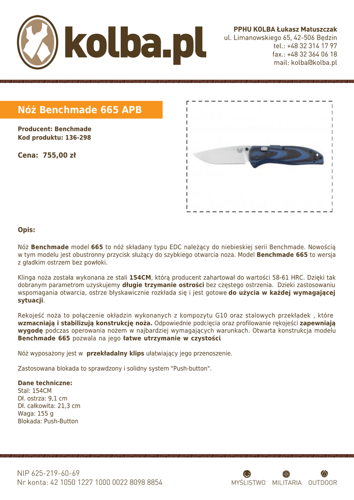 Nóż Benchmade 665 APB Producent: Benchmade Kod produktu: 136-298 Cena: 755,00 zł Opis: Nóż Benchmade model 665 to nóż składany typu EDC należący do niebieskiej serii Benchmade. Nowością w tym modelu jest obustronny przycisk służący do szybkiego otwarcia noza. Model Benchmade 665 to wersja z gładkim ostrzem bez powłoki. Klinga noża została wykonana ze stali 154CM, którą producent zahartował do wartości 58-61 HRC. Dzięki tak dobranym parametrom uzyskujemy długie trzymanie ostrości bez częstego ostrzenia. Dzieki zastosowaniu wspomagania otwarcia, ostrze błyskawicznie rozkłada się i jest gotowe do użycia w każdej wymagającej sytuacji. Rekojeść noża to połączenie okładzin wykonanych z kompozytu G10 oraz stalowych przekładek , które wzmacniają i stabilizują konstrukcję noża. Odpowiednie podcięcia oraz profilowanie rękojeści zapewniają wygodę podczas operowania nożem w najbardziej wymagających warunkach. Otwarta konstrukcja modelu Benchmade 665 pozwala na jego łatwe utrzymanie w czystości. Nóż wyposażony jest w przekładalny klips ułatwiający jego przenoszenie. Zastosowana blokada to sprawdzony i solidny system "Push-button". Dane techniczne: Stal: 154CM Dł. ostrza: 9,1 cm Dł. całkowita: 21,3 cm Waga: 155 g Blokada: Push-Button Gwarancja 24 miesiące.