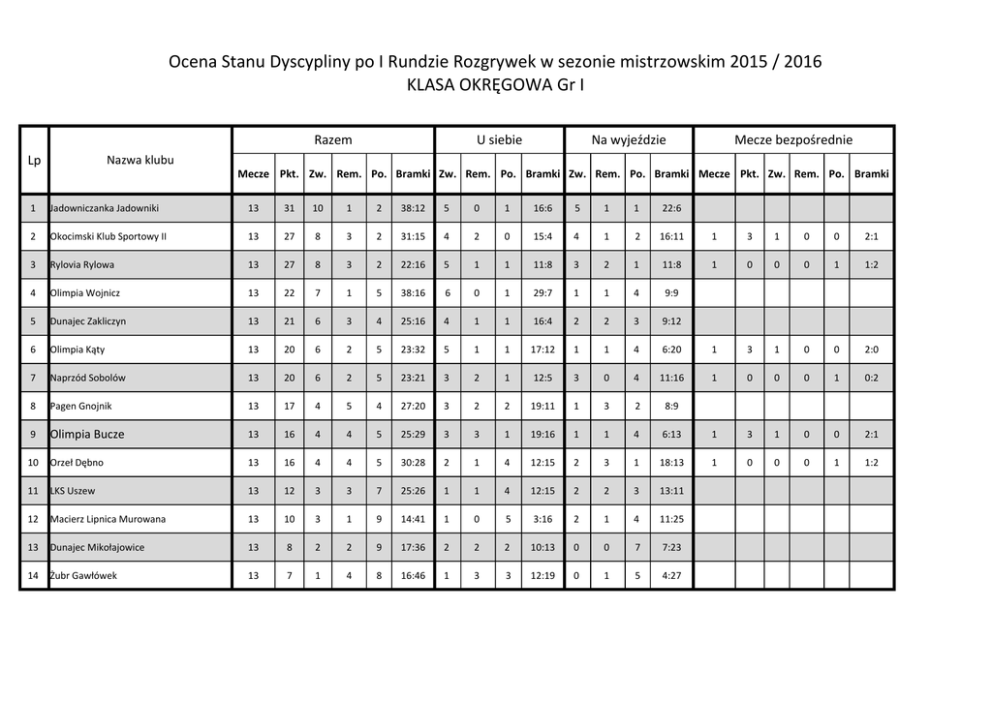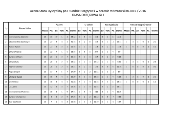 Ocena Stanu Dyscypliny po I Rundzie Rozgrywek w sezonie mistrzowskim 2015 / 2016 KLASA OKRĘGOWA Gr I Razem Lp Nazwa klubu U siebie Na wyjeździe Mecze bezpośrednie Mecze Pkt. Zw. Rem. Po. Bramki Zw. Rem. Po. Bramki Zw. Rem. Po. Bramki Mecze Pkt. Zw. Rem. Po. Bramki 1 Jadowniczanka Jadowniki 13 31 10 1 2 38:12 5 0 1 16:6 5 1 1 22:6 2 Okocimski Klub Sportowy II 13 27 8 3 2 31:15 4 2 0 15:4 4 1 2 16:11 1 3 1 0 0 2:1 3 Rylovia Rylowa 13 27 8 3 2 22:16 5 1 1 11:8 3 2 1 11:8 1 0 0 0 1 1:2 4 Olimpia Wojnicz 13 22 7 1 5 38:16 6 0 1 29:7 1 1 4 9:9 5 Dunajec Zakliczyn 13 21 6 3 4 25:16 4 1 1 16:4 2 2 3 9:12 6 Olimpia Kąty 13 20 6 2 5 23:32 5 1 1 17:12 1 1 4 6:20 1 3 1 0 0 2:0 7 Naprzód Sobolów 13 20 6 2 5 23:21 3 2 1 12:5 3 0 4 11:16 1 0 0 0 1 0:2 8 Pagen Gnojnik 13 17 4 5 4 27:20 3 2 2 19:11 1 3 2 8:9 9 Olimpia Bucze 13 16 4 4 5 25:29 3 3 1 19:16 1 1 4 6:13 1 3 1 0 0 2:1 10 Orzeł Dębno 13 16 4 4 5 30:28 2 1 4 12:15 2 3 1 18:13 1 0 0 0 1 1:2 11 LKS Uszew 13 12 3 3 7 25:26 1 1 4 12:15 2 2 3 13:11 12 Macierz Lipnica Murowana 13 10 3 1 9 14:41 1 0 5 3:16 2 1 4 11:25 13 Dunajec Mikołajowice 13 8 2 2 9 17:36 2 2 2 10:13 0 0 7 7:23 14 Żubr Gawłówek 13 7 1 4 8 16:46 1 3 3 12:19 0 1 5 4:27 Ocena Stanu Dyscypliny po I Rundzie Rozgrywek w sezonie mistrzowskim 2015 / 2016 KLASA OKRĘGOWA Gr I 1 31 1 3 5 Macierz Lipnica Murowana 26 1 21 1 1 6 Naprzód Sobolów 22 1 25 7 Okocimski Klub Sportowy II 32 8 Olimpia Bucze 23 1 32 9 Olimpia Kąty 21 2 28 10 Olimpia Wojnicz 20 32 11 Orzeł Dębno 22 22 12 Pagen Gnojnik 21 37 5 13 Rylovia Rylowa 20 35 3 14 Żubr Gawłówek 23 4 32 1 3 317 15 404 5 8 RAZEM 0 0 0 0 0 v.o. 27 16 ż.k. 4 LKS Uszew 1 mecz 29 15 ż.k. 1 1 mecz 19 14 ż.k. 3 Jadowniczanka Jadowniki 1 mecz 31 13 ż.k. 2 1 mecz 20 12 ż.k. 2 Dunajec Zakliczyn 2 mecze 1 8 ż.k. 1 1 mecz 28 4 ż.k. 2 mecze cz.k. 2 1 mecz 1 mecz syt rat. 21 4 mecze cz.k. Żółtych kartek razem 1 Dunajec Mikołajowice KLUB L.P. 3 mecze cz.k. Czerwonych kartek razem Dyskwalifikacja Ilość grających zawodników Ilość 2 2 1 2 1 1 21 2 1 1 4 1 2 1 2 2* 1 1 2 0 0 32 2 * Kumorek Jakub, Sakowicz Robert- 2 mecze niesportowe zachowanie (bez czerwonych kartek) 0 Ocena Stanu Dyscypliny po I Rundzie Rozgrywek w sezonie mistrzowskim 2015 / 2016 KLASA OKRĘGOWA Gr I KARY PRZECHODZĄCE: 1 Brzęk Kamil (Dunajec Zakliczyn)- czk – 2 mecze 2 Gwiźdź Dariusz (Dunajec Zakliczyn) 4 żk- 1 mecz 3 Yavorskyy Taras (Okocimski II) 4 żk- 1 mecz 4 Kania Filip (Olimpia Bucze) 4 żk- 1 mecz 5 Kania Kacper (Olimpia Bucze) 8 żk- 1 mecz 6 Grzybowski Paweł 4 żk- 1 mecz 7 Robak Łukasz (Pagen) 4 żk- 1 mecz 8 Stanuszek Mateusz (Pagen) 4 żk- 1 mecz 9 Korecki Marcin (Żubr) 4 żk- 1 mecz OPŁATY: 1 Cefal Łukasz (Naprzód Sobolów) 3żk – 40zł 2 Stańdo Dawid (Naprzód Sobolów) – 3 żk – 40 zł 3 Kamiński Mariusz (Olimpia Wojnicz) – 3 żk – 40 zł 4 Kijak Maciej (Olimpia Wojnicz) – 3żk – 40 zł 5 Hajduka Łukasz (Pagen Gnojnik) – 6 żk – 75 zł 6 Robin Robert (Pagen Gnojnik) – 3 żk- 40 zł 7 Kruczek Mateusz (Żubr Gawłówek) – 3 żk – 40 zł 8 Tomala Jan (Żubr Gawłówek) – 3 żk – 40 zł Ocena Stanu Dyscypliny po I Rundzie Rozgrywek w sezonie mistrzowskim 2015 / 2016 KLASA OKRĘGOWA Gr II Razem Lp Nazwa klubu U siebie Na wyjeździe Mecze bezpośrednie Mecze Pkt. Zw. Rem. Po. Bramki Zw. Rem. Po. Bramki Zw. Rem. Po. Bramki Mecze Pkt. Zw. Rem. Po. Bramki 1 Tarnovia Tarnów 13 34 11 1 0 28:9 7 1 0 18:4 4 0 0 10:5 2 Wisła Szczucin 13 31 10 1 1 39:11 6 0 1 17:6 4 1 0 22:5 3 Termalica Bruk-Bet NiecieczaSA 13 30 10 0 3 39:13 3 0 0 8:0 7 0 3 31:13 4 Dąbrovia Dąbrowa Tarnowska 13 23 7 2 4 23:16 3 1 1 9:3 4 1 3 14:13 5 Zorza Zaczarnie 13 22 7 1 5 44:22 3 0 3 13:14 4 1 2 31:8 6 Łukovia Łukowa 13 20 6 2 5 26:20 4 2 1 17:8 2 0 4 9:12 7 Ikar Odporyszów 13 19 6 1 6 29:21 5 0 2 20:10 1 1 4 9:11 8 Polan Żabno II 13 18 5 3 5 21:27 3 0 3 9:12 2 3 2 12:15 9 Wietrzychowice 13 16 5 1 7 25:34 3 1 3 18:20 2 0 4 7:14 10 Dunajec Zbylitowska Góra 13 13 3 4 6 15:25 2 2 2 5:8 1 2 4 10:17 1 3 1 0 0 1:0 11 Victoria Koszyce Małe 13 13 4 1 8 24:28 3 1 3 21:18 1 0 5 3:10 1 0 0 0 1 0:1 12 Unia Niedomice 13 8 2 2 9 18:47 2 1 4 10:20 0 1 5 8:27 13 Zgłobice Zgłobice 13 7 2 1 10 16:48 1 1 5 9:28 1 0 5 7:20 14 Pogórze Pleśna 13 5 1 2 10 12:44 1 1 5 11:26 0 1 5 1:18 Ocena Stanu Dyscypliny po I Rundzie Rozgrywek w sezonie mistrzowskim 2015 / 2016 KLASA OKRĘGOWA Gr II 8 ż.k. 12 ż.k. 13 ż.k. 14 ż.k. 15 ż.k. 16 ż.k. 1 mecz 2 mecze 1 mecz 1 mecz 1 mecz 1 mecz 1 21 2 Dunajec Zbylitowska Góra 22 3 Ikar Odporyszów 21 25 1 4 Łukovia Łukowa 24 34 2 5 Pogórze Pleśna 24 2 32 1 6 Polan Żabno II 35 1 31 1 7 Tarnovia Tarnów 25 2 24 8 Termalica Bruk-Bet NiecieczaSA 32 9 Unia Niedomice 22 2 43 1 10 Victoria Koszyce Małe 22 2 30 1 11 Wietrzychowice 19 1 26 12 Wisła Szczucin 22 13 Zgłobice Zgłobice 19 14 Zorza Zaczarnie 22 25 330 15 399 2 22 1 1 1 1 v.o. 4 ż.k. 3 1 Dąbrovia Dąbrowa Tarnowska RAZEM 40 1 mecz 4 mecze cz.k. 3 mecze cz.k. 2 mecze cz.k. 1 mecz syt rat. Dyskwalifikacja Żółtych kartek razem KLUB Czerwonych kartek razem L.P. Ilość grających zawodników Ilość 1 brak wymaganej liczby zawodników młodzieżowych 1 nieuprawniony zawodnik - nieopłacona 3 żk. 1 przerwanie meczu przez kibiców 1 nieodpowiednie zabezpieczenie zawodów 1 2 3 2 1 1 6 22 1 2 1 1 27 3 1 18 2 1 2 5 8 2 0 25 2 0 0 0 0 0 4 Ocena Stanu Dyscypliny po I Rundzie Rozgrywek w sezonie mistrzowskim 2015 / 2016 KLASA OKRĘGOWA Gr II KARY PRZECHODZĄCE: 1 Chrobak Łukasz (Łukovia) 4 żk- 1 mecz 2 Cielczyk Jakub (Dąbrovia) 8 żk- 1 mecz 3 Wrona Mateusz (Wietrzykowice) 4 żk – 1 mecz 4 Stachowiak Krzysztof (Zgłobice) czk- 1 mecz OPŁATY: 1 Grzyb Piotr ( Dunajec Zbylitowska Góra) – 3 żk - 40 zł 2 Blecharski Kamil ( Dunajec Zbylitowska Góra) – 3 żk – 40 zł 3 Osiak Robert (Pogórze Pleśna) – 3 żk – 40 zł 4 Wojcieszek Bartłomiej – 3 żk – 40 zł Ocena Stanu Dyscypliny po I Rundzie Rozgrywek w sezonie mistrzowskim 2015 / 2016 KLASA A Ra