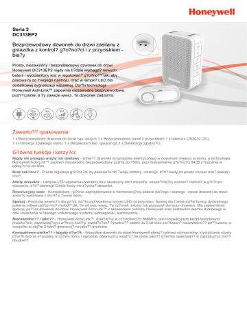 Seria 3 DC313EP2 Bezprzewodowy dzwonek do drzwi zasilany z gniazdka z kontrol? g?o?no?ci i z przyciskiem bia?y Prosty, niezawodny i bezproblemowy dzwonek do drzwi Honeywell DC313EP2 nigdy nie b?dzie wymaga? nowych baterii i wyposa?ony jest w regulowan? g?o?no?? tak, aby pasowa?a do Twojego nastroju, oraz w lampk? LED dla dodatkowej sygnalizacji wizualnej. Dzi?ki technologii Honeywell ActivLink™ zapewnia niezawodne bezprzewodowe pod??czenie, a Ty zawsze wiesz, ?e dzwonek zadzia?a. Zawarto?? opakowania: 1 x Bezprzewodowy dzwonek do drzwi typu plug-in,1 x Bezprzewodowy panel z przyciskiem,1 x bateria x CR2032 (3V), 1 x Instrukcja szybkiego startu, 1 x Bezpiecze?stwo i gwarancja,1 x Deklaracja zgodno?ci, G?ówne funkcje i korzy?ci: Nigdy nie przegap wizyty lub dostawy - Umie?? dzwonek do gniazdka elektrycznego w dowolnym miejscu w domu, a technologia Honeywell ActivLink™ zapewni niezawodny bezprzewodowy zasi?g do 150m, przy maksymalnej g?o?no?ci 84dB s?yszalnej w odleg?o?ci do 80m. Brak zak?óce? - Prosta regulacja g?o?no?ci, by pasowa?a do Twojej rodziny i nastroju, b?d? kiedy po prostu chcesz mie? spokój i cisz?. Alerty wizualne - Lampka LED zapewnia dyskretny lecz skuteczny alert wizualny, uzupe?niaj?cy wybran? melodi? w g?o?nym otoczeniu, b?d? alarmuje Ciebie kiedy nie s?ycha? dzwonka. Rewolucyjny wzór - Kompaktowe i pi?knie zaprojektowane w harmonizuj?cej palecie bia?ego i szarego - nasze dzwonki do drzwi zosta?y wykonane z my?l? o Twoim domu. Spokój - Poczucie pewno?ci dla go?ci, dzi?ki pod?wietleniu lampki LED na przycisku. Spokój dla Ciebie dzi?ki funkcji dyskretnego pukania odtwarzaj?cej inn? melodi? tak, ?e od razu wiesz, ?e cz?onek rodziny lub przyjaciel stoi przy drzwiach. Dla zapewnienia spokoju po??cz dzwonek do drzwi Honeywell ActivLink™ z akcesoriami ochrony Honeywell oraz zestawami alarmu domowego w celu utworzenia w?asnego unikatowego systemu ostrzegania i alarmowania. Niezawodno?? i jako?? - Honeywell ActivLink™, dzia?aj?cy w cz?stotliwo?ci 868MHz, jest innowacyjnym bezprzewodowym protoko?em, zapewniaj?cym wi?kszy zasi?g, przed?u?on? ?ywotno?? baterii do 5 lat oraz zwi?kszon? niezawodno?? po??czenia, a wszystko to obj?te 2-letni? gwarancj? na jako?? produktu. Kompaktowa wielko?? i bogaty d?wi?k - Wszystkie dzwonki do drzwi Honeywell oferuj? cyfrowo wzmocniony, krystalicznie czysty d?wi?k dobrze s?yszalny w ca?ym domu i ogrodzie, obejmuj?cy wiod?c? na rynku jako?? d?wi?ku opakowan? w zaskakuj?co ma?? obudow?! Specyfikacja: Bezprzewodowy dzwonek do drzwi typu plug-in Kolor bia?y Monta? na?cienny Nie Cz?stotliwo?? / Bezprzewodowy zasi?g* 868MHz / 150m Zakres s?yszalno?c9 (g?o?no??) 80m (84dB) Melodie 6 D?wi?k Sterowanie g?o?no?ci? / Wewn?trzna syrena Czas alarmu (min) 2 (Tryb wewn?trznej syreny) Alerty wizualne Wska?nik LED / Lampka LED Zasilanie Zasilanie z sieci: 100-240V 50-60Hz 300mA Maksymalna pojemno?? urz?dzenia 4 x Bezprzewodowy panel z przyciskiem/Bezprzewodowy czujnik ruchu/Bezprzewodowy czujnik na drzwi i okna Reset fabryczny Tak Temperatura robocza / przechowywania 0°C to +40°C/-20°C to +60°C Wymiary (mm) / Masa (g) 110 (h) x 70 (w) x 76.5 (d) / 154 (g) Bezprzewodowy panel z przyciskiem Kolor bia?y Monta? na?cienny Opcja Opcje monta?u bez ?rubokr?ta (na klej) Tak Cz?stotliwo?? / Bezprzewodowy zasi?g* 868MHz / 200m Alerty wizualne Lampka zaufania LED Zasilanie Bateria: 1 x CR2032 (3V) - (included) ?ywotno?? baterii (lata) 2 Funkcje baterii Wska?nik niskiego stanu baterii / ?atwo otwierana przegródka na baterie Wzór panelu z przyciskiem Panorama Tabliczka na wtyk Tak Rating IP IP55 Temperatura robocza / przechowywania -20°C to +50°C/-20°C to +60°C Wymiary (mm) / Masa (g) 30 (h) x 70 (w) x 16 (d) / 23.5 (g) Zamocowania Obejmy / Ko?ki rozporowe / ?ruby / Przylepce Pack Kod EAN / Standardowy kod EAN opakowania 5004100967909 / 5004100968043 Wymiary opakowania (mm) / Masa (g) 216 (h) x 150 (w) x 88 (d) / 370 (g) Standardowa ilo?? opakowa? 4 * Zasi?g mierzony na terenie otwartym; ?ciany, sufity i struktury metalowe mog? go ograniczy?. livewell.honeywell.com | © 2015 Honeywell International Inc.