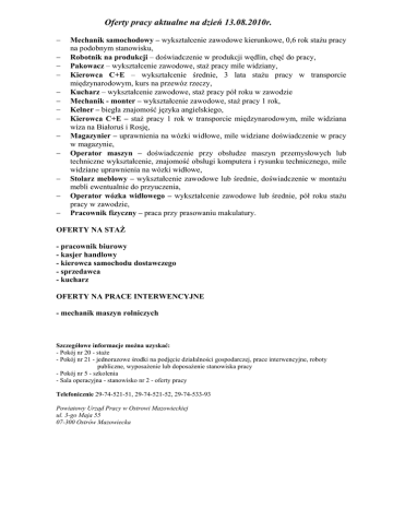 Oferty pracy aktualne na dzień 13.08.2010r. − − − − − − − − − − − − − Mechanik samochodowy – wykształcenie zawodowe kierunkowe, 0,6 rok stażu pracy na podobnym stanowisku, Robotnik na produkcji – doświadczenie w produkcji wędlin, chęć do pracy, Pakowacz – wykształcenie zawodowe, staż pracy mile widziany, Kierowca C+E – wykształcenie średnie, 3 lata stażu pracy w transporcie międzynarodowym, kurs na przewóz rzeczy, Kucharz – wykształcenie zawodowe, staż pracy pół roku w zawodzie Mechanik - monter – wykształcenie zawodowe, staż pracy 1 rok, Kelner – biegła znajomość języka angielskiego, Kierowca C+E – staż pracy 1 rok w transporcie międzynarodowym, mile widziana wiza na Białoruś i Rosję, Magazynier – uprawnienia na wózki widłowe, mile widziane doświadczenie w pracy w magazynie, Operator maszyn – doświadczenie przy obsłudze maszyn przemysłowych lub techniczne wykształcenie, znajomość obsługi komputera i rysunku technicznego, mile widziane uprawnienia na wózki widłowe, Stolarz meblowy – wykształcenie zawodowe lub średnie, doświadczenie w montażu mebli ewentualnie do przyuczenia, Operator wózka widłowego – wykształcenie zawodowe lub średnie, pół roku stażu pracy w zawodzie, Pracownik fizyczny – praca przy prasowaniu makulatury. OFERTY NA STAŻ - pracownik biurowy - kasjer handlowy - kierowca samochodu dostawczego - sprzedawca - kucharz OFERTY NA PRACE INTERWENCYJNE - mechanik maszyn rolniczych Szczegółowe informacje można uzyskać: - Pokój nr 20 - staże - Pokój nr 21 - jednorazowe środki na podjęcie działalności gospodarczej, prace interwencyjne, roboty publiczne, wyposażenie lub doposażenie stanowiska pracy - Pokój nr 5 - szkolenia - Sala operacyjna - stanowisko nr 2 - oferty pracy Telefonicznie 29-74-521-51, 29-74-521-52, 29-74-533-93 Powiatowy Urząd Pracy w Ostrowi Mazowieckiej ul. 3-go Maja 55 07-300 Ostrów Mazowiecka