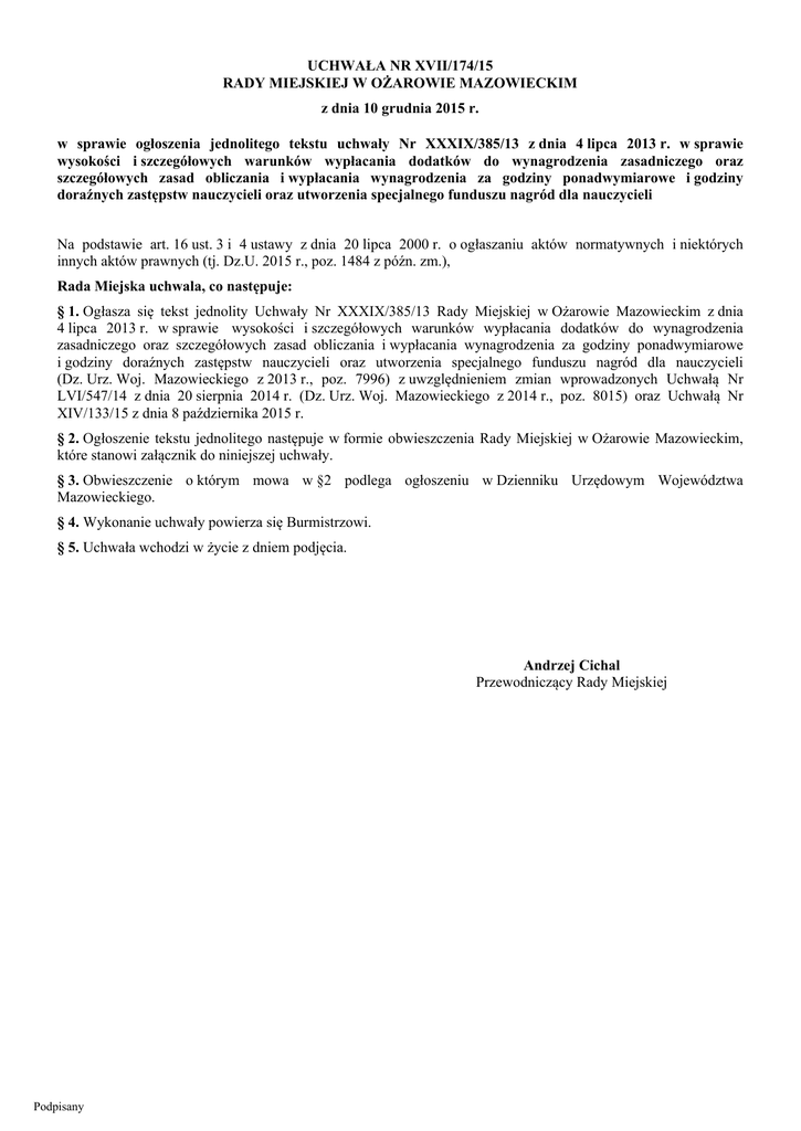 UCHWAŁA NR XVII/174/15 RADY MIEJSKIEJ W OŻAROWIE MAZOWIECKIM z dnia 10 grudnia 2015 r. w sprawie ogłoszenia jednolitego tekstu uchwały Nr XXXIX/385/13 z dnia 4 lipca 2013 r. w sprawie wysokości i szczegółowych warunków wypłacania dodatków do wynagrodzenia zasadniczego oraz szczegółowych zasad obliczania i wypłacania wynagrodzenia za godziny ponadwymiarowe i godziny doraźnych zastępstw nauczycieli oraz utworzenia specjalnego funduszu nagród dla nauczycieli Na podstawie art. 16 ust. 3 i 4 ustawy z dnia 20 lipca 2000 r. o ogłaszaniu aktów normatywnych i niektórych innych aktów prawnych (tj. Dz.U. 2015 r., poz. 1484 z późn. zm.), Rada Miejska uchwala, co następuje: § 1. Ogłasza się tekst jednolity Uchwały Nr XXXIX/385/13 Rady Miejskiej w Ożarowie Mazowieckim z dnia 4 lipca 2013 r. w sprawie wysokości i szczegółowych warunków wypłacania dodatków do wynagrodzenia zasadniczego oraz szczegółowych zasad obliczania i wypłacania wynagrodzenia za godziny ponadwymiarowe i godziny doraźnych zastępstw nauczycieli oraz utworzenia specjalnego funduszu nagród dla nauczycieli (Dz. Urz. Woj. Mazowieckiego z 2013 r., poz. 7996) z uwzględnieniem zmian wprowadzonych Uchwałą Nr LVI/547/14 z dnia 20 sierpnia 2014 r. (Dz. Urz. Woj. Mazowieckiego z 2014 r., poz. 8015) oraz Uchwałą Nr XIV/133/15 z dnia 8 października 2015 r. § 2. Ogłoszenie tekstu jednolitego następuje w formie obwieszczenia Rady Miejskiej w Ożarowie Mazowieckim, które stanowi załącznik do niniejszej uchwały. § 3. Obwieszczenie o którym mowa w §2 podlega ogłoszeniu w Dzienniku Urzędowym Województwa Mazowieckiego. § 4. Wykonanie uchwały powierza się Burmistrzowi. § 5. Uchwała wchodzi w życie z dniem podjęcia. Andrzej Cichal Przewodniczący Rady Miejskiej Podpisany Załącznik do Uchwały Nr XVII/174/15 Rady Miejskiej w Ożarowie Mazowieckim z dnia 10 grudnia 2015 r. OBWIESZCZENIE RADY MIEJSKIEJ W OŻAROWIE MAZOWIECKIM z dnia 10 grudnia 2015 r. w sprawie ogłoszenia jednolitego tekstu uchwały w sprawie wysokości i szczegółowych warunków wypłacania dodatków do wynagrodzenia zasadniczego oraz szczegółowych zasad obliczania i wypłacania wynagrodzenia za godziny ponadwymiarowe i godziny doraźnych zastępstw nauczycieli oraz utworzenia specjalnego funduszu nagród dla nauczycieli 1. Na podstawie art.16 ust.3 ustawy z dnia 20 lipca 2000 r. o ogłaszaniu aktów normatywnych i niektórych innych aktów prawnych (j.t. Dz.U. z 2011 r. Nr 197, poz.1172 z późń. zm.) ogłasza się w załączniku do niniejszego obwieszczenia jednolity tekst uchwały Nr XXXIX/385/13 Rady Miejskiej w Ożarowie Mazowieckim z 4 lipca 2013 r. w sprawie wysokości i szczegółowych warunków wypłacania dodatków do wynagrodzenia zasadniczego oraz szczegółowych zasad obliczania i wypłacania wynagrodzenia za godziny ponadwymiarowe i godziny doraźnych zastępstw nauczycieli oraz utworzenia specjalnego funduszu nagród dla nauczycieli (Dz. Urz. Woj. Maz. z 2013 r. poz. 7996), z uwzględnieniem zmian wprowadzonych: 1) uchwałą Nr LVI/547/14 Rady Miejskiej w Ożarowie Mazowieckim z 20 sierpnia 2014 r. o zmianie uchwały w sprawie wysokości i szczegółowych warunków wypłacania dodatków do wynagrodzenia zasadniczego oraz szczegółowych zasad obliczania i wypłacania wynagrodzenia za godziny ponadwymiarowe i godziny doraźnych zastępstw nauczycieli oraz utworzenia specjalnego funduszu nagród dla nauczycieli; 2) uchwałą Nr XIV/133/15 Rady Miejskiej w Ożarowie Mazowieckim z 8 października 2015 r. o zmianie uchwały w sprawie wysokości i szczegółowych warunków wypłacania dodatków do wynagrodzenia zasadniczego oraz szczegółowych zasad obliczania i wypłacania wynagrodzenia za godziny ponadwymiarowe i godziny doraźnych zastępstw nauczycieli oraz utworzenia specjalnego funduszu nagród dla nauczycieli. 2. Podany w załączniku do niniejszego obwieszczenia tekst jednolity uchwały nie obejmuje: 1) § 2 uchwały Nr LVI/547/14 Rady Miejskiej w Ożarowie Mazowieckim z 20 sierpnia 2014 r. o zmianie uchwały w sprawie wysokości i szczegółowych warunków wypłacania dodatków do wynagrodzenia zasadniczego oraz szczegółowych zasad obliczania i wypłacania wynagrodzenia za godziny ponadwymiarowe i godziny doraźnych zastępstw nauczycieli oraz utworzenia specjalnego funduszu nagród dla nauczycieli (Dz. Urz. Woj. Maz. z 2014 r. poz. 8015), który stanowi: „§ 2. Pozostałe zapisy Uchwały Nr XXXIX/385/13 Rady Miejskiej w Ożarowie Mazowieckim z dnia 4 lipca 2013 r. pozostają bez zmian.”; 2) § 3 uchwały Nr LVI/547/14 Rady Miejskiej w Ożarowie Mazowieckim z 20 sierpnia 2014 r. o zmianie uchwały w sprawie wysokości i szczegółowych warunków wypłacania dodatków do wynagrodzenia zasadniczego oraz szczegółowych zasad obliczania i wypłacania wynagrodzenia za godziny ponadwymiarowe i godziny doraźnych zastępstw nauczycieli oraz utworzenia specjalnego funduszu nagród dla nauczycieli (Dz. Urz. Woj. Maz. z 2014 r. poz. 8015), który stanowi: „§ 3. Wykonanie uchwały powierza się Burmistrzowi.”; 3) § 4 uchwały Nr LVI/547/14 Rady Miejskiej w Ożarowie Mazowieckim z 20 sierpnia 2014 r. o zmianie uchwały w sprawie wysokości i szczegółowych warunków wypłacania dodatków do wynagrodzenia zasadniczego oraz szczegółowych zasad obliczania i wypłacania wynagrodzenia za godziny ponadwymiarowe i godziny doraźnych zastępstw nauczycieli oraz utworzenia specjalnego funduszu nagród dla nauczycieli (Dz. Urz. Woj. Maz. z 2014 r. poz. 8015), który stanowi: Podpisany „§ 4. Uchwała wchodzi w życie po upływie 14 dni od dnia jej ogłoszenia w Dzienniku Urzędowym Województwa Mazowieckiego.”; 4) § 2 uchwały Nr XIV/133/15 Rady Miejskiej w Ożarowie Mazowieckim z 8 października 2015 r. o zmianie uchwały w sprawie wysokości i szczegółowych warunków wypłacania dodatków do wynagrodzenia zasadniczego oraz szczegółowych zasad obliczania i wypłacania wynagrodzenia za godziny pon