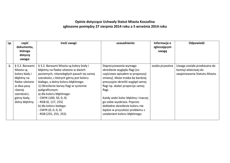 Opinie dotyczące Uchwały Statut Miasta Koszalina zgłoszone pomiędzy 27 sierpnia 2014 roku a 5 września 2014 roku Lp. część dokumentu, którego dotyczy uwaga: 1. § 3.2. Barwami Miasta są kolory biały i błękitny na fladze ułożone w dwa pasy równej szerokości, górny biały, dolny błękitny. treść uwagi: § 3.2. Barwami Miasta są kolory biały i błękitny na fladze ułożone w dwóch poziomych, równoległych pasach tej samej szerokości, z których górny jest koloru białego, a dolny koloru błękitnego. 1) Określenie barwy flagi w systemie poligraficznym: a) dla koloru błękitnego: - CMYK (100, 50, 0, 0) - RGB (0, 127, 255) b) dla koloru białego: - CMYK (0, 0, 0, 0) - RGB (255, 255, 255) uzasadnienie: Doprecyzowania wymaga określenie wyglądu flagi [co częściowo opisałem w propozycji zmiany]. Może trzeba by bardziej precyzyjne określić wygląd samej flagi np. dodać proporcje samej flagi. Każdy widzi kolor błękitny i inaczej go sobie wyobraża. Poprzez dokładne określenie koloru nie będzie w przyszłości problemu z ustaleniem koloru błękitnego. Informacja o zgłaszającym uwagę Odpowiedź: osoba prywatna Uwaga została przekazana do komisji właściwej do zaopiniowania Statutu Miasta.