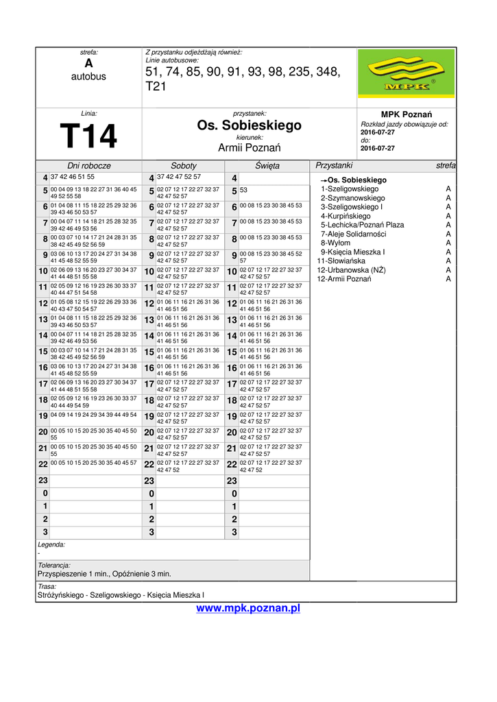 strefa: A autobus Z przystanku odjeżdżają również: Linie autobusowe: 51, 74, 85, 90, 91, 93, 98, 235, 348, T21 Linia: T14 Dni robocze 7 8 9 10 11 12 13 14 15 16 17 18 19 20 21 22 Armii Poznań Soboty 6 02 07 12 17 22 27 32 37 42 47 52 57 6 00 08 15 23 30 38 45 53 7 00 08 15 23 30 38 45 53 00 03 07 10 14 17 21 24 28 31 35 38 42 45 49 52 56 59 8 02 07 12 17 22 27 32 37 42 47 52 57 02 07 12 17 22 27 32 37 42 47 52 57 8 00 08 15 23 30 38 45 53 9 02 06 09 13 16 20 23 27 30 34 37 41 44 48 51 55 58 10 02 07 12 17 22 27 32 37 42 47 52 57 02 07 12 17 22 27 32 37 42 47 52 57 10 00 08 15 23 30 38 45 52 57 01 05 08 12 15 19 22 26 29 33 36 40 43 47 50 54 57 12 01 06 11 16 21 26 31 36 41 46 51 56 12 00 04 07 11 14 18 21 25 28 32 35 39 42 46 49 53 56 14 01 06 11 16 21 26 31 36 41 46 51 56 14 03 06 10 13 17 20 24 27 31 34 38 41 45 48 52 55 59 16 01 06 11 16 21 26 31 36 41 46 51 56 16 02 05 09 12 16 19 23 26 30 33 37 40 44 49 54 59 18 02 07 12 17 22 27 32 37 42 47 52 57 18 02 07 12 17 22 27 32 37 42 47 52 57 20 02 07 12 17 22 27 32 37 42 47 52 22 00 04 07 11 14 18 21 25 28 32 35 39 42 46 49 53 56 7 03 06 10 13 17 20 24 27 31 34 38 41 45 48 52 55 59 9 02 05 09 12 16 19 23 26 30 33 37 40 44 47 51 54 58 11 01 04 08 11 15 18 22 25 29 32 36 39 43 46 50 53 57 13 00 03 07 10 14 17 21 24 28 31 35 38 42 45 49 52 56 59 15 02 06 09 13 16 20 23 27 30 34 37 41 44 48 51 55 58 17 04 09 14 19 24 29 34 39 44 49 54 19 00 05 10 15 20 25 30 35 40 45 50 55 20 00 05 10 15 20 25 30 35 40 45 57 22 00 05 10 15 20 25 30 35 40 45 50 55 23 0 1 2 3 21 23 0 1 2 3 02 07 12 17 22 27 32 37 42 47 52 57 4 5 Święta 01 04 08 11 15 18 22 25 29 32 36 39 43 46 50 53 57 5 00 04 09 13 18 22 27 31 36 40 45 49 52 55 58 Rozkład jazdy obowiązuje od: 2016-07-27 do: 2016-07-27 kierunek: 4 5 4 6 Os. Sobieskiego 37 42 47 52 57 37 42 46 51 55 MPK Poznań przystanek: 02 07 12 17 22 27 32 37 42 47 52 57 11 01 06 11 16 21 26 31 36 41 46 51 56 13 01 06 11 16 21 26 31 36 41 46 51 56 15 02 07 12 17 22 27 32 37 42 47 52 57 17 02 07 12 17 22 27 32 37 42 47 52 57 19 02 07 12 17 22 27 32 37 42 47 52 57 21 23 0 1 2 3 53 02 07 12 17 22 27 32 37 42 47 52 57 02 07 12 17 22 27 32 37 42 47 52 57 01 06 11 16 21 26 31 36 41 46 51 56 01 06 11 16 21 26 31 36 41 46 51 56 01 06 11 16 21 26 31 36 41 46 51 56 01 06 11 16 21 26 31 36 41 46 51 56 01 06 11 16 21 26 31 36 41 46 51 56 02 07 12 17 22 27 32 37 42 47 52 57 02 07 12 17 22 27 32 37 42 47 52 57 02 07 12 17 22 27 32 37 42 47 52 57 02 07 12 17 22 27 32 37 42 47 52 57 02 07 12 17 22 27 32 37 42 47 52 57 02 07 12 17 22 27 32 37 42 47 52 Legenda: - Tolerancja: Przyspieszenie 1 min., Opóźnienie 3 min. Trasa: Stróżyńskiego - Szeligowskiego - Księcia Mieszka I www.mpk.poznan.pl Przystanki →Os. Sobieskiego 1-Szeligowskiego 2-Szymanowskiego 3-Szeligowskiego I 4-Kurpińskiego 5-Lechicka/Poznań Plaza 7-Aleje Solidarności 8-Wyłom 9-Księcia Mieszka I 11-Słowiańska 12-Urbanowska (NŻ) 12-Armii Poznań strefa A A A A A A A A A A A