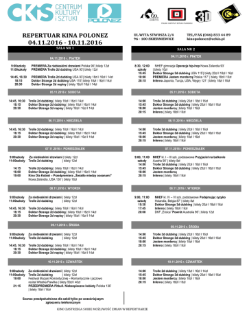 REPERTUAR KINA POLONEZ 04.11.2016 - 10.11.2016 UL.WITA STWOSZA 2/4 96 - 100 SKIERNIEWICE SALA NR 1 SALA NR 2 04.11.2016 r. PIĄTEK 04.11.2016 r. PIĄTEK 9:00szkoły 11:00szkoły PREMIERA Za niebieskimi drzwiami Polska 90’| bilety 12zł PREMIERA Trolle 2d dubbing USA 93’| bilety 12zł 14:45, 16:30 18:15 20:30 PREMIERA Trolle 2d dubbing USA 93’| bilety 18zł I 16zł I 14zł Doktor Strange 2d dubbing USA 115’| bilety 18zł I 16zł I 14zł Doktor Strange 2d napisy | bilety 18zł I 16zł I 14zł 8:30, 12:00 szkoły 15:45 18:00 20:15 05.11.2016 r. SOBOTA 14:45, 16:30 Trolle 2d dubbing | bilety 18zł I 16zł I 14zł 18:15 Doktor Strange 2d dubbing | bilety 18zł I 16zł I 14zł 20:30 Doktor Strange 2d napisy | bilety 18zł I 16zł I 14zł 14:00 15:45 18:00 20:15 14:15 16:00 19:00 Trolle 2d dubbing | bilety 18zł I 16zł I 14zł Doktor Strange 2d dubbing | bilety 18zł I 16zł I 14zł Kino Dla Kobiet – Przedpremiera „Światło miedzy oceanami” Nowa Zelandia, USA 130’ | bilety 18zł 14:00 15:45 18:00 20:15 14:45, 16:30 Trolle 2d dubbing | bilety 18zł I 16zł I 14zł 18:15 Doktor Strange 2d dubbing | bilety 18zł I 16zł I 14zł 20:30 Doktor Strange 2d napisy | bilety 18zł I 16zł I 14zł 9:00, 11:00 szkoły 14:00 15:45 18:00 20:15 14:45, 16:30 Trolle 2d dubbing | bilety 18zł I 16zł I 14zł 18:15 Doktor Strange 2d dubbing | bilety 18zł I 16zł I 14zł 20:30 Doktor Strange 2d napisy | bilety 18zł I 16zł I 14zł 9:00, 11:00 szkoły 15:30 17:45 20:00 NHEF kl. IV – VI szk. podstawowe Podejmując ryzyko Holandia, Belgia 87’ | bilety 8zł Doktor Strange 3d dubbing | bilety 20zł I 18zł I 16zł Inferno | bilety 18zł I 16zł DKF „Eroica” Powrót Australia 96’ | bilety 12zł 09.11.2016 r. ŚRODA 14:00 15:45 18:00 20:15 10.11.2016 r. CZWARTEK 9:00szkoły Za niebieskimi drzwiami | bilety 12zł 11:00szkoły Trolle 2d dubbing | bilety 12zł 19:00 Festiwal Muzyki Romantycznej – Romantycznie i jazzowo recital Włodka Pawlika | bilety 50zł I 40zł 21:15 PRZEDPREMIERA Pitbull. Niebezpieczne kobiety Polska 136’ | bilety 18zł I 16zł NHEF kl. I – III szk. podstawowe Przyjaciel na balkonie Austria 90’ | bilety 8zł Trolle 3d dubbing | bilety 20zł I 18zł I 16zł Doktor Strange 3d dubbing | bilety 20zł I 18zł I 16zł Jestem mordercą Inferno | bilety 18zł I 16zł 08.11.2016 r. WTOREK 09.11.2016 r. ŚRODA 9:00szkoły Za niebieskimi drzwiami | bilety 12zł 11:00szkoły Trolle 2d dubbing | bilety 12zł Trolle 3d dubbing | bilety 20zł I 18zł I 16zł Doktor Strange 3d dubbing | bilety 20zł I 18zł I 16zł Jestem mordercą | bilety 18zł I 16zł Inferno | bilety 18zł I 16zł 07.11.2016 r. PONIEDZIAŁEK 08.11.2016 r. WTOREK 9:00szkoły Za niebieskimi drzwiami | bilety 12zł 11:00szkoły Trolle 2d dubbing | bilety 12zł Trolle 3d dubbing | bilety 20zł I 18zł I 16zł Doktor Strange 3d dubbing | bilety 20zł I 18zł I 16zł Jestem mordercą | bilety 18zł I 16zł Inferno | bilety 18zł I 16zł 06.11.2016 r. NIEDZIELA 07.11.2016 r. PONIEDZIAŁEK 9:00szkoły Za niebieskimi drzwiami | bilety 12zł 11:00szkoły Trolle 2d dubbing | bilety 12zł NHEF gimnazja Operacja hip-hop Nowa Zelandia 93’ | bilety 10zł Doktor Strange 3d dubbing USA 115’| bilety 20zł I 18zł I 16zł PREMIERA Jestem mordercą Polska 117’ | bilety 18zł I 16zł Inferno Japonia, Turcja, USA, Węgry 121’ | bilety 18zł I 16zł 05.11.2016 r. SOBOTA 06.11.2016 r. NIEDZIELA 14:45, 16:30 Trolle 2d dubbing | bilety 18zł I 16zł I 14zł 18:15 Doktor Strange 2d dubbing | bilety 18zł I 16zł I 14zł 20:30 Doktor Strange 2d napisy | bilety 18zł I 16zł I 14zł TEL/FAX (046) 833 44 89 [email protected] Trolle 3d dubbing | bilety 20zł I 18zł I 16zł Doktor Strange 3d dubbing | bilety 20zł I 18zł I 16zł Jestem mordercą | bilety 18zł I 16zł Inferno | bilety 18zł I 16zł 10.11.2016 r. CZWARTEK 14:00 15:45 18:00 20:15 Seanse przedpołudniowe dla szkół tylko po wcześniejszym zgłoszeniu telefonicznym KINO ZASTRZEGA SOBIE MOŻLIWOŚĆ ZMIAN W REPERTUARZE Trolle 2d dubbing | bilety 18zł I 16zł I 14zł Doktor Strange 3d dubbing | bilety 20zł I 18zł I 16zł Jestem mordercą | bilety 18zł I 16zł Inferno | bilety 18zł I 16zł