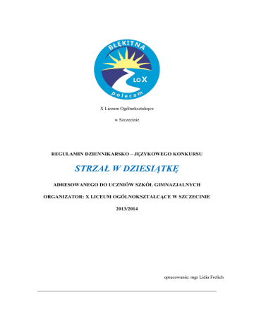 X Liceum Ogólnokształcące w Szczecinie REGULAMIN DZIENNIKARSKO – JĘZYKOWEGO KONKURSU STRZAŁ W DZIESIĄTKĘ ADRESOWANEGO DO UCZNIÓW SZKÓŁ GIMNAZJALNYCH ORGANIZATOR: X LICEUM OGÓLNOKSZTAŁCĄCE W SZCZECINIE 2013/2014 opracowanie: mgr Lidia Frelich ______________________________________________________________________ REGULAMIN DRUGIEGO DZIENNIKARSKO – JĘZYKOWEGO KONKURSU DLA UCZNIÓW SZKÓŁ GIMNAZJALNYCH STRZAŁ W DZIESIĄTKĘ ORGANIZOWANEGO PRZEZ X LICEUM OGÓLNOKSZTAŁCĄCE W SZCZECINIE Celem konkursu adresowanego do uczniów szkół gimnazjalnych, jest promowanie wśród szczecińskiej młodzieży zawodu dziennikarza, rozbudzanie zainteresowań Miastem Szczecin oraz regionem, odkrywanie jego potencjału i rozwój kreatywności młodzieży, przy równoczesnym doskonaleniu sztuki słowa pisanego oraz poprawności językowej. Uczestnictwo w konkursie wymaga od zainteresowanych kreatywności, aktywności twórczej, wiedzy o regionie dostarczanej przez lokalne media oraz umiejętności językowych koniecznych w zawodzie dziennikarza. Jest to więc konkurs, dla każdego gimnazjalisty – nawet jeśli nie jest prymusem. Konkurs przeprowadzony zostanie w dwóch etapach – pisemnym (wstępnym) i ustnym (finałowym). Część pisemna sprawdzać będzie wiedzę i umiejętności uczestników w następujących obszarach: 1. tworzenie krótkiej formy dziennikarskiej na zadany temat (temat związany będzie z Miastem Szczecin, a jego przeznaczeniem miałoby być zamieszczenie artykułu w prasie lub w Internecie), 2. umiejętność posługiwania się poprawną polszczyzną (praktyczny test z zakresu wiedzy o języku, polegający na korygowaniu różnego rodzaju błędów językowych), 3. wiedza o Szczecinie i regionie zaczerpnięta z lokalnych mediów (z wykorzystaniem wiedzy i umiejętności z przedmiotu wiedza o społeczeństwie nauczanego w szkołach gimnazjalnych). Część pisemna pozwoli wyłonić 10 uczestników z najlepszymi wynikami, którzy w części Zgodnie z Ustawą o prawie autorskim i prawach pokrewnych z dnia 4 lutego 1994 r. (Dz.U. 1994 nr 24 poz. 83) wraz z nowelizacją z dnia 25 lipca 2003 r. (Dz.U. 2003 nr 166 poz. 1610) oraz z dnia 1 kwietnia 2004 r. (Dz.U. 2004 nr 91 poz. 869) z późniejszymi zmianami projekt podlega ochronie prawnej. Strona2 ustnej powinni wykazać się: 1. umiejętnością posługiwania się słowem na potrzeby wywiadu, relacji lub sprawozdań dziennikarskich (przygotowanie krótkiego wystąpienia), 2. umiejętnościami określonymi w podstawie programowej nauczania wiedzy o społeczeństwie w szkołach gimnazjalnych ze szczególnym naciskiem na odniesienie ich do Miasta Szczecin. Adres, na który należy nadsyłać zgłoszenia (druk w załączeniu): X LICEUM OGÓLNOKSTAŁCĄCE ul. Orawska 1 70-023 Szczecin tel./fax: 91 482 00 78 lub: [email protected] Zgodnie z Ustawą o prawie autorskim i prawach pokrewnych z dnia 4 lutego 1994 r. (Dz.U. 1994 nr 24 poz. 83) wraz z nowelizacją z dnia 25 lipca 2003 r. (Dz.U. 2003 nr 166 poz. 1610) oraz z dnia 1 kwietnia 2004 r. (Dz.U. 2004 nr 91 poz. 869) z późniejszymi zmianami projekt podlega ochronie prawnej. Strona3 z dopiskiem konkurs STRZAŁ W DZIESIĄTKĘ REGULAMIN KONKURSU § 1. Temat: Drugi dziennikarsko – językowy konkurs dla uczniów szkół gimnazjalnych. § 2. Adresat: Uczniowie szkół gimnazjalnych. Koordynator: Lidia Frelich – nauczycielka języka polskiego. § 3. Cele konkursu: 1. Rozbudzenie u uczestników zainteresowania Miastem Szczecin i regionem. 2. Motywowanie młodzieży do odkrywania potencjału Miasta Szczecin. 3. Stwarzanie sytuacji do śledzenia bieżących wydarzeń w Szczecinie i w okolicy. 4. Wspieranie określania tożsamości obywatelskiej uczniów. 5. Kształtowanie świadomości lokalnej młodego pokolenia. 6. Rozwijanie zainteresowań i kompetencji językowych. 7. Doskonalenie warsztatu dziennikarsko – językowego. 8. Formułowanie własnych opinii. 9. Gromadzenie informacji przy wykorzystaniu nowoczesnych technologii i różnorodnych źródeł informacji. 10. Wzbudzanie poczucia wartości i znaczenia dziedzictwa regionalnego i odpowiedzialności za jego trwałość. 11. Gromadzenie i wykorzystywanie informacji potrzebnych do zaplanowania dalszej nauki i kariery zawodowej. 12. Rozpoznawanie i rozwiązywanie problemów społecznych, politycznych, gospodarczych. 13. Charakteryzowanie sposobu i zakresu działania organów władzy Miasta Szczecin. 14. Rozwijanie świadomej postawy obywatelskiej oraz przygotowanie do aktywnego udziału Zgodnie z Ustawą o prawie autorskim i prawach pokrewnych z dnia 4 lutego 1994 r. (Dz.U. 1994 nr 24 poz. 83) wraz z nowelizacją z dnia 25 lipca 2003 r. (Dz.U. 2003 nr 166 poz. 1610) oraz z dnia 1 kwietnia 2004 r. (Dz.U. 2004 nr 91 poz. 869) z późniejszymi zmianami projekt podlega ochronie prawnej. Strona4 w życiu społeczno-politycznym i kulturalnym. § 4. Zasady konkursu: 1. Uczestnicy konkursu przystępują do części pisemnej na zasadach określonych przez organizatora. 2. Wszyscy uczniowie otrzymają ten sam zestaw poleceń, na który składa się: a) tworzenie krótkiej formy wypowiedzi dziennikarskiej na zadany temat związany z Miastem Szczecin, b) praktyczny test z zakresu wiedzy o języku, polegający na korygowaniu różnego rodzaju błędów językowych, c) test wiedzy o Szczecinie i regionie zaczerpniętej z lokalnych mediów (z wykorzystaniem wiedzy i umiejętności z przedmiotu wiedza o społeczeństwie nauczanego w szkołach gimnazjalnych). 3. Praca pisemna uczniów będzie sprawdzana i oceniana wg klucza opracowanego i dostępnego organizatorowi. 4. Wykluczona jest praca w grupie lub jakiegokolwiek rodzaju niesamodzielność pracy w obu etapach konkursowych. 5. Dziesięcioro uczniów z najwyższymi wynikami z I etapu przechodzi do części finałowej. 6. Finał STRZAŁU W DZIESIĄTKĘ przeprowadzony zostanie w formie ustnej. 7. Uczestnik losuje zestaw poleceń i pytań, na który składa się: a) przygotowanie krótkiej