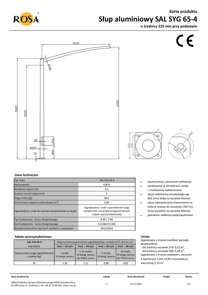Karta produktu Słup aluminiowy SAL SYG 65-4 o średnicy 225 mm przy podstawie Dane techniczne Typ słupa SAL SYG 65-4 Kod produktu powierzchnia: aluminium szlifowane anodowanie w 10 kolorach, każdy z możliwością wybłyszczania opcja malowania proszkowego wg RAL (inne farby na życzenie klienta) opcja zabezpieczenia elastomerem w kolorze masztu do wysokości 350 mm (inna wysokośd na życzenie klienta) pakownie: włóknina polipropylenowa 42810 Wysokośd słupa H *m+ 6,5 Grubośd ścianki słupa *mm+ 5 Waga netto [kg] 90,2 3 Orientacyjna objętośd jednostkowa *m ] 0,84 Sygnalizatory i znaki do montażu bezpośrednio na słupie Sygnalizatory i znaki o parametrach wagi i powierzchni nie przekraczających danych z tabeli wytrzymałościowej Typ fundamentu - kosza zbrojeniowego B-80 / Z-80 Kod fundamentu - kosza zbrojeniowego 311180/311208 Komplet elementów złącznych zwykłych / zrywalnych 4012/4014 Tabele wytrzymałościowe SAL SYG 65-4 kod 42810 Dopuszczalna powierzchnia sygnalizatorów i znaków *m2] dla Cx=1,2 Vref. = 22 m/s Vref. = 24 m/s Vref. = 26 m/s Dopuszczalna waga sygnalizatorów I strefa, i znaków *kg+ III kateg. terenu I i III strefa, III kateg. terenu do 450m n.p.m. III strefa, II strefa, III kateg. terenu III kateg. terenu do 755m n.p.m. 30 1,26 Dane producenta Zakład Produkcji Sprzętu Oświetleniowego ROSA Stanisław Rosa 43-109 Tychy, ul. Strefowa 1, tel. +48 32 73 88 901, www.rosa.pl 1,11 0,88 Vref. = 28 m/s 0,82 Uwaga: Sygnalizator z trzema światłami posiada powierzchnię: - dla średnicy soczewki 210: 0,22 m2, - dla średnicy soczewki 300: 0,39 m2. Sygnalizator z trzema światłami z ekranem o wymiarach 1,4m x 0,85 m posiada powierzchnię 1,19 m2. Edycja Data aktualizacji 4 25.11.2014 Podpis Strona 1/1