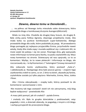 Natalia Stasińska Szkoła Podstawowa nr 11 02-495 Warszawa ul. Keniga 20 opiekun: Magdalena Kwiatkowska Dawno, dawno temu w Danolandii… … na północ od Nowego Jorku mieszkała sobie dziewczyna, która prowadziła bloga o komiksowej drużynie Avengers(Mścicieli) Miała na imię Alia. Chodziła do drugiej klasy liceum, do drugiej B. Była córką pana Feliksa Agresta, sławnego projektanta mody. Alia miała bzika na punkcie komiksowych super-bohaterów, dlatego prowadziła bloga dla osób, które podzielały jej pasję. W prowadzeniu bloga pomagała jej najlepsza przyjaciółka Emma, przychodziła nawet wtedy, kiedy Alia miała ospę i musiała wykłócać się z rodzicami Alii, że może wejść do pokoju i się nie zarazi. Pewnego dnia, gdy wpisywały nowe informacje na temat pana Starka, na pasku wyświetliło się: Masz nowy komentarz na stronie. Dziewczyny od razu spojrzały, co to za komentarz. Myśląc, że to nowe ploteczki i informacje na bloga, ale rozczarowały się – to był komentarz z” hateingiem”(mową nienawiści)! Alia zobaczyła konto użytkownika, który postawił „hate-a”, i zablokowała je. Następnego dnia było jeszcze gorzej – znajomi tego użytkownika zrobili to samo, co on. Z dnia na dzień, ubywało jej fanów, czytelników zostało już tylko pięcioro: Marinette, Emma, Nino, Juleka i Rose. Alia i Emma zdecydowały – znajdą ludzi, którzy postawili te złe komentarze i porozmawiać z nimi. -Nie możemy tak tego zostawić! Jeżeli ich nie zatrzymamy, mój blog będzie wyłączony! - powiedziała Alia -A masz jakiś pomysł, jak ich znaleźć? - pytała Emma. I znalazły ich. Była to grupka dzieciaków z podstawówki, więc pogadały z nimi, a dzieciaki obiecały, że pogadają z innymi o ich blogu i zachęcą przyjaciół do przeczytania bloga.