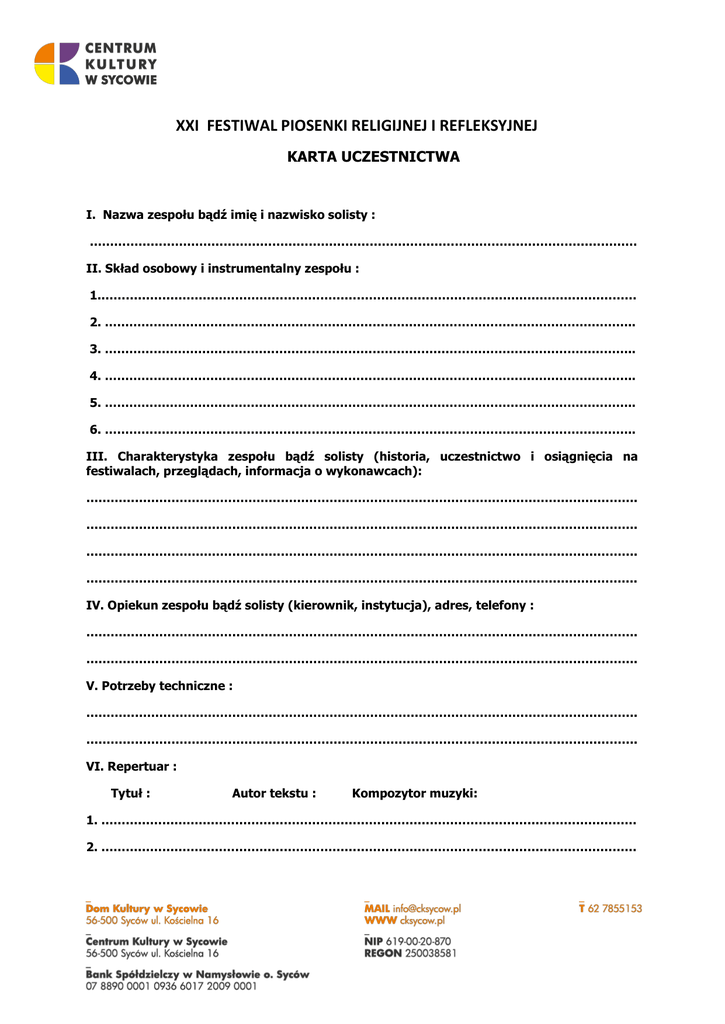 XXI FESTIWAL PIOSENKI RELIGIJNEJ I REFLEKSYJNEJ KARTA UCZESTNICTWA I. Nazwa zespołu bądź imię i nazwisko solisty : ……………………………………………………………………………………………………………………… II. Skład osobowy i instrumentalny zespołu : 1.…………………………………………………………………………………………………………………… 2. ………………………………………………………………………………………………………………….. 3. ………………………………………………………………………………………………………………….. 4. ………………………………………………………………………………………………………………….. 5. ………………………………………………………………………………………………………………….. 6. ………………………………………………………………………………………………………………….. III. Charakterystyka zespołu bądź solisty (historia, uczestnictwo i osiągnięcia na festiwalach, przeglądach, informacja o wykonawcach): ………………………………………………………………………………………………………………………. ………………………………………………………………………………………………………………………. ………………………………………………………………………………………………………………………. ………………………………………………………………………………………………………………………. IV. Opiekun zespołu bądź solisty (kierownik, instytucja), adres, telefony : ………………………………………………………………………………………………………………………. ………………………………………………………………………………………………………………………. V. Potrzeby techniczne : ………………………………………………………………………………………………………………………. ………………………………………………………………………………………………………………………. VI. Repertuar : Tytuł : Autor tekstu : Kompozytor muzyki: 1. …………………………………………………………………………………………………………………… 2. ……………………………………………………………………………………………………………………