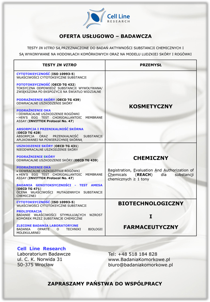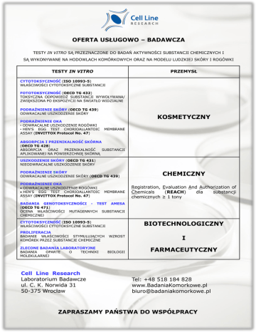 OFERTA USŁUGOWO – BADAWCZA TESTY IN VITRO SĄ PRZEZNACZONE DO BADAŃ AKTYWNOŚCI SUBSTANCJI CHEMICZNYCH I SĄ WYKONYWANE NA HODOWLACH KOMÓRKOWYCH ORAZ NA MODELU LUDZKIEJ SKÓRY I ROGÓWKI TESTY IN VITRO PRZEMYSŁ CYTOTOKSYCZNOŚĆ (ISO 10993-5) WŁAŚCIWOŚCI CYTOTOKSYCZNE SUBSTANCJI FOTOTOKSYCZNOŚĆ (OECD TG 432) TOKSYCZNA ODPOWIEDŹ SUBSTANCJI WYWOŁYWANA/ ZWIĘKSZONA PO EKSPOZYCJI NA ŚWIATŁO WIDZIALNE PODRAŻNIENIE SKÓRY (OECD TG 439) ODWRACALNE USZKODZENIE SKÓRY PODRAŻNIENIE OKA • ODWRACALNE USZKODZENIE ROGÓWKI • HEN'S EGG TEST CHORIOALLANTOIC ASSAY (INVITTOX Protocol No. 47) KOSMETYCZNY MEMBRANE ABSORPCJA I PRZENIKALNOŚĆ SKÓRNA (OECD TG 428) ABSORPCJA ORAZ PRZENIKALNOŚĆ SUBSTANCJI APLIKOWANEJ NA POWIERZCHNIĘ SKÓRNĄ USZKODZENIE SKÓRY (OECD TG 431) NIEODWRACALNE USZKODZENIE SKÓRY PODRAŻNIENIE SKÓRY ODWRACALNE USZKODZENIE SKÓRY (OECD TG 439) PODRAŻNIENIE OKA ODWRACALNE USZKODZENIE ROGÓWKI HEN'S EGG TEST CHORIOALLANTOIC ASSAY (INVITTOX Protocol No. 47) MEMBRANE CHEMICZNY Registration, Evaluation And Authorization of Chemicals (REACH) dla substancji chemicznych ≥ 1 tony BADANIA GENOTOKSYCZNOŚCI - TEST AMESA (OECD TG 471) OCENA WŁAŚCIWOŚCI MUTAGENNYCH SUBSTANCJI CHEMICZNEJ BIOTECHNOLOGICZNY CYTOTOKSYCZNOŚĆ (ISO 10993-5) WŁAŚCIWOŚCI CYTOTOKSYCZNE SUBSTANCJI PROLIFERACJA BADANIE WŁAŚCIWOŚCI STYMULUJĄCYCH KOMÓREK PRZEZ SUBSTANCJE CHEMICZNE ZLECONE BADANIA LABORATORYJNE BADANIA OPARTE O TECHNIKI MOLEKULARNEJ Cell Line Research Laboratorium Badawcze ul. C. K. Norwida 31 50-375 Wrocław WZROST BIOLOGII I FARMACEUTYCZNY Tel: +48 518 184 828 www.BadaniaKomorkowe.pl [email protected] ZAPRASZAMY PAŃSTWA DO WSPÓŁPRACY
