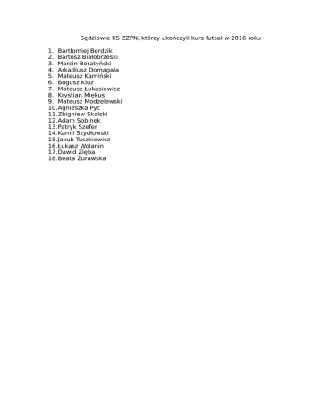 Sędziowie KS ZZPN, którzy ukończyli kurs futsal w 2016 roku 1. Bartłomiej Berdzik 2. Bartosz Białobrzeski 3. Marcin Boratyński 4. Arkadiusz Domagała 5. Mateusz Kamiński 6. Bogusz Kluz 7. Mateusz Łukasiewicz 8. Krystian Miękus 9. Mateusz Modzelewski 10.Agnieszka Pyć 11.Zbigniew Skalski 12.Adam Sobinek 13.Patryk Szefer 14.Kamil Szydłowski 15.Jakub Tuszkiewicz 16.Łukasz Wolanin 17.Dawid Zięba 18.Beata Żurawska