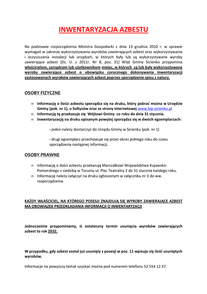 INWENTARYZACJA AZBESTU Na podstawie rozporządzenia Ministra Gospodarki z dnia 13 grudnia 2010 r. w sprawie wymagań w zakresie wykorzystywania wyrobów zawierających azbest oraz wykorzystywania i oczyszczania instalacji lub urządzeń, w których były lub są wykorzystywane wyroby zawierające azbest (Dz. U. z 2011r. Nr 8, poz. 31) Wójt Gminy Sicienko przypomina właścicielom, zarządcom lub użytkownikom miejsc, w których są lub były wykorzystywane wyroby zawierające azbest o obowiązku corocznego dokonywania inwentaryzacji zastosowanych wyrobów zawierających azbest poprzez sporządzenie spisu z natury. OSOBY FIZYCZNE • • • Informację o ilości azbestu sporządza się na druku, który pobrać można w Urzędzie Gminy (pok. nr 1), u Sołtysów oraz ze strony internetowej www.bip.sicienko.pl Informację tę przekazuje się Wójtowi Gminy co roku do dnia 31 stycznia. Inwentaryzację na druku opisanym powyżej sporządza się w dwóch egzemplarzach: - jeden należy dostarczyć do Urzędu Gminy w Sicienku (pok. nr 1) - drugi egzemplarz przechowuje się przez okres jednego roku do czasu sporządzenia następnej informacji. OSOBY PRAWNE • • Informację o ilości azbestu przekazują Marszałkowi Województwa KujawskoPomorskiego z siedzibą w Toruniu ul. Plac Teatralny 2 do 31 stycznia każdego roku. Informację należy załączyć na druku ogłoszonym w załączniku nr 3 do ww. rozporządzenia. KAŻDY WŁAŚCICIEL, NA KTÓREGO POSESJI ZNAJDUJĄ SIĘ WYROBY ZAWIERAJĄCE AZBEST MA OBOWIĄZEK PRZEDKŁADANIA INFORMACJI O INWENTARYZACJI Jednocześnie przypominamy, iż ostateczny termin usunięcia wyrobów zawierających azbest to rok 2032. W przypadku, gdy azbest został już usunięty z posesji w poz. 11 wpisuje się ilość usuniętych wyrobów. Informacje na powyższy temat uzyskać można pod numerem telefonu 52 554 12 37.