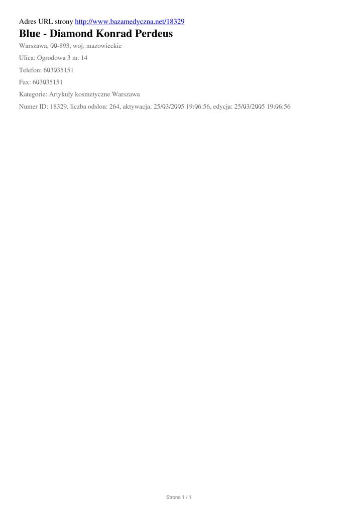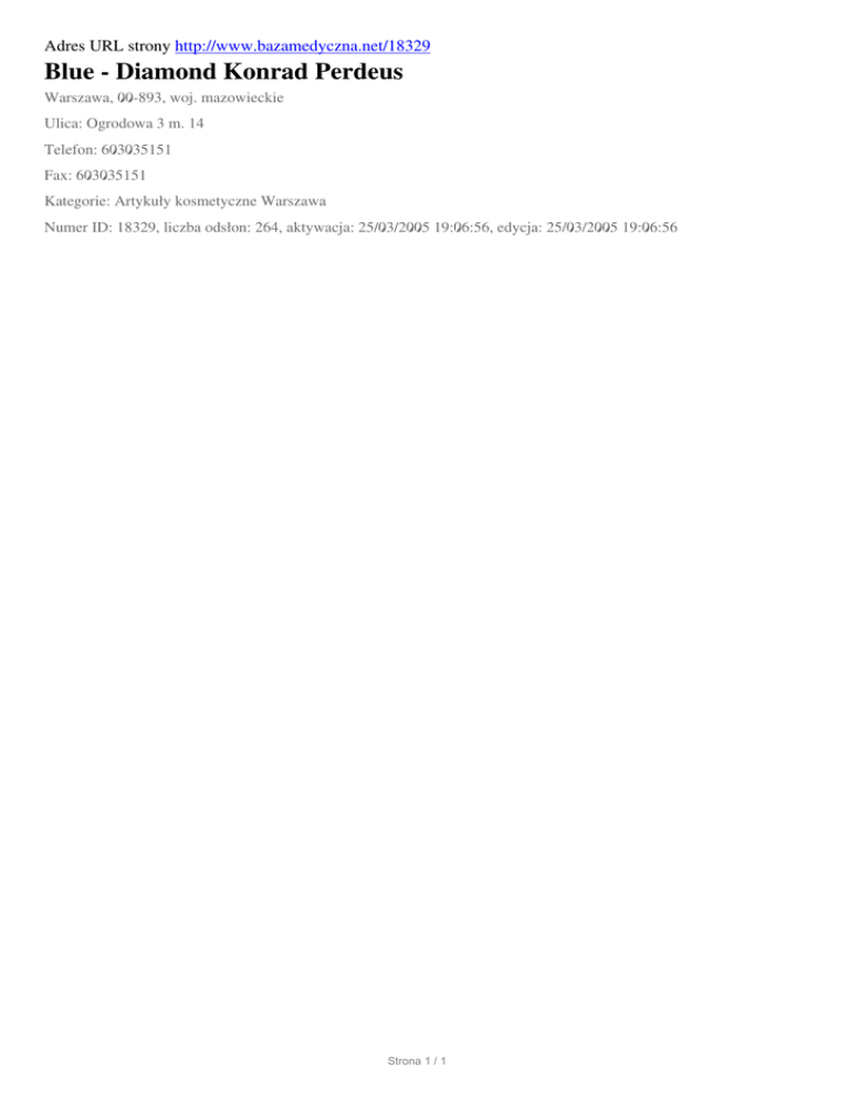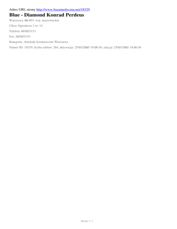 Adres URL strony http://www.bazamedyczna.net/18329 Blue - Diamond Konrad Perdeus Warszawa, 00-893, woj. mazowieckie Ulica: Ogrodowa 3 m. 14 Telefon: 603035151 Fax: 603035151 Kategorie: Artykuły kosmetyczne Warszawa Numer ID: 18329, liczba odsłon: 264, aktywacja: 25/03/2005 19:06:56, edycja: 25/03/2005 19:06:56 Strona 1 / 1