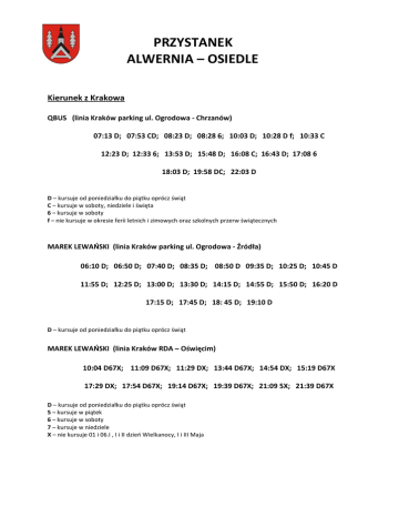 PRZYSTANEK ALWERNIA – OSIEDLE Kierunek z Krakowa QBUS (linia Kraków parking ul. Ogrodowa - Chrzanów) 07:13 D; 07:53 CD; 08:23 D; 08:28 6; 10:03 D; 10:28 D f; 10:33 C 12:23 D; 12:33 6; 13:53 D; 15:48 D; 16:08 C; 16:43 D; 17:08 6 18:03 D; 19:58 DC; 22:03 D D – kursuje od poniedziałku do piątku oprócz świąt C – kursuje w soboty, niedziele i święta 6 – kursuje w soboty f – nie kursuje w okresie ferii letnich i zimowych oraz szkolnych przerw świątecznych MAREK LEWAŃSKI (linia Kraków parking ul. Ogrodowa - Źródła) 06:10 D; 06:50 D; 07:40 D; 08:35 D; 08:50 D 09:35 D; 10:25 D; 10:45 D 11:55 D; 12:25 D; 13:00 D; 13:30 D; 14:15 D; 14:55 D; 15:50 D; 16:20 D 17:15 D; 17:45 D; 18: 45 D; 19:10 D D – kursuje od poniedziałku do piątku oprócz świąt MAREK LEWAŃSKI (linia Kraków RDA – Oświęcim) 10:04 D67X; 11:09 D67X; 11:29 DX; 13:44 D67X; 14:54 DX; 15:19 D67X 17:29 DX; 17:54 D67X; 19:14 D67X; 19:39 D67X; 21:09 5X; 21:39 D67X D – kursuje od poniedziałku do piątku oprócz świąt 5 – kursuje w piątek 6 – kursuje w soboty 7 – kursuje w niedziele X – nie kursuje 01 i 06.I , I i II dzień Wielkanocy, I i III Maja PRZYSTANEK ALWERNIA – OSIEDLE PRZEWÓZ OSÓB JAROSŁAW SPISAK (linia Kraków RDA – Oświęcim) 08:34 D6X; 09:14 D67X; 12:14 D6X; 12:34 D67X; 13:09 D67X; 16:24 D67X 16:44 D6X; 17:14 D67X; 20:14 D67X D – kursuje od poniedziałku do piątku oprócz świąt 6 – kursuje w soboty 7 – kursuje w niedziele X – nie kursuje 01 i 06.I , I i II dzień Wielkanocy, I i III Maja, Boże Ciało, 15 VIII, 01 i 11 XI, 25 i 26 XII