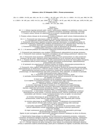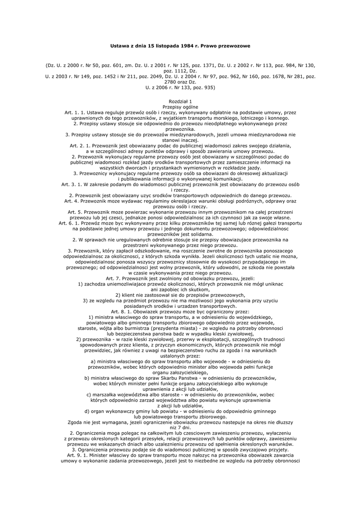 Ustawa z dnia 15 listopada 1984 r. Prawo przewozowe (Dz. U. z 2000 r. Nr 50, poz. 601, zm. Dz. U. z 2001 r. Nr 125, poz. 1371, Dz. U. z 2002 r. Nr 113, poz. 984, Nr 130, poz. 1112, Dz. U. z 2003 r. Nr 149, poz. 1452 i Nr 211, poz. 2049, Dz. U. z 2004 r. Nr 97, poz. 962, Nr 160, poz. 1678, Nr 281, poz. 2780 oraz Dz. U. z 2006 r. Nr 133, poz. 935) Rozdział 1 Przepisy ogólne Art. 1. 1. Ustawa reguluje przewóz osób i rzeczy, wykonywany odpłatnie na podstawie umowy, przez uprawnionych do tego przewozników, z wyjatkiem transportu morskiego, lotniczego i konnego. 2. Przepisy ustawy stosuje sie odpowiednio do przewozu nieodpłatnego wykonywanego przez przewoznika. 3. Przepisy ustawy stosuje sie do przewozów miedzynarodowych, jezeli umowa miedzynarodowa nie stanowi inaczej. Art. 2. 1. Przewoznik jest obowiazany podac do publicznej wiadomosci zakres swojego działania, a w szczególnosci adresy punktów odprawy i sposób zawierania umowy przewozu. 2. Przewoznik wykonujacy regularne przewozy osób jest obowiazany w szczególnosci podac do publicznej wiadomosci rozkład jazdy srodków transportowych przez zamieszczenie informacji na wszystkich dworcach i przystankach wymienionych w rozkładzie jazdy. 3. Przewoznicy wykonujacy regularne przewozy osób sa obowiazani do okresowej aktualizacji i publikowania informacji o wykonywanej komunikacji. Art. 3. 1. W zakresie podanym do wiadomosci publicznej przewoznik jest obowiazany do przewozu osób i rzeczy. 2. Przewoznik jest obowiazany uzyc srodków transportowych odpowiednich do danego przewozu. Art. 4. Przewoznik moze wydawac regulaminy okreslajace warunki obsługi podróznych, odprawy oraz przewozu osób i rzeczy. Art. 5. Przewoznik moze powierzac wykonanie przewozu innym przewoznikom na całej przestrzeni przewozu lub jej czesci, jednakze ponosi odpowiedzialnosc za ich czynnosci jak za swoje własne. Art. 6. 1. Przewóz moze byc wykonywany przez kilku przewozników tej samej lub róznej gałezi transportu na podstawie jednej umowy przewozu i jednego dokumentu przewozowego; odpowiedzialnosc przewozników jest solidarna. 2. W sprawach nie uregulowanych odrebnie stosuje sie przepisy obowiazujace przewoznika na przestrzeni wykonywanego przez niego przewozu. 3. Przewoznik, który zapłacił odszkodowanie, ma roszczenie zwrotne do przewoznika ponoszacego odpowiedzialnosc za okolicznosci, z których szkoda wynikła. Jezeli okolicznosci tych ustalic nie mozna, odpowiedzialnosc ponosza wszyscy przewoznicy stosownie do wysokosci przypadajacego im przewoznego; od odpowiedzialnosci jest wolny przewoznik, który udowodni, ze szkoda nie powstała w czasie wykonywania przez niego przewozu. Art. 7. Przewoznik jest zwolniony od obowiazku przewozu, jezeli: 1) zachodza uniemozliwiajace przewóz okolicznosci, których przewoznik nie mógł uniknac ani zapobiec ich skutkom, 2) klient nie zastosował sie do przepisów przewozowych, 3) ze wzgledu na przedmiot przewozu nie ma mozliwosci jego wykonania przy uzyciu posiadanych srodków i urzadzen transportowych. Art. 8. 1. Obowiazek przewozu moze byc ograniczony przez: 1) ministra własciwego do spraw transportu, a w odniesieniu do wojewódzkiego, powiatowego albo gminnego transportu zbiorowego odpowiednio przez wojewode, staroste, wójta albo burmistrza (prezydenta miasta) - ze wzgledu na potrzeby obronnosci lub bezpieczenstwa panstwa badz w wypadku kleski zywiołowej, 2) przewoznika - w razie kleski zywiołowej, przerwy w eksploatacji, szczególnych trudnosci spowodowanych przez klienta, z przyczyn ekonomicznych, których przewoznik nie mógł przewidziec, jak równiez z uwagi na bezpieczenstwo ruchu za zgoda i na warunkach ustalonych przez: a) ministra własciwego do spraw transportu albo wojewode - w odniesieniu do przewozników, wobec których odpowiednio minister albo wojewoda pełni funkcje organu załozycielskiego, b) ministra własciwego do spraw Skarbu Panstwa - w odniesieniu do przewozników, wobec których minister pełni funkcje organu załozycielskiego albo wykonuje uprawnienia z akcji lub udziałów, c) marszałka województwa albo staroste - w odniesieniu do przewozników, wobec których odpowiednio zarzad województwa albo powiatu wykonuje uprawnienia z akcji lub udziałów, d) organ wykonawczy gminy lub powiatu - w odniesieniu do odpowiednio gminnego lub powiatowego transportu zbiorowego. Zgoda nie jest wymagana, jezeli ograniczenie obowiazku przewozu nastepuje na okres nie dłuzszy niz 7 dni. 2. Ograniczenia moga polegac na całkowitym lub czesciowym zawieszeniu przewozu, wyłaczeniu z przewozu okreslonych kategorii przesyłek, relacji przewozowych lub punktów odprawy, zawieszeniu przewozu we wskazanych dniach albo uzaleznieniu przewozu od spełnienia okreslonych warunków. 3. Ograniczenia przewozu podaje sie do wiadomosci publicznej w sposób zwyczajowo przyjety. Art. 9. 1. Minister własciwy do spraw transportu moze nałozyc na przewoznika obowiazek zawarcia umowy o wykonanie zadania przewozowego, jezeli jest to niezbedne ze wzgledu na potrzeby obronnosci lub bezpieczenstwa panstwa badz w przypadku kleski zywiołowej. 2. W przypadku klesk zywiołowych obowiazek, o którym mowa w ust. 1, moze nałozyc odpowiednio wójt, burmistrz (prezydent miasta), starosta lub marszałek województwa. 3. W wypadkach okreslonych w ust. 1 i 2 organ nakładajacy obowiazek zapewnia przewoznikowi srodki finansowe niezbedne do wykonania nałozonego zadania lub wskazuje podmiot, który na podstawie umowy z przewoznikiem zapewni srodki finansowe na wykonanie tego zadania. Art. 9a. W przypadku wystapienia powaznych zakłócen na rynku usług przewozowych w zegludze sródladowej, w tym nadmiernej podazy usług przewozowych, minister własciwy do spraw transportu moze, w drodze rozporzadzenia, wprowadzic ograniczenia w przewozie rzeczy w zegludze sródladowej, okreslajac czas ich obowiazywania oraz zakres przedmiotowy lub terytorialny ich stosowania, biorac pod uwage srodki podjete przez Komisje Europejska na podstawie własc