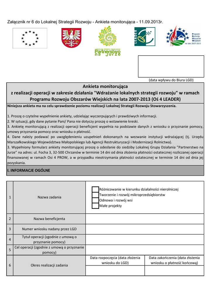 Załącznik nr 6 do Lokalnej Strategii Rozwoju - Ankieta monitorująca - 11.09.2013r. (data wpływu do Biura LGD) Ankieta monitorująca z realizacji operacji w zakresie działania "Wdrażanie lokalnych strategii rozwoju" w ramach Programu Rozwoju Obszarów Wiejskich na lata 2007-2013 (Oś 4 LEADER) Niniejsza ankieta ma na celu sprawdzenie poziomu realizacji Lokalnej Strategii Rozwoju Stowarzyszenia. 1. Proszę o czytelne wypełnienie ankiety, udzielając wyczerpujących i prawdziwych informacji. 2. W sytuacji, gdy dane pytanie Pani/ Pana nie dotyczy proszę o wstawienie kreski. 3. Ankietę monitorującą z realizacji operacji beneficjent wypełnia na podstawie danych z wniosku o przyznanie pomocy, umowy przyznania pomocy oraz wniosku o płatność. 4. Dane należy podawać po uwzględenieniu uzupełnień dokonanych na wezwanie instytucji wdrażającej (tj. Urzędu Marszałkowskiego Województwa Małopolskiego lub Agencji Restrukturyzacji i Modernizacji Rolnictwa). 3. Wypełniony formularz ankiety monitorującej proszę o odesłanie do siedziby Lokalnej Grupy Działania ”Partnerstwo na Jurze” na adres: ul. Focha 3, 32-500 Chrzanów w terminie 14 dni od dnia złożenia płatności ostatecznej rozliczanej operacji finansowanej w ramach Osi 4 PROW, a w przypadku nieotrzymania płatności ostatecznej w terminie 14 dni od dnia jej pozyskania. I. INFORMACJE OGÓLNE 1 Nazwa zadania 2 Nazwa beneficjenta 3 Numer wniosku nadany przez LGD Różnicowanie w kierunku działalności nierolniczej Tworzenie i rozwój mikroprzedsiębiorstw Odnowa i rozwój wsi Małe projekty Tytuł operacji (zgodnie z umową o przyznanie pomocy) Cel operacji (zgodnie z umową o przyznanie 5 pomocy) 4 6 Okres realizacji zadania Data rozpoczęcia (data złożenia wniosku do LGD) Data zakończenia (data złożenia wniosku o płatność końcową) 7 8 9 Imię i nazwisko osoby uprawnionej do kontaktu ws. operacji Numer telefonu osoby uprawnionej do kontaktu ws. operacji Nr e-mail osoby uprawnionej do kontaktu ws. operacji II. POZOSTAŁE DANE BENEFICJENTA: 1 Numer identyfikacyjny nadany przez Biuro Powiatowe ARiMR 2 Adres beneficjenta 3 NIP 4 REGON (jeżeli został nadany) III. INFORMACJE O REALIZACJI OPERACJI: 1 Informacji na jakim etapie znajduje się wniosek Wniosek jest w trakcie rozpatrywania przez Urząd Marszałkowski lub Agencję Restrukturyzacji i Modernizacji Rolnictwa I poprawki do wniosku o przyzanie pomocy II poprawki do wniosku o przyzanie pomocy Wnioskodawca otrzymał odmowę przyznania pomocy Wnioskodawca zawarł umowę o przyznaniu pomocy Wnioskodawca złożył wniosek o płatność I poprawki do wniosku o płatność II poprawki do wniosku o płatność Wnioskodawca zakończył realizację operacji i otrzymał płatność końcową W przypadku zaznaczenia opcji Wnioskodawca zawarł umowę o przyznaniu pomocy, proszę o podanie: Numer umowy Data podpisania Kwota pomocy z umowy Planowany terminu zakończenia realizacji operacji Czy został złożony wniosek o płatność? 2 Jeżeli tak proszę o podanie: TAK NIE Data złożenia Wnioskowana kwota refundacji poniesionych kosztów Czy zostały wypłacone środki? 3 Jeżeli tak proszę o podanie: TAK NIE Data wypłacenia środków Wypłacona kwota 4 Czy w trakcie weryfikacji wniosku o przyznanie pomocy, realizacji lub rozliczania operacji wystąpiły trudności i problemy? TAK NIE Jeżeli tak proszę opisać jakie: 5 Opis zrealizowanej operacji (należy opisać główny zakres operacji np. ilość wybudowanych, wyremontowanych obiektów budowlanych, ilość przeprowadzonych szkoleń, zakres tematyczny szkoleń, ilość zorganizowanych imprez). 6 Sposób rozpowszechniania informacji o realizacji projektu. 7 Grupy docelowe zrealizowanej operacji. organizacje pozarządowe przedsiębiorcy lokalni liderzy ilość ilość ilość osoby niepełnosprawne osoby starsze rolnicy i rodziny rolników ilość ilość ilość mieszkańcy turyści bezrobotni ilość ilość ilość kobiety mężczyźni młodzież ilość ilość ilość dzieci mniejszości ilość ilość Informacja czy w ramach realizacji operacji powstała wartość dodana projektu, która wynika z przebiegu i realizacji 8 operacji i jest związana z osiągnięciem dodatkowych rezultatów, nie wynikających bezpośrednio z celów projektu i z jego działań. 9 Czy Państwa zdaniem nastąpił wzrost standardu życia dzięki realizacji działań wdrażanych przez Lokalną Grupę Działania "Partnerstwo na Jurze"? Proszę o krótki komentarz: TAK NIE NIE WIEM Realizacja wskaźników. W przypadku zrealizowania operacji i osiągnięcia zadeklarowanych wskaźników do ankiety należy dołączyć dowody realizacji zadania oraz wskaźników, tj. dokumentację zdjęciową, listy obecności, protokoły 10 odbioru robót budowlanych, wpis do ewidencji działalności gospodarczej, itp. Jeżeli operacja realizuje więcej wskaźników należy skopiować komórki dotyczące wskaźnika produktu i rezultatu. Wskaźnik produktu Wartość docelowa Wartość obecna a Opis działań zmierzających do realizacji wskaźnika Sposób udokumentowania wskaźnika Wskaźnik rezulatatu Wartość docelowa Wartość obecna a Opis działań zmierzających do realizacji wskaźnika Sposób udokumentowania wskaźnika Oświadczenie Beneficjenta. Oświadczam, iż wyrażam zgodę na przetwarzanie przez Lokalną Grupę Działania "Partnerstwo na Jurze" moich danych 11 osobowych, dla potrzeb sprawozdawczości z realizacji LSR, zgodnie z postanowieniami ustawy z dnia 29 sierpnia 1997 roku o ochronie danych osobowych (Dz. U. 2002 nr 101, poz 926 z późn. zm.). 5 grudzień 2013 r. data pieczęć i podpis Beneficjenta