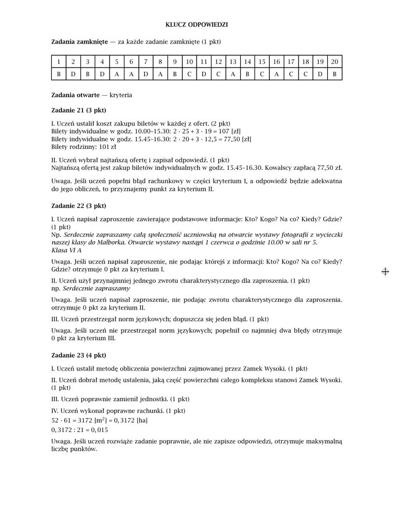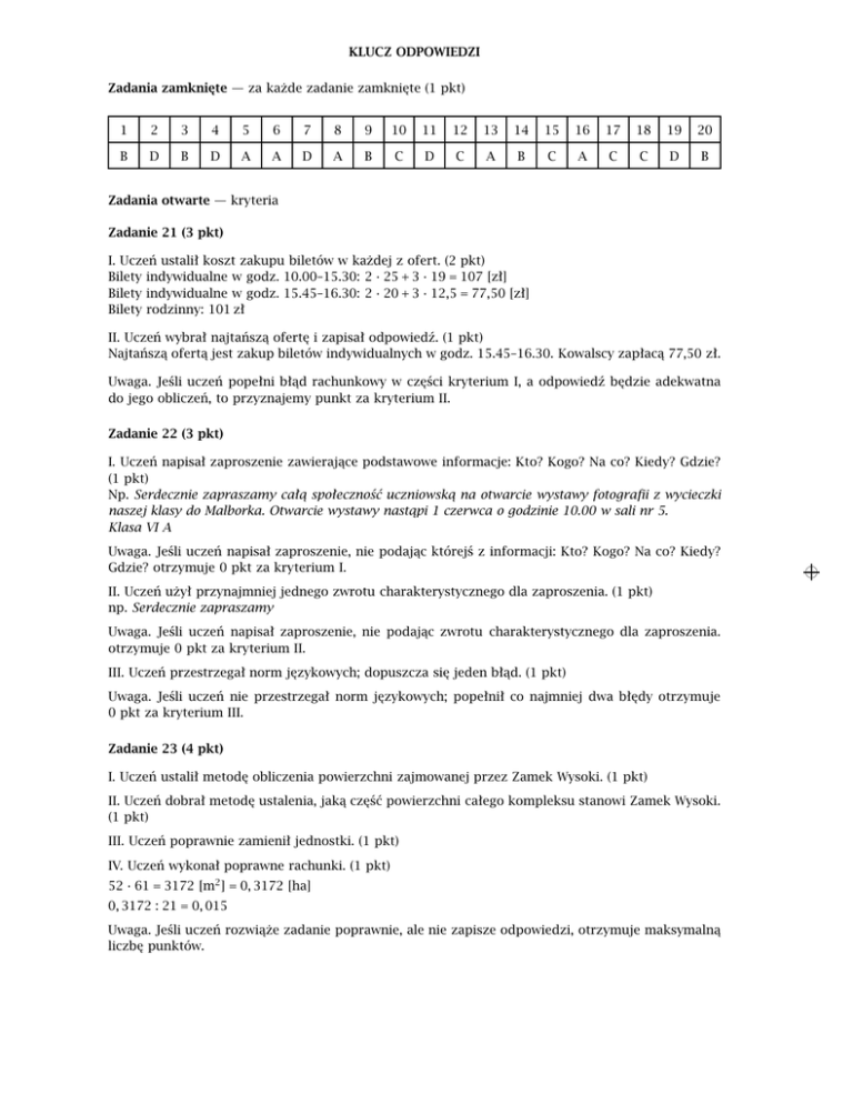 KLUCZ ODPOWIEDZI Zadania zamknięte — za każde zadanie zamknięte (1 pkt) 1 2 3 4 5 6 7 8 9 10 11 12 13 14 15 16 17 18 19 20 B D B D A A D A B C D C A B C A C C D B Zadania otwarte — kryteria Zadanie 21 (3 pkt) I. Uczeń ustalił koszt zakupu biletów w każdej z ofert. (2 pkt) Bilety indywidualne w godz. 10.00–15.30: 2 · 25 + 3 · 19 = 107 [zł] Bilety indywidualne w godz. 15.45–16.30: 2 · 20 + 3 · 12,5 = 77,50 [zł] Bilety rodzinny: 101 zł II. Uczeń wybrał najtańszą ofertę i zapisał odpowiedź. (1 pkt) Najtańszą ofertą jest zakup biletów indywidualnych w godz. 15.45–16.30. Kowalscy zapłacą 77,50 zł. Uwaga. Jeśli uczeń popełni błąd rachunkowy w części kryterium I, a odpowiedź będzie adekwatna do jego obliczeń, to przyznajemy punkt za kryterium II. Zadanie 22 (3 pkt) I. Uczeń napisał zaproszenie zawierające podstawowe informacje: Kto? Kogo? Na co? Kiedy? Gdzie? (1 pkt) Np. Serdecznie zapraszamy całą społeczność uczniowską na otwarcie wystawy fotografii z wycieczki naszej klasy do Malborka. Otwarcie wystawy nastąpi 1 czerwca o godzinie 10.00 w sali nr 5. Klasa VI A Uwaga. Jeśli uczeń napisał zaproszenie, nie podając którejś z informacji: Kto? Kogo? Na co? Kiedy? Gdzie? otrzymuje 0 pkt za kryterium I. II. Uczeń użył przynajmniej jednego zwrotu charakterystycznego dla zaproszenia. (1 pkt) np. Serdecznie zapraszamy Uwaga. Jeśli uczeń napisał zaproszenie, nie podając zwrotu charakterystycznego dla zaproszenia. otrzymuje 0 pkt za kryterium II. III. Uczeń przestrzegał norm językowych; dopuszcza się jeden błąd. (1 pkt) Uwaga. Jeśli uczeń nie przestrzegał norm językowych; popełnił co najmniej dwa błędy otrzymuje 0 pkt za kryterium III. Zadanie 23 (4 pkt) I. Uczeń ustalił metodę obliczenia powierzchni zajmowanej przez Zamek Wysoki. (1 pkt) II. Uczeń dobrał metodę ustalenia, jaką część powierzchni całego kompleksu stanowi Zamek Wysoki. (1 pkt) III. Uczeń poprawnie zamienił jednostki. (1 pkt) IV. Uczeń wykonał poprawne rachunki. (1 pkt) 52 · 61 = 3172 [m2 ] = 0, 3172 [ha] 0, 3172 : 21 = 0, 015 Uwaga. Jeśli uczeń rozwiąże zadanie poprawnie, ale nie zapisze odpowiedzi, otrzymuje maksymalną liczbę punktów. Zadanie 24 (2 pkt) I. Uczeń podaje dwie najważniejsze zasady właściwego zachowania się w czasie zwiedzania obiektu wpisanego na listę światowego dziedzictwa kulturowego i przyrodniczego UNESCO. (1 pkt) W muzeum nie wolno niszczyć zabytków. Nie wolno oddalać się od grupy. Należy się zachowywać zgodnie z regulaminem muzeum. Obiekt wolno zwiedzać wyłącznie z przewodnikiem. Wolno odpoczywać w miejscach do tego wyznaczonych. Należy się zachowywać odpowiedzialnie. II. Uczeń formułuje zasady poprawnie pod względem językowym (używając czasowników modalnych: trzeba, należy, powinno się lub form 2. osoby trybu rozkazującego czasowników, np. wchodź, nie oddalaj się). (1 pkt) Zadanie 25 (8 pkt) I. Uczeń pisze na temat, tzn. opisuje przedstawioną fotografię. (1 pkt) II. Uczeń wyodrębnia i nazywa charakterystyczne elementy przedstawione na opisywanej fotografii (minimum 5 elementów). (1 pkt) III. Uczeń stosuje wszystkie wyrazy podane w poleceniu. (1 pkt) IV. Uczeń sytuuje w przestrzeni fotografii opisywane elementy (np. używa sformułowań: na pierwszym planie, w tle). (1 pkt) V. Uczeń wyraża opinię na temat fotografii. (1 pkt) VI. Uczeń pisze poprawnie pod względem językowym (unika powtórzeń, wykorzystuje synonimy takich czasowników, jak jest, widnieje, znajduje się); dopuszcza się 3 błędy. (1 pkt) VII. Uczeń pisze poprawnie pod względem ortograficznym (bierze się pod uwagę wszystkie zasady ortograficzne poznawane przez ucznia w szkole podstawowej — zgodnie z klasyfikacją stosowaną na szkoleniach kandydatów na egzaminatorów); dopuszcza się 3 błędy. (1 pkt) VIII. Uczeń pisze poprawnie pod względem interpunkcyjnym; dopuszcza się 3 błędy. (1 pkt) Uwagi. 1. Uczeń może wyobrażać sobie obraz w kolorze, ale nie musi tego robić. 2. Jeśli tekst liczy mniej niż połowę wyznaczonego miejsca, przyznajemy tylko punkty w kryteriach I–V. 3. Jeśli uczeń nie potrafi wyznaczyć granic zdania (słowotok), w kryteriach VI oraz VIII otrzymuje 0 punktów. KARTOTEKA SPRAWDZIANU „ZAMEK W MALBORKU” Standardy wymagań Zadania Badane czynności ucznia Uczeń: Numer Typ Liczba standardu zadania punktów 1. rozpoznaje charakterystyczne cechy tekstu 1.1. WW 1 2. posługuje się kategoriami czasu 3.1 WW 1 3. odczytuje informację podaną w tekście 1.1. WW 1 4. rozpoznaje charakterystyczne cechy rycerza krzyżackiego 3.6. WW 1 5. wnioskuje na podstawie opisu zjawiska mającego charakter prawidłowości 3.7.b WW 1 6. odczytuje dane z tekstu źródłowego, odpowiada na proste pytania z nimi związane 1.4. WW 1 7. wskazuje źródło informacji 4.1. WW 1 8. odczytuje dane z mapy 1.4 WW 1 9. wykorzystuje w sytuacjach praktycznych własności elementów środowiska i stosuje je do rozwiązania problemu 5.5. WW 1 10. odpowiada na pytania związane z tekstem 1.4. WW 1 11. odczytuje dosłowne znaczenie podanych informacji 1.1. WW 1 12. odpowiada na pytania związane z tekstem 1.4. WW 1 13. rozpoznaje rodzaj środka stylistycznego zastosowanego w tekście 1.2. WW 1 14. odczytuje informację podaną w tekście 1.1. WW 1 15. analizuje otrzymane wyniki 3.9 WW 1 16. na podstawie cech charakterystycznych dla danego tekstu nazywa jego rodzaj 1.1. WW 1 17. rozpoznaje cechy charakterystyczne obiektów przyrodniczych, elementów środowiska, wskazuje podobieństwa 3.6. WW 1 18. posługuje się kategoriami czasu i przestrzeni w celu porządkowania wydarzeń 3.1 WW 1 19. oblicza upływ czasu między wydarzeniami 3.1.c WW 1 20. wykorzystuje w sytuacjach praktycznych własności elementów środowiska i stosuje je do rozwiązania problemu 5.5. WW 1 21. wykonuje obliczenia dotyczące pieniędzy 5.3.g RO 3 22. formułuje zaproszenie, świadomie dobierając słowa; przestrzega norm j