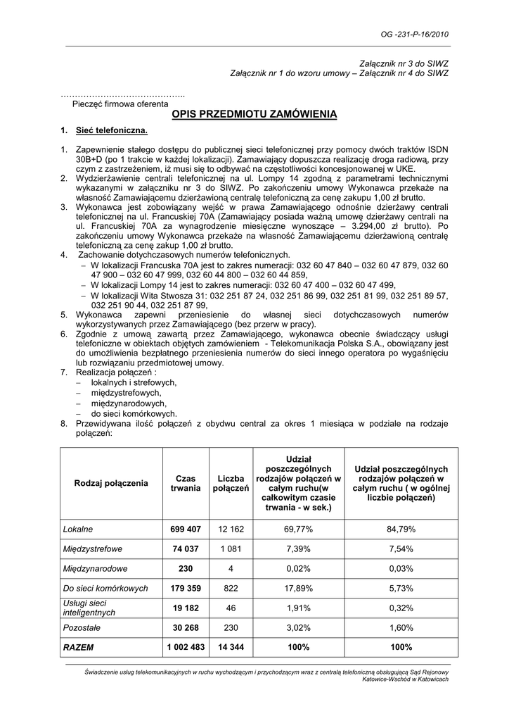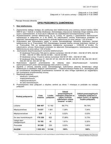 OG -231-P-16/2010 Załącznik nr 3 do SIWZ Załącznik nr 1 do wzoru umowy – Załącznik nr 4 do SIWZ …………………………………….. Pieczęć firmowa oferenta OPIS PRZEDMIOTU ZAMÓWIENIA 1. Sieć telefoniczna. 1. Zapewnienie stałego dostępu do publicznej sieci telefonicznej przy pomocy dwóch traktów ISDN 30B+D (po 1 trakcie w kaŜdej lokalizacji). Zamawiający dopuszcza realizację droga radiową, przy czym z zastrzeŜeniem, iŜ musi się to odbywać na częstotliwości koncesjonowanej w UKE. 2. WydzierŜawienie centrali telefonicznej na ul. Lompy 14 zgodną z parametrami technicznymi wykazanymi w załączniku nr 3 do SIWZ. Po zakończeniu umowy Wykonawca przekaŜe na własność Zamawiającemu dzierŜawioną centralę telefoniczną za cenę zakupu 1,00 zł brutto. 3. Wykonawca jest zobowiązany wejść w prawa Zamawiającego odnośnie dzierŜawy centrali telefonicznej na ul. Francuskiej 70A (Zamawiający posiada waŜną umowę dzierŜawy centrali na ul. Francuskiej 70A za wynagrodzenie miesięczne wynoszące – 3.294,00 zł brutto). Po zakończeniu umowy Wykonawca przekaŜe na własność Zamawiającemu dzierŜawioną centralę telefoniczną za cenę zakup 1,00 zł brutto. 4. Zachowanie dotychczasowych numerów telefonicznych. − W lokalizacji Francuska 70A jest to zakres numeracji: 032 60 47 840 – 032 60 47 879, 032 60 47 900 – 032 60 47 999, 032 60 44 800 – 032 60 44 859, − W lokalizacji Lompy 14 jest to zakres numeracji: 032 60 47 400 – 032 60 47 499, − W lokalizacji Wita Stwosza 31: 032 251 87 24, 032 251 86 99, 032 251 81 99, 032 251 89 57, 032 251 90 44, 032 251 87 99, 5. Wykonawca zapewni przeniesienie do własnej sieci dotychczasowych numerów wykorzystywanych przez Zamawiającego (bez przerw w pracy). 6. Zgodnie z umową zawartą przez Zamawiającego, wykonawca obecnie świadczący usługi telefoniczne w obiektach objętych zamówieniem - Telekomunikacja Polska S.A., obowiązany jest do umoŜliwienia bezpłatnego przeniesienia numerów do sieci innego operatora po wygaśnięciu lub rozwiązaniu przedmiotowej umowy. 7. Realizacja połączeń : − lokalnych i strefowych, − międzystrefowych, − międzynarodowych, − do sieci komórkowych. 8. Przewidywana ilość połączeń z obydwu central za okres 1 miesiąca w podziale na rodzaje połączeń: Rodzaj połączenia Czas trwania Udział poszczególnych Liczba rodzajów połączeń w całym ruchu(w połączeń całkowitym czasie trwania - w sek.) Udział poszczególnych rodzajów połączeń w całym ruchu ( w ogólnej liczbie połączeń) Lokalne 699 407 12 162 69,77% 84,79% Międzystrefowe 74 037 1 081 7,39% 7,54% 230 4 0,02% 0,03% Do sieci komórkowych 179 359 822 17,89% 5,73% Usługi sieci inteligentnych 19 182 46 1,91% 0,32% Pozostałe 30 268 230 3,02% 1,60% 1 002 483 14 344 100% 100% Międzynarodowe RAZEM Świadczenie usług telekomunikacyjnych w ruchu wychodzącym i przychodzącym wraz z centralą telefoniczną obsługującą Sąd Rejonowy Katowice-Wschód w Katowicach OG -231-P-16/2010 9. 10. 11. 12. Sekundowe naliczanie opłat za usługi telekomunikacyjne. Brak opłat za inicjację połączenia. Obliczanie cen połączeń z dokładnością do 0,01 zł. Wykonawca w trakcie realizacji umowy musi posiadać całodobowe centrum przyjmowania reklamacji, które jest czynne przez wszystkie dni w roku. 13. Maksymalny czas reakcji na zgłoszone telefonicznie i potwierdzone faksem usterki – 30 minut. 14. Gwarantowany czas usunięcia awarii – 4 godziny. 15. Wykonawca zapewni comiesięczny billing wszystkich numerów na nośniku elektronicznym lub dostęp online do systemu bilingowego przez szyfrowane połączenie na stronę WWW II. Budynek Sądu Rejonowego Katowice-Wschód w Katowicach przy ul. Lompy 14 Telefonia: 1. liczba łączy zewnętrznych – usługa ISDN 30B+D w ilości 1 szt. z przydziałem numerów w postaci DDI 2. niezbędne usługi głosowe: − bezpłatne połączenia w grupie korporacyjnej − lokalne − międzystrefowe − międzynarodowe − do sieci komórkowych − z numerami 0-8xx …. − z numerami specjalnymi Wszystkie wymienione wyŜej usługi powinny być moŜliwe do zablokowania. 3. niezbędne usługi łączy zewnętrznych − Prezentacja numeru osoby dzwoniącej – CLIP − Blokada prezentacji numeru – CLIR na Ŝądanie − Przekierowanie połączeń − Połączenia oczekujące – z moŜliwością wyłączania przez uŜytkownika. 4. Usługa DDI w ilości 100 numerów 5. Zakres numeracji: 032 60 47 400 – 032 60 47 499, III. Budynek Sądu Rejonowego Katowice-Wschód w Katowicach przy ul. Francuskiej 70A Telefonia: 1. liczba łączy zewnętrznych – usługa ISDN 30B+D w ilości 1 szt. z przydziałem numerów w postaci DDI 2. niezbędne usługi głosowe: − bezpłatne połączenia w grupie korporacyjnej − lokalne − międzystrefowe − międzynarodowe − do sieci komórkowych − z numerami 0-8xx …. − z numerami specjalnymi Wszystkie wymienione wyŜej usługi powinny być moŜliwe do zablokowania. 3. niezbędne usługi łączy zewnętrznych − Prezentacja numeru osoby dzwoniącej – CLIP − Blokada prezentacji numeru – CLIR na Ŝądanie − Przekierowanie połączeń − Połączenia oczekujące – z moŜliwością wyłączania przez uŜytkownika. 4. Usługa DDI w ilości 200 numerów 5. Zakres numeracji: 032 60 47 840 – 032 60 47 879, 032 60 47 900 – 032 60 47 999, 032 60 44 800 – 032 60 44 859, Świadczenie usług telekomunikacyjnych w ruchu wychodzącym i przychodzącym wraz z centralą telefoniczną obsługującą Sąd Rejonowy Katowice-Wschód w Katowicach OG -231-P-16/2010 IV. Budynek Sądu Rejonowego Katowice-Wschód w Katowicach przy ul. Wita Stwosza 31 Telefonia: 1. liczba łączy zewnętrznych – usługa ISDN 2B+D w ilości 3 szt. z przydziałem numerów 2. liczba łączy zewnętrznych – usługa łącza analogowego w ilości 1 szt. 3. niezbędne usługi głosowe: − bezpłatne połączenia w grupie korporacyjnej − lokalne 