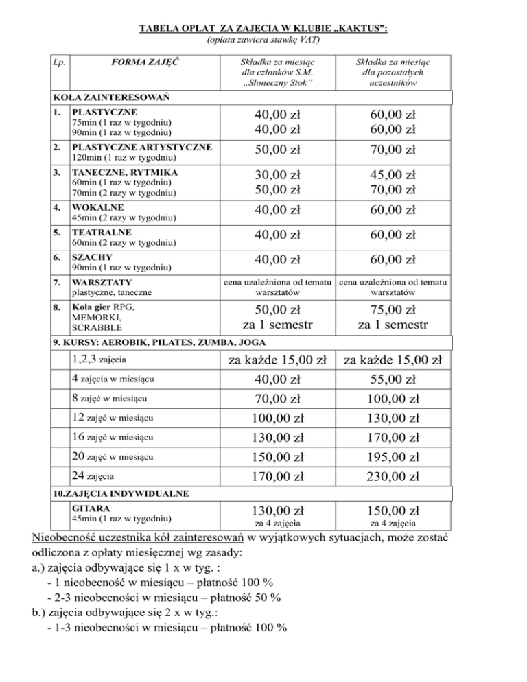 TABELA OPŁAT ZA ZAJĘCIA W KLUBIE „KAKTUS”: (opłata zawiera stawkę VAT) Lp. FORMA ZAJĘĆ Składka za miesiąc dla członków S.M. „Słoneczny Stok” Składka za miesiąc dla pozostałych uczestników KOŁA ZAINTERESOWAŃ 1. PLASTYCZNE 75min (1 raz w tygodniu) 90min (1 raz w tygodniu) 40,00 zł 40,00 zł 60,00 zł 60,00 zł 2. PLASTYCZNE ARTYSTYCZNE 120min (1 raz w tygodniu) 50,00 zł 70,00 zł 3. TANECZNE, RYTMIKA 60min (1 raz w tygodniu) 70min (2 razy w tygodniu) 30,00 zł 50,00 zł 45,00 zł 70,00 zł 4. WOKALNE 45min (2 razy w tygodniu) 40,00 zł 60,00 zł 5. TEATRALNE 60min (2 razy w tygodniu) 40,00 zł 60,00 zł 6. SZACHY 90min (1 raz w tygodniu) 40,00 zł 60,00 zł 7. WARSZTATY plastyczne, taneczne 8. Koła gier RPG, MEMORKI, SCRABBLE cena uzależniona od tematu cena uzależniona od tematu warsztatów warsztatów 50,00 zł za 1 semestr 75,00 zł za 1 semestr 9. KURSY: AEROBIK, PILATES, ZUMBA, JOGA za każde 15,00 zł za każde 15,00 zł 4 zajęcia w miesiącu 40,00 zł 55,00 zł 8 zajęć w miesiącu 70,00 zł 100,00 zł 12 zajęć w miesiącu 100,00 zł 130,00 zł 16 zajęć w miesiącu 130,00 zł 170,00 zł 20 zajęć w miesiącu 150,00 zł 195,00 zł 24 zajęcia 170,00 zł 230,00 zł 130,00 zł 150,00 zł za 4 zajęcia za 4 zajęcia 1,2,3 zajęcia 10.ZAJĘCIA INDYWIDUALNE GITARA 45min (1 raz w tygodniu) Nieobecność uczestnika kół zainteresowań w wyjątkowych sytuacjach, może zostać odliczona z opłaty miesięcznej wg zasady: a.) zajęcia odbywające się 1 x w tyg. : - 1 nieobecność w miesiącu – płatność 100 % - 2-3 nieobecności w miesiącu – płatność 50 % b.) zajęcia odbywające się 2 x w tyg.: - 1-3 nieobecności w miesiącu – płatność 100 % - 4-7 nieobecności w miesiącu – płatność 50 % c.) całomiesięczna nieobecność nieusprawiedliwiona powoduje skreślenie z listy.