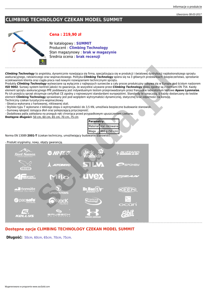 Informacje o produkcie Utworzono 08-03-2017 CLIMBING TECHNOLOGY CZEKAN MODEL SUMMIT Cena : 219,90 zł Nr katalogowy : SUMMIT Producent : Climbing Technology Stan magazynowy : brak w magazynie Średnia ocena : brak recenzji da .p l Climbing Technology to angielska, dynamicznie rozwijająca się firma, specjalizująca się w produkcji i światowej dystrybucji najdoskonalszego sprzętu asekuracyjnego, ratowniczego oraz wspinaczkowego. Polityka Climbing Technology opiera się na 3 głównych przesłankach: bezpieczeństwo, sprostanie oczekiwaniom klienta oraz ciągła praca nad nowymi rozwiązaniami technicznymi sprzętu. Produkty Climbing Technology wytwarzane są wyłącznie z najlepszych surowców a cały proces produkcyjny odbywa się w Europie pod ścisłym nadzorem ISO 9002. Surowy system kontroli jakości to gwarancja, że wszystkie używane przez Climbing Technology stopy zgodne są z normami EN 754. Każdy element sprzętu asekuracyjnego PPE poddawany jest indywidualnym testom przeprowadzanym przez francuskie laboratorium testowe Apave Lyonnaise. Po ich przejściu sprzęt otrzymuje certyfikat CE zgodny z najnowszymi standardami europejskimi. Standardy te oznaczają, iż każdy dostarczany do testów element Climbing Technology sprawdzany jest pod względem wytrzymałości dynamicznej, statycznej oraz odporności na korozję. Techniczny czekan turystyczno-wspinaczkowy. - Głowica wykonana z hartowanej, niklowanej stali. - Stylisko typu T wykonane z lekkiego stopu o wytrzymałości do 3,5 KN, umożliwia bezpieczne budowanie stanowisk. - Gumową rękojeść izolująca dłoń oraz polepszającą przyczepność. - Dodatkowa pętla zakładana na przegub ręki chroniąca przed przypadkowym upuszczeniem czekana. Dostępne długości: 50 cm, 60 cm, 65 cm, 70 cm, 75 cm Parametry: Materiał stal niklowana Waga 460 g (50 cm) Norma EN 13089 2001-T (czekan techniczny, umożliwiający budowanie stanowisk). se la - Produkt oryginalny, nowy, objęty gwarancją. Dostępne opcje CLIMBING TECHNOLOGY CZEKAN MODEL SUMMIT Długość: 50cm, 60cm, 65cm, 70cm, 75cm. Wygenerowano w programie www.oscGold.com