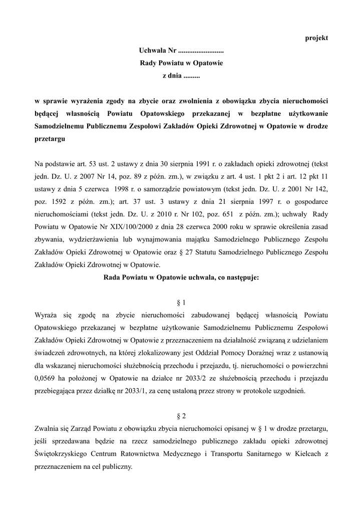 projekt Uchwała Nr ......................... Rady Powiatu w Opatowie z dnia ......... w sprawie wyrażenia zgody na zbycie oraz zwolnienia z obowiązku zbycia nieruchomości będącej własnością Powiatu Opatowskiego przekazanej w bezpłatne użytkowanie Samodzielnemu Publicznemu Zespołowi Zakładów Opieki Zdrowotnej w Opatowie w drodze przetargu Na podstawie art. 53 ust. 2 ustawy z dnia 30 sierpnia 1991 r. o zakładach opieki zdrowotnej (tekst jedn. Dz. U. z 2007 Nr 14, poz. 89 z późn. zm.), w związku z art. 4 ust. 1 pkt 2 i art. 12 pkt 11 ustawy z dnia 5 czerwca 1998 r. o samorządzie powiatowym (tekst jedn. Dz. U. z 2001 Nr 142, poz. 1592 z późn. zm.); art. 37 ust. 3 ustawy z dnia 21 sierpnia 1997 r. o gospodarce nieruchomościami (tekst jedn. Dz. U. z 2010 r. Nr 102, poz. 651 z późn. zm.); uchwały Rady Powiatu w Opatowie Nr XIX/100/2000 z dnia 28 czerwca 2000 roku w sprawie określenia zasad zbywania, wydzierżawienia lub wynajmowania majątku Samodzielnego Publicznego Zespołu Zakładów Opieki Zdrowotnej w Opatowie oraz § 27 Statutu Samodzielnego Publicznego Zespołu Zakładów Opieki Zdrowotnej w Opatowie. Rada Powiatu w Opatowie uchwala, co następuje: §1 Wyraża się zgodę na zbycie nieruchomości zabudowanej będącej własnością Powiatu Opatowskiego przekazanej w bezpłatne użytkowanie Samodzielnemu Publicznemu Zespołowi Zakładów Opieki Zdrowotnej w Opatowie z przeznaczeniem na działalność związaną z udzielaniem świadczeń zdrowotnych, na której zlokalizowany jest Oddział Pomocy Doraźnej wraz z ustanowią dla wskazanej nieruchomości służebnością przechodu i przejazdu, tj. nieruchomości o powierzchni 0,0569 ha położonej w Opatowie na działce nr 2033/2 ze służebnością przechodu i przejazdu przebiegająca przez działkę nr 2033/1, za cenę ustaloną przez strony w protokole uzgodnień. §2 Zwalnia się Zarząd Powiatu z obowiązku zbycia nieruchomości opisanej w § 1 w drodze przetargu, jeśli sprzedawana będzie na rzecz samodzielnego publicznego zakładu opieki zdrowotnej Świętokrzyskiego Centrum Ratownictwa Medycznego i Transportu Sanitarnego w Kielcach z przeznaczeniem na cel publiczny. §3 Szczegółowe oznaczenie nieruchomości i służebności, o których mowa w § 1 zawiera mapa stanowiąca załącznik do uchwały. §4 Wykonanie uchwały powierza się Zarządowi Powiatu w Opatowie. §5 Uchwała wchodzi w życie z dniem podjęcia. Uzasadnienie Zgodnie z art. 53 ust. 2 ustawy z dnia 30 sierpnia 1991 roku o zakładach opieki zdrowotnej (tekst jedn. Dz. U. z 2007 Nr 14 poz. 89 z późn. zm.) zbycie aktywów trwałych samodzielnego publicznego zakładu opieki zdrowotnej może nastąpić wyłącznie na zasadach określonych przez podmiot, który utworzył zakład. Zasady te zostały ustalone przez Radę Powiatu w Opatowie w Uchwale Nr XIX/100/2000 z dnia 28 czerwca 2000 roku w sprawie określenia zasad zbywania, wydzierżawienia lub wynajmowania majątku Samodzielnego Publicznego Zespołu Zakładów Opieki Zdrowotnej w Opatowie oraz w § 27 Statutu Samodzielnego Publicznego Zespołu Zakładów Opieki Zdrowotnej w Opatowie. Zgodnie z § 4 ust. 1 i 2 powyżej uchwały zbycie nieruchomości, którymi samodzielnie gospodaruje SP ZZOZ w Opatowie wymaga każdorazowo zgody Rady Powiatu w Opatowie po uprzednim poinformowaniu Zarządu Powiatu o przedstawieniu nieruchomości do zbycia przez Dyrektora jednostki. Dyrektor SP ZZOZ w Opatowie poinformował o tym Zarząd w piśmie z dnia 4 stycznia 2011 roku. Zbycie takiej nieruchomości może nastąpić, jeżeli jest ona trwale nieprzydatna SP ZZOZ albo Zarząd Powiatu nie widzi możliwości zagospodarowania jej w sposób racjonalny (§ 4 ust. 3 uchwały Rady Powiatu w Opatowie Nr XIX/100/2000). W przypadku zbycia nieruchomości, na której zlokalizowany jest Oddział Pomocy Doraźnej SP ZZOZ w Opatowie Zarząd Powiatu nie widzi możliwości zagospodarowania jej w sposób racjonalny, ze względu na zmianę ustawodawca. W dnia 22 października 2010 roku została znowelizowana ustawa o Państwowym Ratownictwie Medycznym (Dz. U. Nr 219, poz. 1443). Wprowadzonych zostało wiele zmian w organizacji udzielania świadczeń zdrowotnych z zakresu ratownictwa medycznego, w tym ustalono nowe zasady tworzenia wojewódzkich planów działania systemu Państwowe Ratownictwo Medyczne. Zgodnie z projektem nowego planu opracowanego przez Wojewodę Świętokrzyskiego teren województwa świętokrzyskiego został podzielony na 3 rejony operacyjne: centralny (obejmujący miasto Kielce oraz powiat kielecki i konecki), południowy (obejmujący powiaty staszowski, buski, jędrzejowski, kazimierski, pińczowski i włoszczowski), północny (obejmujący powiaty skarżyski, starachowicki, ostrowiecki, opatowski i sandomierski). Wszystkie zespoły ratownictwa medycznego stacjonujące na terenie województwa świętokrzyskie, nie później niż od dnia 1 lipca 2011 roku, będą dysponowane tylko z jednego miejsca, tj. z dyspozytorni medycznej znajdującej się w strukturach organizacyjnych Świętokrzyskiego Centrum Ratownictwa Medycznego i Transportu Sanitarnego w Kielcach. Powierzenie odpowiedzialności jednemu podmiotowi za prowadzenie akcji ratownictwa medycznego na terenie całego województwa było od dawna oczekiwane, gdyż jest to niezwykle korzystne z punktu widzenia osób oczekujących na szybką i skuteczną pomoc medyczną. W ślad za nowelizacją ustawy zmieniają się zasady kontraktowania przez Narodowy Fundusz Zdrowia świadczeń z zakresu ratownictwa medycznego. Rozpatrywane będą oferty tylko tych podmiotów, które będą w stanie zapewnić świadczenie usług na terenie całego rejonu operacyjnego. W związku z powyższym SPZZOZ w Opatowie nie będzie spełniał wymogów do zakontraktowania świadczeń z zakresu ratownictwa i tym samym powiat Opatowski zostanie pozbawionych tych świadczeń. Nabycie Oddziału Świętokrzyskiego pozwoli Pomocy Doraźnej przez Urząd dodać go do struktury jednostki Mar