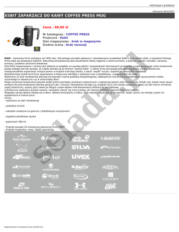 Informacje o produkcie Utworzono 08-03-2017 ESBIT ZAPARZACZ DO KAWY COFFEE PRESS MUG Cena : 89,00 zł Nr katalogowy : COFFEE PRESS Producent : Esbit Stan magazynowy : brak w magazynie Średnia ocena : brak recenzji da .p l Esbit - niemiecka firma istniejąca od 1936 roku. Od samego początku głównym i sztandarowym produktem Esbit'a było paliwo stałe, w produkcji którego firma stała się światowym liderem. Naturalną konsekwencją było poszerzenie oferty najpierw o same kuchenki, a później o garnki, menażki, naczynia, termosy i podobne akcesoria biwakowe. Dziś Esbit rozpoznawany i ceniony jest głównie ze względu na wysoką jakość i niezawodność oferowanych produktów, a jego pozycja na rynku producenta paliwa stałego jest tak wysoka, że często określa się je mianem "paliwa Esbit". Z oferty firmy korzystają jednostki wojskowe, służby ratownicze, międzynarodowe organizacje niosące pomoc w krajach trzeciego świata, a także "zwykli" turyści, wspinacze i entuzjaści outdoor'u. Wysokiej klasy kubek termiczny wyposażony w klasyczną nakrętkę z wylewem oraz w dodatkową, z zaparzaczem do kawy. Wykonany ze stali nierdzewnej pokrytej od zewnątrz czarną powłoką antypoślizgową. Zabezpiecza ona przed przypadkowym upuszczeniem kubka trzymanego w rękawiczce czy w zmarzniętej dłoni. Długo utrzymuje temperaturę płynów dzięki próżni pomiędzy ściankami wykonanymi z najwyższej jakości stali nierdzewnej. Dzięki niej, kubek może służyć zarówno do przechowywania płynów gorących jak i zimnych. Niezależnie od tego czy znajduje się w nim świeżo zaparzona kawa czy też mocno zmrożony napój izotoniczny, wylany płyn nawet po długim czasie będzie miał temperaturę zbliżoną do początkowej. Cylindryczny zaparzacz pozwoli zawsze i wszędzie cieszyć się mocną kawą, jak również świeżym naparem liściastej herbaty. Wygodna rączka dobrze układa się w dłoni, ułatwia korzystanie z kubka. Obie nakrętki osadzane są na gwincie, dzięki czemu nie istnieje ryzyko ich wypadnięcia w trakcie picia. Cechy: - wykonany ze stali nierdzewnej - podwójne ścianki - nakrętka osadzona na gwincie z dodatkowym zamykaniem - pojemność 590 ml la - wygodna plastikowa rączka se - Produkt posiada 24 miesiączną gwarancję firmy ESBIT - Produkt oryginalny, nowy, objęty gwarancją. Wygenerowano w programie www.oscGold.com