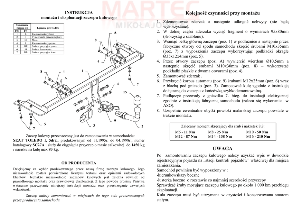 INSTRUKCJA montaŜu i eksploatacji zaczepu kulowego Oznaczenie zacisku wg ISO PN 1 L 2 + 3 31 4 R 5 58R 6 54 7 58L Kolejność czynności przy montaŜu 1. Zdemontować zderzak a następnie odkręcić uchwyty (nie będą wykorzystane). 2. W dolnej części zderzaka wyciąć fragment o wymiarach 95x80mm (skorzystaj z szablonu). 3. Wsunąć belkę główną zaczepu (poz. 1) w podłuŜnice a następnie przez fabryczne otwory od spodu samochodu skręcić śrubami M10x35mm (poz. 7) z wyposaŜenia zaczepu wykorzystując podkładki okrągłe Ø35x12x4mm (poz. 5). 4. Przez otwory zaczepu (poz. A) wywiercić wiertłem Ø10,5mm a następnie skręcić śrubami M10x30mm (poz. 8) – wykorzystać podkładki płaskie z dwoma otworami (poz. 4). 5. Zamontować zderzak . 6. Przykręcić korpus automatu (poz. 9) śrubami M12x25mm (poz. 6) wraz z blachą pod gniazdo (poz. 3). Zamocować kulę zgodnie z instrukcją dołączaną do zaczepu z końcówką szybkodemontowalną. 7. Podłączyć przewody z gniazdka 7- bieg. do instalacji elektrycznej zgodnie z instrukcją fabryczną samochodu (zaleca się wykonanie w ASO). 8. Uzupełnić ewentualne ubytki powłoki malarskiej zaczepu powstałe w trakcie montaŜu. Łączenie przewodów A Kierunkowskazy lewe Tylne światła przeciwmgłowe Masa Kierunkowskazy prawe Światła pozycyjne prawe Światła hamowania Światła pozycyjne lewe 8 4 8 4 1 A 6 7 15 9 5 7 3 2 Zaczep kulowy przeznaczony jest do zamontowania w samochodzie: SEAT TOLEDO I, 5drz., produkowanym od 11.1995r. do 04.1998r., numer katalogowy SC27A i słuŜy do ciągnięcia przyczep o masie całkowitej do 1450 kg i nacisku na kulę max 80 kg. OD PRODUCENTA Dziękujemy za wybór produkowanego przez naszą firmę zaczepu kulowego. Jego niezawodność została potwierdzona licznymi testami oraz opiniami zadowolonych klientów. JednakŜe niezawodność zaczepów kulowych jest zaleŜna równieŜ od prawidłowego montaŜu oraz prawidłowej eksploatacji. Z tego powodu prosimy Państwa o staranne przeczytanie niniejszej instrukcji montaŜu oraz przestrzeganie zawartych wskazówek. Zaczep naleŜy zamontować w miejscach do tego celu przeznaczonych przez producenta samochodu. Zalecany moment skręcający dla śrub i nakrętek 8,8: M6 - 11 Nm M8 - 25 Nm M10 - 50 Nm M12 - 87 Nm M14 - 138 Nm M16 - 210 Nm UWAGA Po zamontowaniu zaczepu kulowego naleŜy uzyskać wpis w dowodzie rejestracyjnym pojazdu na „stacji kontroli pojazdów” właściwej dla miejsca zamieszkania. Samochód powinien być wyposaŜony w : -kierunkowskazy boczne -lusterka boczne o rozstawie co najmniej szerokości przyczepy Sprawdzać śruby mocujące zaczepu kulowego po około 1 000 km przebiegu eksploatacji. Kula zaczepu musi być utrzymana w czystości i konserwowana smarem stałym. PPUH AUTO-HAK Sp.J. WyposaŜenie zaczepu: Produkcja Zaczepów Kulowych Henryk & Zbigniew Nejman 76-200 SŁUPSK ul. Słoneczna 16K tel/fax (059) 8-414-414; 8-414-413 email: [email protected] www. autohak.com.pl Zaczep kulowy bez wyposaŜenia elektrycznego Klasa: A50-X Nr kat. SC27A Przeznaczony do zamontowania w samochodzie: Producent: SEAT Model: TOLEDO I Typ: 5 drz. produkowanego od 11.1995r. do 04.1998r. Dane techniczne: wartość D: 7,45 kN maksymalna masa przyczepy: 1450 kg maksymalny nacisk na kulę: 80 kg Numer homologacji zgodnie z dyrektywą 94/20/WE: e20*94/20*1132*00 KARTA GWARANCYJNA Producent udziela gwarancji niniejszą kartą gwarancyjną na okres 24 miesięcy licząc od dnia zakupu zaczepu kulowego do samochodu: SEAT TOLEDO I 5 drz. produkowanego od 11.1995r. do 04.1998r. Data produkcji .............................. Data zakupu............................................. Zakres gwarancji obejmuje wyłącznie wady jakościowe wynikające z winy producenta. Gwarancja nie obejmuje natomiast uszkodzeń zawinionych przez nabywcę, wynikających z niewłaściwego montaŜu, uŜytkowania lub konserwacji, uszkodzeń mechanicznych, normalnego zuŜycia podczas eksploatacji itp. Gwarancja udzielona na zakupiony towar nie wyłącza, nie ogranicza ani nie zawiesza uprawnień kupującego wynikających z niezgodności towaru z umową. Reklamacje naleŜy zgłaszać w punkcie sprzedaŜy, składając jednocześnie kartę gwarancyjną. Usunięcie "wady" następuje po stwierdzeniu przez punkt sprzedaŜy wspólnie z producentem słuszności złoŜonej reklamacji. Reklamacja powinna być załatwiona w ciągu 14 dni od dnia uznania reklamacji. Karta gwarancyjna jest niewaŜna jeŜeli nie jest wypełniona i podpisana. Data zgłoszenia reklamacji: ................................................................... INFORMACJA WSTĘPNA Zaczep kulowy jest skonstruowany zgodnie z zasadami bezpieczeństwa ruchu drogowego. Zaczep kulowy jest elementem wpływającym na bezpieczeństwo jazdy i moŜe zostać zainstalowany wyłącznie przez personel wyspecjalizowany. Niedopuszczalne jest dokonywanie jakichkolwiek zmian w konstrukcji zaczepu. Powoduje to wygaśniecie dopuszczenia do stosowania. W przypadku obecności masy izolacyjnej lub osłony podwozia w miejscu przylegania zaczepu, naleŜy ją usunąć. Nieosłonięte miejsca karoserii oraz wywiercone otwory naleŜy pomalować farbą antykorozyjną. Informacjami wiąŜącymi odnośnie wartości obciąŜeń są dane podawane przez producenta samochodu, względnie wartości maksymalnej masy przyczepy oraz maksymalnego nacisku na kulę, przy czym wartości parametrów zaczepu kulowego nie mogą być przekroczone. Wzór do obliczania wartości siły D: Maks. masa przyczepy [kg] x Maks. masa samochodu [kg] Maks. masa przyczepy [kg] + Maks. masa samochodu [kg] X 9,81 = 1000 D [kN]