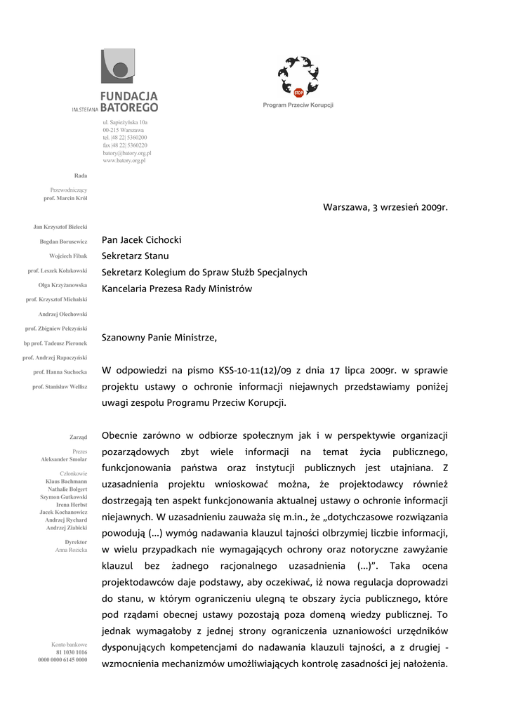 Program Przeciw Korupcji ul. Sapieżyńska 10a 00-215 Warszawa tel. |48 22| 5360200 fax |48 22| 5360220 [email protected] www.batory.org.pl Rada Przewodniczący prof. Marcin Król Warszawa, 3 wrzesień 2009r. Jan Krzysztof Bielecki Bogdan Borusewicz Wojciech Fibak prof. Leszek Kołakowski Olga Krzyżanowska Pan Jacek Cichocki Sekretarz Stanu Sekretarz Kolegium do Spraw Służb Specjalnych Kancelaria Prezesa Rady Ministrów prof. Krzysztof Michalski Andrzej Olechowski prof. Zbigniew Pełczyński bp prof. Tadeusz Pieronek Szanowny Panie Ministrze, prof. Andrzej Rapaczyński prof. Hanna Suchocka W odpowiedzi na pismo KSS-10-11(12)/09 z dnia 17 lipca 2009r. w sprawie prof. Stanisław Wellisz projektu ustawy o ochronie informacji niejawnych przedstawiamy poniżej uwagi zespołu Programu Przeciw Korupcji. Zarząd Prezes Aleksander Smolar Członkowie Klaus Bachmann Nathalie Bolgert Szymon Gutkowski Irena Herbst Jacek Kochanowicz Andrzej Rychard Andrzej Ziabicki Dyrektor Anna Rozicka Obecnie zarówno w odbiorze społecznym jak i w perspektywie organizacji pozarządowych zbyt funkcjonowania państwa uzasadnienia projektu wiele informacji oraz instytucji wnioskować na temat publicznych można, że życia jest publicznego, utajniana. projektodawcy Z również dostrzegają ten aspekt funkcjonowania aktualnej ustawy o ochronie informacji niejawnych. W uzasadnieniu zauważa się m.in., że „dotychczasowe rozwiązania powodują (...) wymóg nadawania klauzul tajności olbrzymiej liczbie informacji, w wielu przypadkach nie wymagających ochrony oraz notoryczne zawyżanie klauzul bez żadnego racjonalnego uzasadnienia (...)”. Taka ocena projektodawców daje podstawy, aby oczekiwać, iż nowa regulacja doprowadzi do stanu, w którym ograniczeniu ulegną te obszary życia publicznego, które pod rządami obecnej ustawy pozostają poza domeną wiedzy publicznej. To jednak wymagałoby z jednej strony ograniczenia uznaniowości urzędników Konto bankowe 81 1030 1016 0000 0000 6145 0000 dysponujących kompetencjami do nadawania klauzuli tajności, a z drugiej wzmocnienia mechanizmów umożliwiających kontrolę zasadności jej nałożenia. Lektura projektu nasuwa wątpliwości, czy projekt istotnie takie warunki tworzy. Wątpliwości te przedstawiamy poniżej: I. Poszerzenie obszaru uznaniowowści wyłączania informacji z domeny publicznej W aktualnym stanie prawnym w odniesieniu do ochrony tajemnicy państwowej nadanie określonej klauzuli tajności wiąże się ze spełnieniem dwóch przesłanek: (i) przesłanki ostrej – informacja, która ma być objęta klauzulą, musi mieścić się w wykazie rodzajów informacji stanowiącym załącznik nr 1 do ustawy; oraz (ii) przesłanki uznaniowej – klauzula może być nadana wówczas, gdy „ujawnienie [danej informacji] może spowodować istotne zagrożenie dla podstawowych interesów Rzeczypospolitej Polskiej dotyczących porządku publicznego, obronności, bezpieczeństwa, stosunków międzynarodowych lub gospodarczych państwa” (art. 2 pkt 1 ustawy o ochronie informacji niejawnych). Powyższe przesłanki muszą być spełnione łącznie, a więc do nadania klauzuli tajności obok oceny, że ujawnienie rodzi ryzyko dla interesów państwa, spełniony musi być i ten warunek, że informacja dotyczy jednego z obszarów, o których mowa w załączniku nr 1 do ustawy. Projekt nowej ustawy opisując w art. 5 sposób klasyfikowania informacji jako niejawne odchodzi od powyższej koncepcji. Klauzula tajności ma być nadawana w oparciu o przesłanki definiujące odpowiednio klauzule: „ściśle tajne”, „tajne”, „poufne”. W przeciwieństwie jednak do obecnego stanu prawnego odpada ostra przesłanka wyłączenia informacji z domeny publicznej. Definicje wymienionych powyżej klauzul opierają się bowiem wyłącznie na przesłankach ocennych (ujawnienie informacji „stwarzałoby nieodwracalne zagrożenie...”, szkody...”, „w „w istotny sposób zagrażałoby...”, „wyrządzałoby znacznym stopniu narażałoby uszczerbek...”, na „uniemożliwiałoby realizację...”, „osłabiłoby...”, „naraziłoby...” itd.). Projektodawcy proponują więc rozwiązanie, w którym decyzja o wyłączeniu danej informacji z obiegu publicznego będzie miała wyłącznie uznaniowy charakter. II. Osłabienie mechanizmów kontroli społecznej Rezygnacja z tzw. kafeterii, tj. wykazów zawartych w załączniku nr 1 do dziś obowiązującej ustawy, wydaje się ponadto ograniczać jedyny obecnie dostępny mechanizm kontroli prawidłowości nadawania klauzul, który może być wykorzystany przez podmioty zewnętrzne. System ochrony informacji niejawnych w Polsce jest skonstruowany w sposób, który w bardzo niewielkim zakresie dopuszcza kontrolę zewnętrzną nad ilością i celowością nadawanych klauzul. Jednym z nielicznych, a być może jedynym mechanizmem kontroli społecznej, jest skarga do sądu administracyjnego na podstawie art. 127 §1 k.p.a. w zw. z art. 16 ust. 2 Ustawy o dostępie do informacji publicznej. Osoba, której odmówiono udostępnienia informacji publicznej z powołaniem się na tajemnicę państwową może po wykorzystaniu środków odwoławczych skierować skargę do sądu administracyjnego na decyzję odmowną. Kontrola sądowa jest jednak - w myśl art. 1 § 2 Ustawy – Prawo o ustroju sądów administracyjnych – ograniczona wyłącznie do kryterium zgodności z prawem. Poza kognicją sądu pozostaje więc weryfikowanie, czy ujawnienie informacji stwarza ryzyka dla interesów państwa. W orzecznictwie przyjmuje się, że nadanie klauzuli może być poddane kontroli sądowej jedynie w wypadkach, gdy „przesłanką odmowy prawa dostępu do informacji publicznej będzie niezgodne z tą ustawą zastosowanie klauzuli tajności, np. przez nieuprawniony do tego organ lub w niewłaściwym trybie” (Wyrok NSA z 14.11.2003; II SA 2794/03). Podobnie w kognicji sądu mieścić się będzie ocena, czy klauzula została nadana zgodnie z