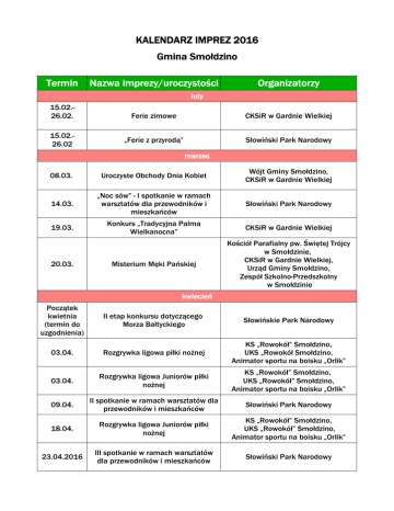 KALENDARZ IMPREZ 2016 Gmina Smołdzino Termin Nazwa imprezy/uroczystości Organizatorzy luty 15.02.26.02. 15.02.26.02 Ferie zimowe CKSiR w Gardnie Wielkiej „Ferie z przyrodą” Słowiński Park Narodowy marzec 08.03. Uroczyste Obchody Dnia Kobiet Wójt Gminy Smołdzino, CKSiR w Gardnie Wielkiej 14.03. „Noc sów” - I spotkanie w ramach warsztatów dla przewodników i mieszkańców Słowiński Park Narodowy 19.03. Konkurs „Tradycyjna Palma Wielkanocna” CKSiR w Gardnie Wielkiej Misterium Męki Pańskiej Kościół Parafialny pw. Świętej Trójcy w Smołdzinie, CKSiR w Gardnie Wielkiej, Urząd Gminy Smołdzino, Zespół Szkolno-Przedszkolny w Smołdzinie 20.03. kwiecień Początek kwietnia (termin do uzgodnienia) II etap konkursu dotyczącego Morza Bałtyckiego Słowińskie Park Narodowy 03.04. Rozgrywka ligowa piłki nożnej KS „Rowokół” Smołdzino, UKS „Rowokół Smołdzino, Animator sportu na boisku „Orlik” 03.04. Rozgrywka ligowa Juniorów piłki nożnej KS „Rowokół” Smołdzino, UKS „Rowokół” Smołdzino, Animator sportu na boisku „Orlik” 09.04. II spotkanie w ramach warsztatów dla przewodników i mieszkańców Słowiński Park Narodowy 18.04. Rozgrywka ligowa Juniorów piłki nożnej KS „Rowokół” Smołdzino, UKS „Rowokół” Smołdzino, Animator sportu na boisku „Orlik” 23.04.2016 III spotkanie w ramach warsztatów dla przewodników i mieszkańców Słowiński Park Narodowy maj 01.0503.05. Czarne Wesele Muzeum Wsi Słowińskiej w Klukach III Dycha po piachu Ochotnicza Straż Pożarna w Smołdzinie 01.05. Rozgrywka ligowa piłki nożnej KS „Rowokół” Smołdzino, UKS „Rowokół” Smołdzino, Animator sportu na boisku „Orlik” 01.05. Rozgrywka ligowa Juniorów piłki nożnej KS „Rowokół” Smołdzino, UKS „Rowokół” Smołdzino, Animator sportu na boisku „Orlik” Rozpoczęcie sezonu żeglarskiego Jacht Klub PTTK „Orion” Słupsk Rajd Pieszy szlakiem pni dębowych ROPTTK Słupsk, CKSiR w Gardnie Wielkiej 08.05 15.05. Spotkanie autorskie z okazji Święta Bibliotek Muzeum Pomorza Środkowego w Słupsku, Urząd Gminy Smołdzino, CKSiR w Gardnie Wielkiej 14.05. Św. Florian – Gminne obchody Święta Strażaków Urząd Gminy Smołdzino, CKSiR w Gardnie Wielkiej 15.05. Rozgrywka ligowa piłki nożnej KS „Rowokół” Smołdzino, UKS „Rowokół” Smołdzino, Animator sportu na boisku „Orlik” 15.05. Rozgrywka ligowa Juniorów piłki nożnej KS „Rowokół” Smołdzino, UKS „Rowokół” Smołdzino, Animator sportu na boisku „Orlik” 15.05. Regaty żeglarskie z okazji 70 – lecia PTTK Jacht Klub PTTK „Orion” Słupsk 25.05. Rozgrywka ligowa piłki nożnej KS „Rowokół” Smołdzino, UKS „Rowokół” Smołdzino Animator sportu na boisku „Orlik” 28.05. Rozgrywka ligowa Juniorów piłki nożnej KS „Rowokół” Smołdzino, UKS „Rowokół” Smołdzino, Animator sportu na boisku „Orlik” 25.05. Koncert „Tobie Mamo, Tobie Tato ...” CKSiR w Gardnie Wielkiej, Klub Aktywnych Sołectwa Smołdzino 01.05. 01.05. 03.05. czerwiec 01.06. „Ostoja Słowińska – przyrodniczą perłą Europy” Słowiński Park Narodowy 03.0604.06. XLVIII Rajd Pieszy po Słowińskim Parku Narodowym Klub Turystów Pieszych „Mikołajek” PTTK Słupsk 04.06. Regaty Żeglarskie o Puchar Dyrektora Słowińskiego Parku Narodowego Jacht Klub PTTK „Orion” Słupsk 03.06.05.06. Spływ kajakowy – XLI Ogólnopolski Zlot szlakami SPN Klub Turystyki Kajakowej PTTK „Kapok” w Słupsku 03.06.05.06. Rajd Rowerowy szlakami Słowińskiego Parku Narodowego Klub Turystyki PTTK „Jantar” w Słupsku 05.06. Rozgrywka ligowa piłki nożnej KS „Rowokół” Smołdzino, UKS „Rowokół” Smołdzino, Animator Sportu na boisku „Orlik” 05.06. Piknik Rodzinny z okazji Dnia Dziecka – teren świetlicy wiejskiej w Żelazie Wychowawca p. Jolanta Piszko, Klub Aktywnych Sołectwa Smołdzino 10.06. X Słowiński Turniej Ekologiczny o puchar Dyrektora Słowińskiego Parku Narodowego Słowiński Park Narodowy 11.06. Dzień Dziecka w Bunkrach Bluchera CKSiR w Gardnie Wielkiej 12.06. Festyn Rodzinny z okazji Dnia Dziecka Zespół Szkolno-Przedszkolny w Smołdzinie 18.06. Letnie zmagania brydżowe o Puchar Wójta Gminy Smołdzino – I tura Słupskie Towarzystwo Brydżowe, Urząd Gminy Smołdzino, CKSiR w Gardnie Wielkiej 26.06. IV Turniej Piłki Koszykowej o Puchar Wójta Gminy Smołdzino Animator Sportu na boisku „Orlik” Urząd Gminy Smołdzino, CKSiR w Gardnie Wielkiej Regaty o Puchar Prezesa RO PTTK w Słupsku Jacht Klub PTTK „Orion” Słupsk 26.06. lipiec 10.07. IV Turniej Sołectw w piłce siatkowej o Puchar Wójta Gminy Smołdzino Animator Sportu na boisku „Orlik”, Urząd Gminy Smołdzino, CKSiR w Gardnie Wielkiej II Festyn Smołdziński Urząd Gminy Smołdzino, CKSiR w Gardnie Wielkiej, Słowiński Park Narodowy, Zespół Szkolno-Przedszkolny w Smołdzinie, organizacje pozarządowe z terenu gminy. 22.07.26.07. Światowe Dni Młodzieży 2016 Urząd Gminy Smołdzino, Słowiński Park Narodowy, CKSiR w Gardnie Wielkiej, Parafia pw. Trójcy Świętej w Smołdzinie 23.07. Piknik – Smołdziński Las Słowiński Park Narodowy 23.07. Letnie zmagania brydżowe o Puchar Wójta Gminy Smołdzino – II tura Słupskie Stowarzyszenie Brydżowe, Urząd Gminy Smołdzino, CKSiR w Gardnie Wielkiej 16.07. Regaty o Puchar Wójta Gminy Smołdzino Jacht Klub PTTK „Orion” Słupsk 30.07. Piknik - Żelazo Stowarzyszenie Aktywności Lokalnej „Razem Zrobimy Wiele”, CKSiR w Gardnie Wielkiej 30.07. Zabawa taneczna przy muzyce mechanicznej Stowarzyszenie Aktywności Lokalnej „Razem Zrobimy Wiele”, CKSiR w Gardnie Wielkiej 24.07. sierpień II Rodzinny Piknik Ekologiczny i Wielki Dzień Pszczół Słowiński Park Narodowy 06.08. Ognisko integracyjne w Stojcinie CKSiR w Gardnie Wielkiej, Urząd Gminy Smołdzino, Sołectwo Stojcino 06.08. Uroczystość wręczenia sztandaru dla OSP Łokciowe Urząd Gminy Smołdzino, OSP Łokciowe