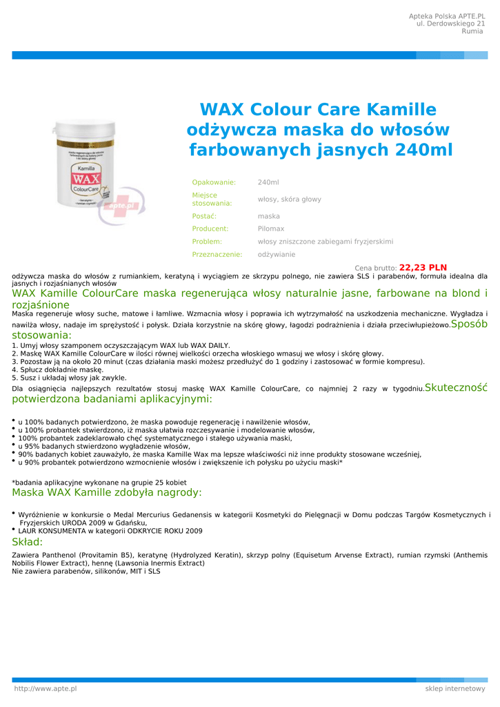 Apteka Polska APTE.PL ul. Derdowskiego 21 Rumia WAX Colour Care Kamille odżywcza maska do włosów farbowanych jasnych 240ml Opakowanie: 240ml Miejsce stosowania: włosy, skóra głowy Postać: maska Producent: Pilomax Problem: włosy zniszczone zabiegami fryzjerskimi Przeznaczenie: odżywianie Cena brutto: 22,23 PLN odżywcza maska do włosów z rumiankiem, keratyną i wyciągiem ze skrzypu polnego, nie zawiera SLS i parabenów, formuła idealna dla jasnych i rozjaśnianych włosów WAX Kamille ColourCare maska regenerująca włosy naturalnie jasne, farbowane na blond i rozjaśnione Maska regeneruje włosy suche, matowe i łamliwe. Wzmacnia włosy i poprawia ich wytrzymałość na uszkodzenia mechaniczne. Wygładza i nawilża włosy, nadaje im sprężystość i połysk. Działa korzystnie na skórę głowy, łagodzi podrażnienia i działa przeciwłupieżowo.Sposób stosowania: 1. 2. 3. 4. 5. Umyj włosy szamponem oczyszczającym WAX lub WAX DAILY. Maskę WAX Kamille ColourCare w ilości równej wielkości orzecha włoskiego wmasuj we włosy i skórę głowy. Pozostaw ją na około 20 minut (czas działania maski możesz przedłużyć do 1 godziny i zastosować w formie kompresu). Spłucz dokładnie maskę. Susz i układaj włosy jak zwykle. Dla osiągnięcia najlepszych rezultatów stosuj maskę WAX Kamille ColourCare, co najmniej 2 razy w tygodniu.Skuteczność potwierdzona badaniami aplikacyjnymi: u 100% badanych potwierdzono, że maska powoduje regenerację i nawilżenie włosów, u 100% probantek stwierdzono, iż maska ułatwia rozczesywanie i modelowanie włosów, 100% probantek zadeklarowało chęć systematycznego i stałego używania maski, u 95% badanych stwierdzono wygładzenie włosów, 90% badanych kobiet zauważyło, że maska Kamille Wax ma lepsze właściwości niż inne produkty stosowane wcześniej, u 90% probantek potwierdzono wzmocnienie włosów i zwiększenie ich połysku po użyciu maski* *badania aplikacyjne wykonane na grupie 25 kobiet Maska WAX Kamille zdobyła nagrody: Wyróżnienie w konkursie o Medal Mercurius Gedanensis w kategorii Kosmetyki do Pielęgnacji w Domu podczas Targów Kosmetycznych i Fryzjerskich URODA 2009 w Gdańsku, LAUR KONSUMENTA w kategorii ODKRYCIE ROKU 2009 Skład: Zawiera Panthenol (Provitamin B5), keratynę (Hydrolyzed Keratin), skrzyp polny (Equisetum Arvense Extract), rumian rzymski (Anthemis Nobilis Flower Extract), hennę (Lawsonia Inermis Extract) Nie zawiera parabenów, silikonów, MIT i SLS http://www.apte.pl sklep internetowy