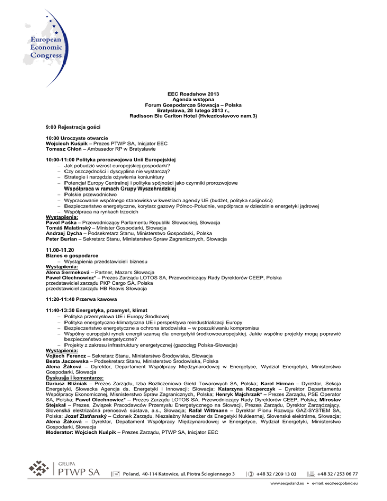 EEC Roadshow 2013 Agenda wstępna Forum Gospodarcze Słowacja – Polska Bratysława, 28 lutego 2013 r., Radisson Blu Carlton Hotel (Hviezdoslavovo nam.3) 9:00 Rejestracja gości 10:00 Uroczyste otwarcie Wojciech Kuśpik – Prezes PTWP SA, Inicjator EEC Tomasz Chłoń – Ambasador RP w Bratysławie 10:00-11:00 Polityka prorozwojowa Unii Europejskiej Jak pobudzić wzrost europejskiej gospodarki? Czy oszczędności i dyscyplina nie wystarczą? Strategie i narzędzia ożywienia koniunktury Potencjał Europy Centralnej i polityka spójności jako czynniki prorozwojowe Współpraca w ramach Grupy Wyszehradzkiej Polskie przewodnictwo Wypracowanie wspólnego stanowiska w kwestiach agendy UE (budżet, polityka spójności) Bezpieczeństwo energetyczne, korytarz gazowy Północ-Południe, współpraca w dziedzinie energetyki jądrowej Współpraca na rynkach trzecich Wystąpienia: Pavol Paška – Przewodniczący Parlamentu Republiki Słowackiej, Słowacja Tomáš Malatinský – Minister Gospodarki, Słowacja Andrzej Dycha – Podsekretarz Stanu, Ministerstwo Gospodarki, Polska Peter Burian – Sekretarz Stanu, Ministerstwo Spraw Zagranicznych, Słowacja 11.00-11.20 Biznes o gospodarce Wystąpienia przedstawicieli biznesu Wystąpienia: Alena Sermeková – Partner, Mazars Słowacja Paweł Olechnowicz* – Prezes Zarządu LOTOS SA, Przewodniczący Rady Dyrektorów CEEP, Polska przedstawiciel zarządu PKP Cargo SA, Polska przedstawiciel zarządu HB Reavis Słowacja 11:20-11:40 Przerwa kawowa 11:40-13:30 Energetyka, przemysł, klimat Polityka przemysłowa UE i Europy Środkowej Polityka energetyczno-klimatyczna UE i perspektywa reindustrializacji Europy Bezpieczeństwo energetyczne a ochrona środowiska – w poszukiwaniu kompromisu Wspólny europejski rynek energii szansą dla energetyki środkowoeuropejskiej. Jakie wspólne projekty mogą poprawić bezpieczeństwo energetyczne? Projekty z zakresu infrastruktury energetycznej (gazociąg Polska-Słowacja) Wystąpienia: Vojtech Ferencz – Sekretarz Stanu, Ministerstwo Środowiska, Słowacja Beata Jaczewska – Podsekretarz Stanu, Ministerstwo Środowiska, Polska Alena Žáková – Dyrektor, Departament Współpracy Międzynarodowej w Energetyce, Wydział Energetyki, Ministerstwo Gospodarki, Słowacja Dyskusja i komentarze: Dariusz Bliźniak – Prezes Zarządu, Izba Rozliczeniowa Giełd Towarowych SA, Polska; Karel Hirman – Dyrektor, Sekcja Energetyki, Słowacka Agencja ds. Energetyki i Innowacji; Słowacja; Katarzyna Kacperczyk – Dyrektor Departamentu Współpracy Ekonomicznej, Misnisterstwo Spraw Zagranicznych, Polska; Henryk Majchrzak* – Prezes Zarządu, PSE Operator SA, Polska; Paweł Olechnowicz* – Prezes Zarządu LOTOS SA, Przewodniczący Rady Dyrektorów CEEP, Polska; Miroslav Stejskal – Prezes, Związek Pracodawców Przemysłu Energetycznego na Słowacji, Prezes Zarządu, Dyrektor Zarządzający, Slovenská elektrizačná prenosová sústava, a.s., Słowacja; Rafał Wittmann – Dyrektor Pionu Rozwoju GAZ-SYSTEM SA, Polska; Jozef Zlatňanský – Członek Zarządu, Niezależny Menedżer ds Enegetyki Nuklearnej, Slovenské elektrárne, Słowacja; Alena Žáková – Dyrektor, Depatament Współpracy Międzynarodowej w Energetyce, Wydział Energetyki, Ministerstwo Gospodarki, Słowacja Moderator: Wojciech Kuśpik – Prezes Zarządu, PTWP SA, Inicjator EEC 13:30-14:00 Lunch 14:00-17:00 Debaty gospodarcze 14:00-15:15 Współpraca gospodarcza Słowacji i Polski wobec spowolnienia gospodarczego w Europie Parametry i prognozy makroekonomiczne Inwestycje. Skala i potencjał – branże rozwojowe. Przykłady wspólnych przedsięwzięć. Inwestycje Polski na Słowacji i vice versa Współpraca na rynkach trzecich Oferta Giełdy Papierów Wartościowych w Warszawie. Możliwości pozyskiwania kapitału przez spółki słowackie Głos w debacie: Ľudovít Černák – Członek Rady, Krajowy Związek Pracodawców, Słowacja; Andrzej Dycha – Podsekretarz Stanu, Ministerstwo Gospodarki, Polska; Jacek Goliszewski – Dyrektor Działu Doradztwa, Mazars, Polska; Julius Krivan – Dyrektor Handlowy, Železiarne Podbrezová, Prezes, Klub 500, Słowacja; Renata Juszkiewicz – Prezes, Central Eastern European Commerce Council; Sławomir Majman – Prezes, Polska Agencja Informacji i Inwestycji Zagranicznych, Polska; Ján Mišura – Prezes, Dyrektor, Słowacka Izba Przemysłu i Handlu, Dyrektor, Żylińska Regionalna Izba, Słowacja; Izabela Olszewska – Dyrektor Pionu Rozwoju Rynku, Giełda Papierów Wartościowych w Warszawie; Dagmar Repcekova – Dyrektor Generalna, Sekcja Współpracy Gospodarczej, Ministerstwo Spraw Zagranicznych, Słowacja; Róbert Šimončič – Dyrektor Zarządzający, Słowacka Agencja Rozwoju Inwestycji i Handlu, Słowacja; Moderator: Wojciech Kuśpik – Prezes Zarządu, PTWP SA, Inicjator EEC Prezentacje: Renata Juszkiewicz – Prezes, Central Eastern European Commerce Council Izabela Olszewska – Dyrektor Pionu Rozwoju Rynku, Giełda Papierów Wartościowych w Warszawie 15:15-16:00 Infrastruktura Słowacja i Polska w europejskim korytarzu transportowym Północ-Południe. Spójność i mobilność – inwestycje komunikacyjne po obu stronach granicy Rynek przewozów towarowych Wystąpienie: Andrzej Massel – Podsekretarz Stanu, Ministerstwo Transportu, Budownictwa i Gospodarki Morskiej, Polska Głos w debacie: Jacek Gryga* – Dyrektor Oddziału w Krakowie, Generalna Dyrekcja Dróg Krajowych i Autostrad, Polska; Karel Klimeš*– Menadżer ds. transportu międzynarodowego, Geis Global Logistics, Słowacja; Vladimír Ľupták – Prezes Zarządu, Dyrektor Zarządzający, ZSSK Cargo, Słowacja; Krzysztof Szymborski – Prezes Zarządu, Bałtycki Terminal Kontenerowy, Polska; przedstawiciel zarządu PKP Cargo SA, Polska Moderator: Wojciech Kuśpik – Prezes Zarządu, PTWP SA, Inicjator EEC 16:00-17:00 Samorządy, turystyka Wspólne projekty podnoszące atrakcyjność turystyczną Transgraniczna współpraca samorz