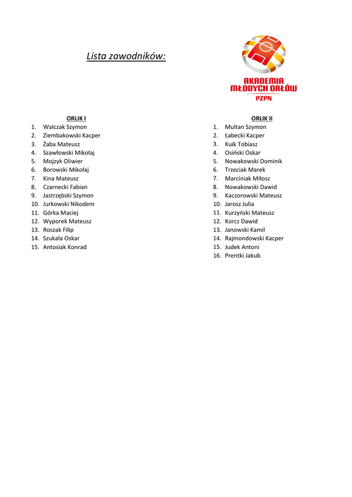 Lista zawodników: 1. 2. 3. 4. 5. 6. 7. 8. 9. 10. 11. 12. 13. 14. 15. ORLIK I Walczak Szymon Ziembakowski Kacper Żaba Mateusz Szawłowski Mikołaj Mojzyk Oliwier Borowski Mikołaj Kina Mateusz Czarnecki Fabian Jastrzębski Szymon Jurkowski Nikodem Górka Maciej Wyporek Mateusz Roszak Filip Szukała Oskar Antosiak Konrad 1. 2. 3. 4. 5. 6. 7. 8. 9. 10. 11. 12. 13. 14. 15. 16. ORLIK II Multan Szymon Łabecki Kacper Kuik Tobiasz Osiński Oskar Nowakowski Dominik Trzeciak Marek Marciniak Miłosz Nowakowski Dawid Kaczorowski Mateusz Jarosz Julia Kurzyński Mateusz Korcz Dawid Janowski Kamil Rajmondowski Kacper Judek Antoni Prentki Jakub 1. 2. 3. 4. 5. 6. 7. 8. 9. 10. 11. 12. 13. 14. ŻAK I Łunkiewicz Cyprian Ogrodowczyk Kamil Marczak Artur Sobótka Bartosz Kocot Wiktor Cypryniak Aleksander Pakuła Samuel Pastuszek Konrad Sulimenko Gracjan Przymuszała Stanisław Dawidowicz Kornel Sawicki Patryk Farbotko Gabriel Kozłowski Igor SKRZAT 1. Witkowski Mikołaj 2. Iwiński Karol 3. Graff Szymon 4. Lechert Jan 5. Myśliński Krzysztof 6. Iwanicki Krzysztof 7. Woszczyk Michał 8. Jaruta Tymoteusz 9. Wysocki Oliwier 10. Ernest Aleksander 11. Krajewski Kacper 12. Orzłowski Jan 13. Forszt Aleksander 14. Krakowski Jan 15. Tomaszewski Hubert 1. 2. 3. 4. 5. 6. 7. 8. 9. 10. 11. 12. 13. 14. 15. 16. ŻAK II Furmanek Oliwier Dobrowolski Karol Ksiądz Kornel Łyczko Michał Stachowiak Alan Rembas Patryk Konik Marcel Grządko Szymon Żeleźniak Gabriel Dyrla Filip Grocholewski Karol Ambrożak Jan Malicki Tymoteusz Puławski Kacper Pluciński Eryk Ebert Aleksander