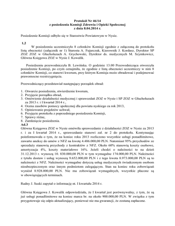 Protokół Nr 46/14 z posiedzenia Komisji Zdrowia i Opieki Społecznej z dnia 8.04.2014 r. Posiedzenie Komisji odbyło się w Starostwie Powiatowym w Nysie. 1,2 W posiedzeniu uczestniczyło 8 członków Komisji zgodnie z załączoną do protokołu listą obecności (załącznik nr 1) Starosta A. Fujarczuk, Kierownik J. Kordasz, Dyrektor SP ZOZ ZOZ w Głuchołazach A. Grychowski, Dyrektor ds. medycznych M. Szymkowicz, Główna Księgowa ZOZ w Nysie J. Kowalik. Posiedzeniu przewodniczyła B. Lewińska. O godzinie 13.00 Przewodnicząca otworzyła posiedzenie Komisji, po czym oznajmiła, że zgodnie z listą obecności uczestniczy w nim 8 członków Komisji, co stanowi kworum, przy którym Komisja może obradować i podejmować prawomocne rozstrzygnięcia. Przewodniczący przedstawiał następujący porządek obrad: 1. Otwarcie posiedzenia, stwierdzenie kworum, 2. Przyjęcie porządku obrad, 3. Omówienie działalności medycznej i sprawozdań ZOZ w Nysie i SP ZOZ w Głuchołazach za 2013 r. i I kwartał 2014 r., 4. Ocena zasobów pomocy społecznej dla powiatu nyskiego za rok 2013, 5. Opiniowanie projektów uchwał, 6. Przyjęcie protokołu z poprzedniego posiedzenia Komisji, 7. Sprawy różne, 8. Zamknięcie posiedzenia. Ad.3 Główna Księgowa ZOZ w Nysie omówiła sprawozdanie z działalności ZOZ w Nysie za 2013 r. i za I kwartał 2014 r., sprawozdanie stanowi zał. nr 2 do protokołu. Kontynuując poinformowała o tym, że na koniec roku 2013 rozliczono wszystkie usługi ponadlimitowe, zawarto aneksy do umów z NFZ na kwotę 4.486.000,00 PLN. Natomiast 95% przychodów ze sprzedaży stanowią przychody z kontraktów z NFZ. Około 60% stanowią koszty osobowe, amortyzacja 4%, koszty materiałowe 16%. Jeżeli chodzi o należności to na dzień 31.12.2013 r. wynoszą 10. 830.000,00 PLN w tym wymagalne 174.000,00 PLN. Należności z tytułu dostaw i usług wynoszą 9.652.000,00 PLN i z tego kwota 8.973.000,00 PLN są to należności z NFZ. Należności wymagalne dotyczą usług medycznych świadczonym osobom nieubezpieczonym oraz innym podmiotom zalegającym. Stan na koniec roku zobowiązań wyniósł 8.928.000,00 PLN. Nie ma zobowiązań wymagalnych, wszystkie płacone są w obowiązujących terminach. Radny J. Suski zapytał o informację nt. I kwartału 2014 r. Główna Księgowa J. Kowalik odpowiedziała, że I kwartał jest porównywalny, z tym, że są już usługi ponadlimitowe na koniec marca br. na około 900.000,00 PLN. W związku z tym przygotowuje się odpis aktualizujący, ponieważ nie ma gwarancji, że zostaną zapłacone. Przewodnicząca Komisji B. Lewińska zapytała w jakim zakresie wykonuje się najwięcej usług ponadlimitowych. Dyrektor ds. Medycznych M. Szymkowicz odpowiedział, że w przypadku chorób wewnętrznych, w chirurgii ogólnej pomimo zwiększonego kontraktu. Starosta A. Fujarczuk poinformował, że przedmiotowe sprawozdanie zostało pozytywnie ocenione przez Radę Społeczną ZOZ w Nysie oraz przez Zarząd Powiatu w Nysie. Radny K. Rozumek zapytał o zapis w informacji dotyczący uruchomienia w przypadku kiedy NFZ nie wyraziłby woli kontraktowania oddziału reumatologii w Paczkowie dziennego oddziału reumatologii, gdzie procedury byłyby wykonywane w ramach zakładu fizjoterapii. Zapytał czy jest to nowa komórka organizacyjna. Dyrektor M. Szymkowicz odpowiedział, że nie jest to jeszcze nowa komórka organizacyjna jest oddział rehabilitacji na Oddziale w Szpitalu w Paczkowie. Do końca roku na pewno się nic nie zmieni ale trzeba być przygotowanym na to, że NFZ nie będzie kontraktował tych usług, ponieważ uznano, że jeden oddział reumatologii w Szpitalu w Kup wystarczy. Dlatego podejmowane są działania zabezpieczające. Radny K. Rozumek zapytał w jaki sposób została rozwiązana kwestia przygotowywania dokumentacji medycznej. Dyrektor M. Szymkowicz odpowiedział, że dzięki systemowi komputerowemu, który jest stale unowocześniany sytuacja nie jest najgorsza. Jednak przy tym programie komputerowym brakuje modułu bloku operacyjnego, modułu poradni oraz przenośnych stacji (tablety). Dodał, że dokumentacja każdego pacjenta jest bardzo obszerna. Radny K. Rozumek zapytał o koszt rezonansu magnetycznego. Dyrektor M. Szymkowicz odpowiedział, że rezonans magnetyczny jest w firmie zewnętrznej. Jest to firma, która wpasowuje się w naszą politykę głównie tym, że w tej chwili kontraktując świadczenia trzeba się wykazać zwłaszcza w neurologii możliwością wykonywania badań radiologicznych rezonansu magnetycznego w miejscu. Dlatego firma zewnętrzna, która tą inwestycję prowadzi buduje pod tym samym adresem, gdzie znajduje się siedziba Szpitala. Rezonans ma funkcjonować od kwietnia br. Komisja pozytywnie zaopiniowała sprawozdanie z działalności medycznej ZOZ w Nysie za 2013 r. oraz za I kwartał 2014 r. Dyrektor A. Grychowski przedstawił sprawozdanie z działalności medycznej SP ZOZ ZOZ w Głuchołazach za 2013 r. oraz za I kwartał 214 r. Kontynuując powiedział, że 2013 r. został zakończony zyskiem w wysokości 231.648,00 PLN, co wynikało z tego, że łączne koszty w 2013 r. wynosiły 20.189.406, 00 PLN, natomiast łączne koszty działalności 19.957.757,00 PLN. Istotnym elementem było zapłacenie wszystkich wygenerowanych nadwykonań. Realizowano program polegający na poprawie warunków bytowych Szpitala w Głuchołazach. Udało się wyremontować oddziały oraz zakupić potrzebny sprzęt. Połączono dwa systemy informatyczne pomiędzy Szpitalem nr 1 i 2. Jeżeli chodzi o sytuację ekonomiczną i finansową na podstawie opinii biegłego rewidenta ulegają dalszej systematycznej poprawie. Ponadto w 2013 r. udało się zmniejszyć zobowiązania wymagalne. Na koniec roku szpital posiadał gotówkę finansową i dzięki temu jest zabezpieczenie finansowe na wypłatę zobowiązań lub nieprzewidziane sytuacje. Poinformował również o planowanym udziale w programie oraz o oczekiwaniu na rozstrzygnięcie dotyc