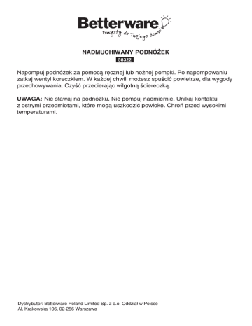 Nadmuchiwany podnóżek 58322 Napompuj podnóżek za pomocą ręcznej lub nożnej pompki. Po napompowaniu zatkaj wentyl koreczkiem. W każdej chwili możesz spuścić powietrze, dla wygody przechowywania. Czyść przecierając wilgotną ściereczką. UWAGA: Nie stawaj na podnóżku. Nie pompuj nadmiernie. Unikaj kontaktu z ostrymi przedmiotami, które mogą uszkodzić powłokę. Chroń przed wysokimi temperaturami. Dystrybutor: Betterware Poland Limited Sp. z o.o. Oddział w Polsce Al. Krakowska 106, 02-256 Warszawa