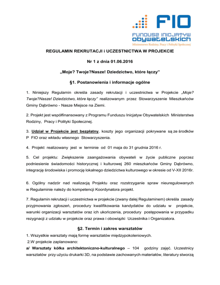 REGULAMIN REKRUTACJI i UCZESTNICTWA W PROJEKCIE Nr 1 z dnia 01.06.2016 „Moje? Twoje?Nasze! Dziedzictwo, które łączy” §1. Postanowienia i informacje ogólne 1. Niniejszy Regulamin określa zasady rekrutacji i uczestnictwa w Projekcie „Moje? Twoje?Nasze! Dziedzictwo, które łączy” realizowanym przez Stowarzyszenie Mieszkańców Gminy Dąbrówno - Nasze Miejsce na Ziemi. 2. Projekt jest współfinansowany z Programu Funduszu Inicjatyw Obywatelskich Ministerstwa Rodziny, Pracy i Polityki Społecznej. 3. Udział w Projekcie jest bezpłatny, koszty jego organizacji pokrywane są ze środków P FIO oraz wkładu własnego Stowarzyszenia. 4. Projekt realizowany jest w terminie od 01 maja do 31 grudnia 2016 r. 5. Cel projektu: Zwiększenie zaangażowania obywateli w życie publiczne poprzez podniesienie świadomości historycznej i kulturowej 260 mieszkańców Gminy Dąbrówno, integrację środowiska i promocję lokalnego dziedzictwa kulturowego w okresie od V-XII 2016r. 6. Ogólny nadzór nad realizacją Projektu oraz rozstrzyganie spraw nieuregulowanych w Regulaminie należy do kompetencji Koordynatora projekt. 7. Regulamin rekrutacji i uczestnictwa w projekcie (zwany dalej Regulaminem) określa zasady przyjmowania zgłoszeń, procedury kwalifikowania kandydatów do udziału w projekcie, warunki organizacji warsztatów oraz ich ukończenia, procedury postępowania w przypadku rezygnacji z udziału w projekcie oraz prawa i obowiązki Uczestnika i Organizatora. §2. Termin i zakres warsztatów 1. Wszystkie warsztaty mają formę warsztatów międzypokoleniowych. 2.W projekcie zaplanowano: a/ Warsztaty kółka architektoniczno-kulturalnego – 104 godziny zajęć. Uczestnicy warsztatów przy użyciu drukarki 3D, na podstawie zachowanych materiałów, literatury stworzą replikę dawnych zabudowań Dąbrówna, które następnie złożą się na makietę wykonaną w technice 3D. Podczas zajęć będą mogli dowiedzieć się, co zachowało się z dawnych, zabytkowych zabudowań, jak było kiedyś a jak jest teraz. Makieta, po jej wykonaniu prezentowana będzie (ekspozycja stała) w Gminnym Centrum Kulturalno-Bibliotecznym w Dąbrównie lokalnej społeczności oraz odwiedzających gminę turystów. Spotkania odbywać się będą 2 x w tygodniu, od VII-XII.2016 r. po 2 godziny. Liczba uczestników: 15 osób. b/ Warsztaty fotograficzne pod nazwą „Gmina Dąbrówno- miejsce z ciekawą historią”144 godz. zajęć. Warsztaty dla grupy 15 osób (dzieci, młodzież, dorośli, seniorzy). Spotkania 2 razy w tygodniu po 3 godziny w okresie VII-XII. 2016 r. Tematyką warsztatów będzie fotografia zabytków, krajobrazów, wydarzeń i ludzi gminy. Warsztaty obejmą: -fotografię plenerową, -obróbkę komputerową zdjęć w programie Photoshop, zdjęcia czarno-białe, renowacja starych zdjęć itp., - przeprowadzenie konkursu - wybór autora najładniejszego zdjęcia z warsztatów (w ramach projektu zostanie przyznana nagroda dla uczestnika). Wyboru dokona Komisja konkursowa w składzie: prowadzący warsztaty, Dyrektor Gminnego Centrum Kulturalno-Bibliotecznego, przedstawiciel Urzędu Gminy w Dąbrównie, -na zakończenie warsztatów przygotowanie wystawy prac uczestników, oraz przygotowanie materiałów fotograficznych i graficznych do publikacji, - opracowanie i wydanie albumu „Gmina Dąbrówno- miejsce z ciekawą historią” w nakładzie 300 szt. Warsztaty zostaną połączone z warsztatami terenowymi i będą prowadzone w świetlicach wiejskich w poszczególnych miejscowościach gminy. W trakcie warsztatów terenowych Uczestnicy sfotografują zabytki, ciekawe miejsca w sołectwach w gminie Dąbrówno (18 sołectw). Gospodarzami tych spotkań będą sołtysi i członkowie rad sołeckich (zaangażowanie członków wspólnoty lokalnej). Sołtysi oprowadzą ich po ciekawych miejscach w swoich sołectwach. c/ Warsztaty ikonopisarstwa – 40 godz. zajęć. Celem warsztatów będzie przygotowanie teoretyczne i praktyczne 15 osób(warsztaty międzypokoleniowe: dzieci, młodzież, dorośli, seniorzy) w zakresie ikonopisarstwa. Uczestnicy warsztatów zapoznają się z prawidłowymi technikami rozrysowywania ikony, wykonywania w gruncie podrzeźbień i przygotowaniem podłoża pod złocenie. W ramach warsztatów planuje się: pracę ze szlagmetalem, malowanie ikony, poznanie historii techniki tempery jajowej, historii ikonopisarstwa, rozłamu w Kościele i tworzących się nowych nurtów w malarstwie sakralnym, rodzajów ikonostasów i znaczenia miejsca ikon w poszczególnych rzędach, kolory i kamienie szlachetne i ich znaczenie, analizę wybranych ikon, ciekawostki związane z atrybutami świętych. Spotkania 2 razy w tygodniu po 2 godz., od IX-XI. 2016 r. Wykonane przez uczestników ikony zostaną zaprezentowane na ścianach domu kultury w Dąbrównie i będą stanowiły wystawę stałą placówki. d/Questing – 96 godz. zajęć. Questing to nowa forma poznawania dziedzictwa kulturowego i przyrodniczego regionu. To metoda odkrywania dziedzictwa miejsca polegająca na tworzeniu nieoznakowanych szlaków, którymi można wędrować, kierując się informacjami zawartymi w wierszowanych wskazówkach. Kolejne miejsca na trasie odnajduje się poprzez znalezienie odpowiedzi na zagadkę i wyszukanie w terenie odpowiadającego jej miejsca. Na końcu szlaku jest umieszczona skrzyneczka, a w niej pieczątka, której odbicie potwierdza przebycie całej trasy. W ramach tego zadania zostaną przeprowadzone 2-dniowe WARSZTATY pn. „Odkrywanie dziedzictwa miejsca -warsztaty edukacji regionalnej metodą questing”, z udziałem młodzieży oraz przedstawicieli organizacji pozarządowych, nauczycieli i pasjonatów turystyki. Następnie grupa – 15 uczestników wypracuje pieszy Quest (ŚCIEŻKA KULTUROWA) po zabytkach Dąbrówna pod nazwą „Dziedzictwo kulturowe Dąbrówna”. Uczestnicy opracują mapę i dokonają oznakowania szlaku. W ramach tych zajęć postawione zostaną tablice opisujące ciekawe i waż