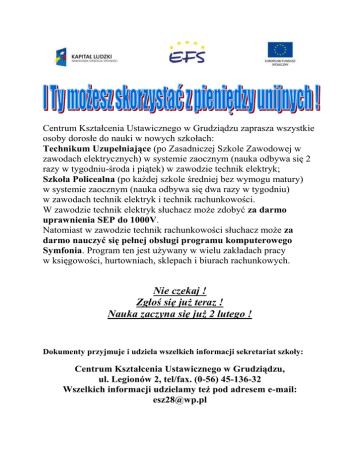 Centrum Kształcenia Ustawicznego w Grudziądzu zaprasza wszystkie osoby dorosłe do nauki w nowych szkołach: Technikum Uzupełniające (po Zasadniczej Szkole Zawodowej w zawodach elektrycznych) w systemie zaocznym (nauka odbywa się 2 razy w tygodniu-środa i piątek) w zawodzie technik elektryk; Szkoła Policealna (po każdej szkole średniej bez wymogu matury) w systemie zaocznym (nauka odbywa się dwa razy w tygodniu) w zawodach technik elektryk i technik rachunkowości. W zawodzie technik elektryk słuchacz może zdobyć za darmo uprawnienia SEP do 1000V. Natomiast w zawodzie technik rachunkowości słuchacz może za darmo nauczyć się pełnej obsługi programu komputerowego Symfonia. Program ten jest używany w wielu zakładach pracy w księgowości, hurtowniach, sklepach i biurach rachunkowych. Nie czekaj ! Zgłoś się już teraz ! Nauka zaczyna się już 2 lutego ! Dokumenty przyjmuje i udziela wszelkich informacji sekretariat szkoły: Centrum Kształcenia Ustawicznego w Grudziądzu, ul. Legionów 2, tel/fax. (0-56) 45-136-32 Wszelkich informacji udzielamy też pod adresem e-mail: [email protected]