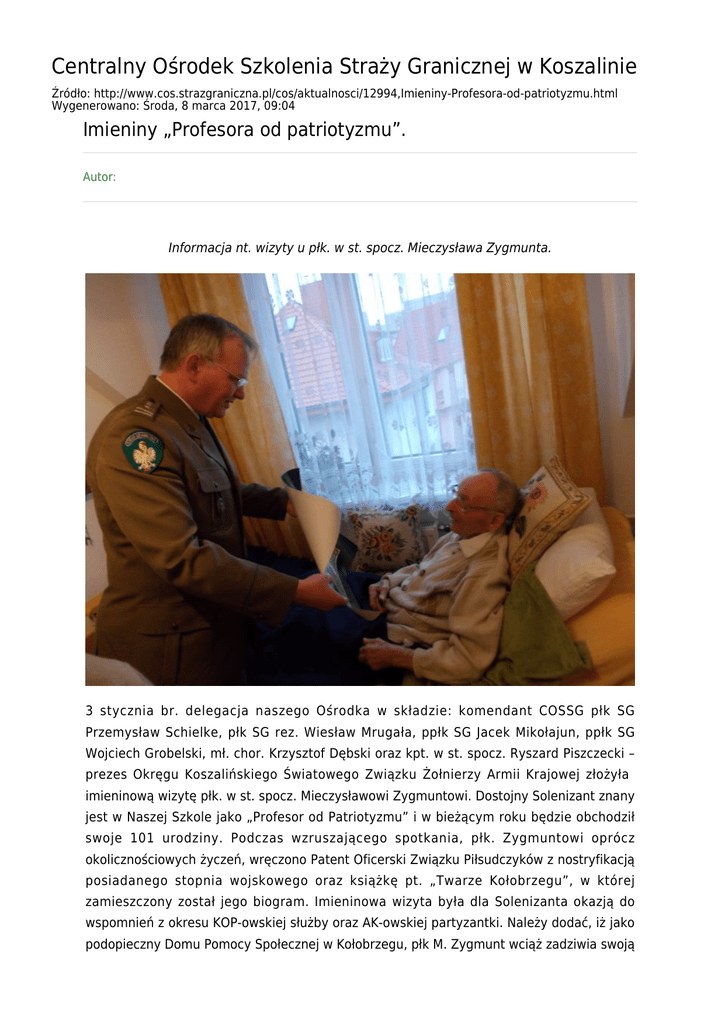 Centralny Ośrodek Szkolenia Straży Granicznej w Koszalinie Źródło: http://www.cos.strazgraniczna.pl/cos/aktualnosci/12994,Imieniny-Profesora-od-patriotyzmu.html Wygenerowano: Środa, 8 marca 2017, 09:04 Imieniny „Profesora od patriotyzmu”. Autor: Informacja nt. wizyty u płk. w st. spocz. Mieczysława Zygmunta. 3 stycznia br. delegacja naszego Ośrodka w składzie: komendant COSSG płk SG Przemysław Schielke, płk SG rez. Wiesław Mrugała, ppłk SG Jacek Mikołajun, ppłk SG Wojciech Grobelski, mł. chor. Krzysztof Dębski oraz kpt. w st. spocz. Ryszard Piszczecki – prezes Okręgu Koszalińskiego Światowego Związku Żołnierzy Armii Krajowej złożyła imieninową wizytę płk. w st. spocz. Mieczysławowi Zygmuntowi. Dostojny Solenizant znany jest w Naszej Szkole jako „Profesor od Patriotyzmu” i w bieżącym roku będzie obchodził swoje 101 urodziny. Podczas wzruszającego spotkania, płk. Zygmuntowi oprócz okolicznościowych życzeń, wręczono Patent Oficerski Związku Piłsudczyków z nostryfikacją posiadanego stopnia wojskowego oraz książkę pt. „Twarze Kołobrzegu”, w której zamieszczony został jego biogram. Imieninowa wizyta była dla Solenizanta okazją do wspomnień z okresu KOP-owskiej służby oraz AK-owskiej partyzantki. Należy dodać, iż jako podopieczny Domu Pomocy Społecznej w Kołobrzegu, płk M. Zygmunt wciąż zadziwia swoją energią i działalnością społeczną, bowiem pełni tam funkcję … przewodniczącego Rady. Na zakończenie wizyty oprócz życzeń nieustającego zdrowia, „Profesor od Patriotyzmu” otrzymał zaproszenie do odwiedzenia koszalińskiego Ośrodka i spotkania ze słuchaczami. Zaproszenie zostało przyjęte! 2013/01/rozne_DSCN4741.JPG