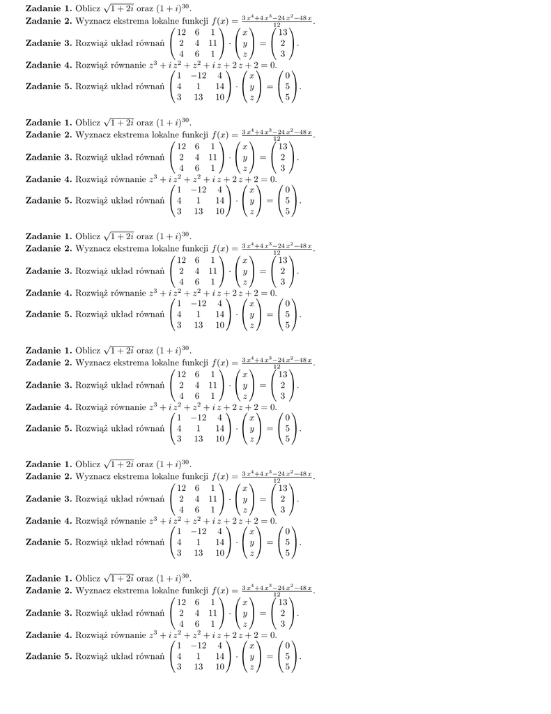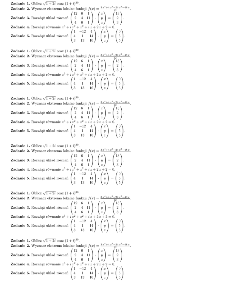 √ Zadanie 1. Oblicz 1 + 2i oraz (1 + i)30 . 3 x4 +4 x3 −24 x2 −48 x Zadanie 2. Wyznacz ekstrema lokalne . funkcji f (x) = 12 12 6 1 x 13 Zadanie 3. Rozwiąż układ równań 2 4 11 · y = 2 . 4 6 1 z 3 Zadanie 4. Rozwiąż równanie z 3 + i z 2 + z 2 + i z +2 z+ 2= 0. 1 −12 4 x 0 Zadanie 5. Rozwiąż układ równań 4 1 14 · y = 5 . 3 13 10 z 5 √ Zadanie 1. Oblicz 1 + 2i oraz (1 + i)30 . 3 x4 +4 x3 −24 x2 −48 x . Zadanie 2. Wyznacz ekstrema lokalne funkcji f (x) = 12 12 6 1 x 13 Zadanie 3. Rozwiąż układ równań 2 4 11 · y = 2 . 4 6 1 z 3 Zadanie 4. Rozwiąż równanie z 3 + i z 2 + z 2 + i z +2 z+ 2= 0. 1 −12 4 x 0 Zadanie 5. Rozwiąż układ równań 4 1 14 · y = 5 . 3 13 10 z 5 √ Zadanie 1. Oblicz 1 + 2i oraz (1 + i)30 . 3 x4 +4 x3 −24 x2 −48 x Zadanie 2. Wyznacz ekstrema lokalne . = 12 funkcji f (x) 13 x 12 6 1 Zadanie 3. Rozwiąż układ równań 2 4 11 · y = 2 . 3 z 4 6 1 Zadanie 4. Rozwiąż równanie z 3 + i z 2 + z 2 + i z +2 z+ 2= 0. 0 x 1 −12 4 Zadanie 5. Rozwiąż układ równań 4 1 14 · y = 5 . 5 z 3 13 10 √ Zadanie 1. Oblicz 1 + 2i oraz (1 + i)30 . 3 x4 +4 x3 −24 x2 −48 x Zadanie 2. Wyznacz ekstrema lokalne . = 12 funkcji f (x) 13 x 12 6 1 Zadanie 3. Rozwiąż układ równań 2 4 11 · y = 2 . 3 z 4 6 1 Zadanie 4. Rozwiąż równanie z 3 + i z 2 + z 2 + i z +2 z+ 2= 0. 0 x 1 −12 4 Zadanie 5. Rozwiąż układ równań 4 1 14 · y = 5 . 5 z 3 13 10 √ Zadanie 1. Oblicz 1 + 2i oraz (1 + i)30 . 3 x4 +4 x3 −24 x2 −48 x Zadanie 2. Wyznacz ekstrema lokalne . funkcji f (x) = 12 12 6 1 x 13 Zadanie 3. Rozwiąż układ równań 2 4 11 · y = 2 . 4 6 1 z 3 Zadanie 4. Rozwiąż równanie z 3 + i z 2 + z 2 + i z +2 z+ 2= 0. 1 −12 4 x 0 Zadanie 5. Rozwiąż układ równań 4 1 14 · y = 5 . 3 13 10 z 5 √ Zadanie 1. Oblicz 1 + 2i oraz (1 + i)30 . 3 x4 +4 x3 −24 x2 −48 x Zadanie 2. Wyznacz ekstrema lokalne . funkcji f (x) = 12 12 6 1 x 13 Zadanie 3. Rozwiąż układ równań 2 4 11 · y = 2 . 4 6 1 z 3 3 2 2 Zadanie 4. Rozwiąż równanie z + i z + z + i z +2 z+ 2= 0. 1 −12 4 x 0 Zadanie 5. Rozwiąż układ równań 4 1 14 · y = 5 . 3 13 10 z 5