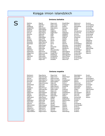 Księga imion islandzkich S Imiona żeńskie Sabína Saga Salbjörg Salgerður Salome Salóme Salvör Sandra Sara Selja Selma Seselía Sesselía Sesselja Sif Sigdís Sigfríð Sigfríður Sigfúsína Siggerður Signa Signhild Signý Sigra Sigrid Sigríður Sigrún Sigurásta Sigurbjörg Sigurbjört Sigurborg Sigurdís Sigurey Sigurfljóð Sigurfríð Sigurgyða Sigurhanna Sigurjóna Sigurlaug Sigurleif Sigurlilja Sigurlín Sigurlína Sigurmunda Sigurósk Sigurpála Sigurragna Sigurrós Sigurunn Sigurveig Sigurvina Sigurþóra Sigyn Sigþóra Sigþrúður Silja Silla Silley Silva Silvía Sine Sirrý Siv Símonía Sjöfn Skarpheiður Snekkja Snjáfríður Snjólaug Snæbjörg Snæborg Snædís Snæfríður Snærún Soffía Solveig Sonja Sonný Sólbjörg Sólbjört Sólborg Sólbrá Sóldís Sóley Sólný Sólrún Sólveig Stefanía Stefánny Steina Steinbjörg Steindóra Steingerður Steinhildur Steinlaug Steinrún Steinunn Steinvör Steinþóra Stella Stína Styrgerður Sumarrós Sunna Sunneva Súsanna Svafa Svala Svana Svanbjörg Svanbjört Svanborg Svandís Svanfríður Svanhild Svanhildur Svanhvít Svanlaug Svanlaugur Svava Sveina Sveinbjörg Sveinborg Sveindís Sveinfríður Sveingerður Sveinhildur Sveinlaug Sveinrún Sveinsína Sylvía Sæbjörg Sæfinna Sæfríður Sædís Sælaug Sæmunda Særós Særún Sæunn Steinbjörn Steindór Steingrímur Steini Steinn Steinmar Steinmóður Steinólfur Steinþór Stígur Sturla Sturlaugur Styrkár Styrmir Sumarliði Susanna Svafar Svan Svanberg Svanlaugur Svanur Svanþór Svavar Sváfnir Svein Sveinar Sveinbjörn Sveinlaugur Sveinmar Sveinn Sveinþór Sverrir Sæbjörn Sæmundur Sævar Sævin Sæþór Sölvi Sören Imiona męskie Salmann Salómon Salvar Samson Samúel Sarah Sebastian Sesar Sigbjörn Sigdór Sigður Sigfinnur Sigfús Siggeir Sighvatur Sigjón Siglaugur Sigmann Sigmar Sigmundur Sigríkur Sigsteinn Sigtryggur Sigurbaldur Sigurberg Sigurbergur Sigurbjarni Sigurbjartur Sigurbjörn Sigurbrandur Sigurdór Sigurður Sigurfinnur Sigurgarður Sigurgeir Sigurgestur Sigurgísli Sigurgrímur Sigurhans Sigurhjörtur Siguringi Sigurjón Sigurkarl Sigurlaugur Sigurleifur Sigurlinni Sigurlínus Sigurmann Sigurmar Sigurmon Sigurmundi Sigurmundur Siguroddur Siguróli Sigurpáll Sigursteinn Sigursveinn Sigurvaldi Sigurvin Sigurþór Sigvaldi Sigvarður Sigþór Sindri Sissel Símon Skafti Skapti Skarphéðinn Skeggi Skírnir Skjöldur Skúli Skæringur Smári Snjólaugur Snjólfur Snorri Snæbjörn Snæfríð Snær Snævar Snæþór Sophaporn Sophus Sófus Sólberg Sólbjartur Sólmundur Sólon Starri Stefán Stefnir Steinar Steinarr Steinberg