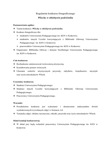 Regulamin konkursu fotograficznego Włochy w obiektywie podróżnika Postanowienia ogólne: Temat konkursu: Włochy w obiektywie podróżnika. Konkurs fotograficzny dla: studentów Uniwersytetu Pedagogicznego im. KEN w Krakowie; studentów innych Uczelni korzystających z Biblioteki Głównej Uniwersytetu Pedagogicznego im. KEN w Krakowie; pracowników Uniwersytetu Pedagogicznego im. KEN w Krakowie. Organizator: Biblioteka Główna i Instytut Neofilologii Uniwersytetu Pedagogicznego im. KEN w Krakowie. Cele konkursu: Rozbudzenie zainteresowań twórczością artystyczną. Kształtowanie postaw twórczych. Ukazanie walorów artystycznych przyrody, zabytków, krajobrazów, z Biblioteki Głównej i dostarczenie turystyki oraz życia mieszkańców Włoch. Uczestnicy konkursu: Studenci Uniwersytetu Pedagogicznego; Studenci innych Uczelni korzystających Uniwersytetu Pedagogicznego; Pracownicy Uniwersytetu Pedagogicznego. Warunki: Przedmiotem konkursu jest wykonanie maksymalnie dwóch wydrukowanych/wywołanych zdjęć w formacie A4. Tematyka zdjęć: obiekty turystyczne, zabytki, przyroda oraz życie mieszkańców Włoch. Skład komisji konkursowej: W skład jury będą wchodzić pracownicy Uniwersytetu Pedagogicznego im. KEN w Krakowie. Kryteria oceny prac konkursowych: Prace oceniane będą pod względem: Zgodności z tematem. Walorów artystycznych. Termin dostarczenia prac: do 21 marca 2014 roku. Prosimy o dostarczenie prac do Oddziału Informacji Naukowej Biblioteki Głównej Uniwersytetu Pedagogicznego w Krakowie (pokój 71). Zdjęcia należy podpisać imieniem i nazwiskiem oraz podać adres e-mail, a także tytuł fotografii. Nagrody: Dla laureatów konkursu przewidziane są nagrody ufundowane przez Główną Księgarnię Naukową oraz sesja zdjęciowa wykonana przez Patryka Tomaszewskiego - MannequinPhotography. Informacji dotyczących konkursu udzielają: Agnieszka Folga - Oddział Informacji Naukowej Biblioteki Głównej Uniwersytetu Pedagogicznego im. KEN w Krakowie ; tel. 12 662 63 72 ; e-mail: [email protected] Joanna Kołakowska - Oddział Informacji Naukowej Biblioteki Głównej Uniwersytetu Pedagogicznego im. KEN w Krakowie [email protected] ; tel. 12 662 63 72 ; e-mail: