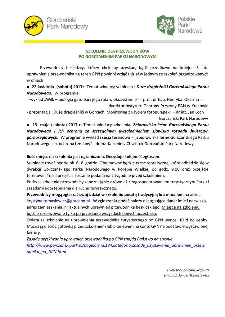 SZKOLENIE DLA PRZEWODNIKÓW PO GORCZAŃSKIM PARKU NARODOWYM Przewodnicy beskidzcy, którzy chcieliby uzyskać, bądź przedłużyć na kolejne 3 lata uprawnienia przewodnika na teren GPN powinni wziąć udział w jednym ze szkoleń organizowanych w dniach: ● 22 kwietnia (sobota) 2017r. Temat wiodący szkolenia : Duże drapieżniki Gorczańskiego Parku Narodowego. W programie: - wykład „Wilk – biologia gatunku i jego rola w ekosystemie” - prof. dr hab. Henryka Okarma dyrektor Instytutu Ochrony Przyrody PAN w Krakowie - prezentacja „Duże drapieżniki w Gorcach. Monitoring z użyciem fotopułapek” – dr inż. Jan Loch Gorczański Park Narodowy ● 13 maja (sobota) 2017 r. Temat wiodący szkolenia: Zbiorowiska leśne Gorczańskiego Parku Narodowego i ich ochrona ze szczególnym uwzględnieniem zjawiska rozpadu świerczyn górnoreglowych. W programie wykład i sesja terenowa - „Zbiorowiska leśne Gorczańskiego Parku Narodowego ich ochrona i zmiany” - dr inż. Kazimierz Chwistek Gorczański Park Narodowy. Ilość miejsc na szkolenia jest ograniczona. Decyduje kolejność zgłoszeń. Szkolenie trwać będzie ok. 6- 8 godzin. Obejmować będzie część teoretyczną, która odbędzie się w dyrekcji Gorczańskiego Parku Narodowego w Porębie Wielkiej od godz. 9.00 oraz przejście terenowe. Trasa przejścia zostanie podana na 2 tygodnie przed szkoleniem. Podczas szkolenia przewodnicy zapoznają się z również z zagospodarowaniem turystycznym Parku i zasadami udostępniania dla ruchu turystycznego. Przewodnicy mogą zgłaszać swój udział w szkoleniu pocztą tradycyjną lub e-mailem na adres: [email protected] . W zgłoszeniu podać należy następujące dane: imię i nazwisko, adres zamieszkania, nr aktualnych uprawnień przewodnika beskidzkiego. Miejsce na szkoleniu będzie rezerwowane tylko po przesłaniu wszystkich danych uczestnika. Opłata za szkolenie na uprawnienia przewodnika turystycznego po GPN wynosi 10 zł od osoby. Można ją uiścić z gotówką przed szkoleniem lub przelewem na konto GPN na podstawie wystawionej faktury. Zasady uzyskiwania uprawnień przewodnika po GPN znajdą Państwo na stronie http://www.gorczanskipark.pl/page,art,id,184,kategoria,Zasady_uzyskiwania_uprawnien_przew odnika_po_GPN.html Dyrektor Gorczańskiego PN (-) dr inż. Janusz Tomasiewicz