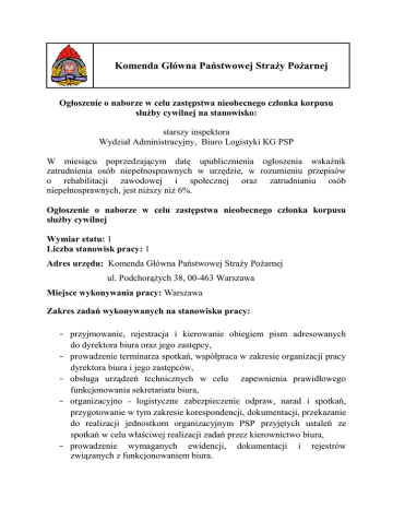 Komenda Główna Państwowej Straży Pożarnej Ogłoszenie o naborze w celu zastępstwa nieobecnego członka korpusu służby cywilnej na stanowisko: starszy inspektora Wydział Administracyjny, Biuro Logistyki KG PSP W miesiącu poprzedzającym datę upublicznienia ogłoszenia wskaźnik zatrudnienia osób niepełnosprawnych w urzędzie, w rozumieniu przepisów o rehabilitacji zawodowej i społecznej oraz zatrudnianiu osób niepełnosprawnych, jest niższy niż 6%. Ogłoszenie o naborze w celu zastępstwa nieobecnego członka korpusu służby cywilnej Wymiar etatu: 1 Liczba stanowisk pracy: 1 Adres urzędu: Komenda Główna Państwowej Straży Pożarnej ul. Podchorążych 38, 00-463 Warszawa Miejsce wykonywania pracy: Warszawa Zakres zadań wykonywanych na stanowisku pracy: - przyjmowanie, rejestracja i kierowanie obiegiem pism adresowanych do dyrektora biura oraz jego zastępcy, - prowadzenie terminarza spotkań, współpraca w zakresie organizacji pracy dyrektora biura i jego zastępców, - obsługa urządzeń technicznych w celu zapewnienia prawidłowego funkcjonowania sekretariatu biura, - organizacyjno - logistyczne zabezpieczenie odpraw, narad i spotkań, przygotowanie w tym zakresie korespondencji, dokumentacji, przekazanie do realizacji jednostkom organizacyjnym PSP przyjętych ustaleń ze spotkań w celu właściwej realizacji zadań przez kierownictwo biura, - prowadzenie wymaganych ewidencji, dokumentacji i rejestrów związanych z funkcjonowaniem biura. Warunki pracy Warunki dotyczące wykonywania zadań charakteru pracy na stanowisku i sposobu Praca administracyjno – biurowa w siedzibie KG PSP. Miejsce i otoczenie organizacyjno-techniczne stanowiska pracy Budynek KG PSP przy ul. Podchorążych 38 w Warszawie, położony na terenie kompleksu koszarowego, pierwsza kondygnacja, sekretariat, indywidualne stanowisko pracy wyposażone w sprzęt komputerowy, faks, skaner i telefony. Wymagania niezbędne związane ze stanowiskiem pracy: wykształcenie: wyższe doświadczenie zawodowe: 6 miesięcy doświadczenia zawodowego w pracy biurowej Pozostałe wymagania niezbędne: - znajomość ustawy o PSP, - znajomość ustawy o służbie cywilnej, - znajomość pakietu MS Office, - obsługa urządzeń biurowych. Wymagane dokumenty i oświadczenia: życiorys i list motywacyjny oświadczenie o wyrażeniu zgody na przetwarzanie danych osobowych do celów rekrutacji oświadczenie o korzystaniu z pełni praw publicznych oświadczenie o nieskazaniu prawomocnym wyrokiem za umyślne przestępstwo lub umyślne przestępstwo skarbowe kopie dokumentów potwierdzających wykształcenie kopia dokumentu potwierdzającego posiadanie polskiego obywatelstwa lub oświadczenie o posiadaniu obywatelstwa polskiego, kopie dokumentów potwierdzających wymagane doświadczenie zawodowe Inne dokumentu i oświadczenia: kopia dokumentu potwierdzającego niepełnosprawność - w przypadku kandydatek/kandydatów, którzy zamierzają skorzystać z pierwszeństwa w zatrudnieniu w przypadku, gdy znajdą się w gronie najlepszych kandydatek/kandydatów. Termin składania dokumentów: do 20.05.2016 r. Miejsce składania dokumentów: Prosimy przesłać na adres: Komenda Główna Państwowej Straży Pożarnej Biuro Kadr i Organizacji ul. Podchorążych 38 00-463 Warszawa lub składać osobiście: w siedzibie Urzędu przy ul. Podchorążych 38 w Warszawie, w Kancelarii Ogólnej, w godzinach pracy: 8.15 do 16.15. Inne informacje: W ofercie należy podać dane kontaktowe – adres do korespondencji, adres e-mail, nr telefonu. Na kopercie i w liście motywacyjnym prosimy dopisać BT – starszy inspektor (zastępstwo). Oferty otrzymane po terminie nie będą rozpatrywane. W przypadku ofert złożonych drogą pocztową, za datę ich złożenia uważa się datę nadania. Uwaga ! Weryfikacja spełnienia przez kandydatów wymagań formalnych dokonana zostanie na podstawie dokumentów wymienionych w części „wymagane dokumenty i oświadczenia”. W związku z powyższym podkreślamy, że kompletne aplikacje to takie, które zawierają wszystkie wymagane dokumenty i własnoręcznie podpisane oświadczenia. Planowane techniki i metody naboru: - test wiedzy - rozmowa kwalifikacyjna. Kandydaci zakwalifikowani do poszczególnych etapów selekcji zostaną powiadomieni o ich terminie telefonicznie lub pocztą elektroniczną. Osoby, których oferty zostaną rozpatrzone negatywnie, nie będą informowane. Dokumenty kandydatów ujętych w protokole naboru przechowuje się przez okres 3 miesięcy od zakończenia procedury naboru zaś dokumenty pozostałych kandydatów przez okres 14 dni. Oferty kandydatów niewyłonionych możliwe są do odebrania w ciągu 14 dni od dnia opublikowania wyniku naboru. Po upływie w/w terminów, dokumenty są komisyjnie niszczone. Dodatkowe informacje: 22 523-34-57 (Biuro Logistyki KG PSP).
