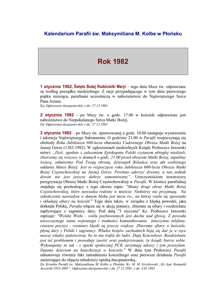 Kalendarium Parafii św. Maksymiliana M. Kolbe w Płońsku Rok 1982 1 stycznia 1982, Święto BoŜej Rodzicielki Maryi – tego dnia Msze św. odprawiane są według porządku niedzielnego. Z racji przypadającego w tym dniu pierwszego piątku miesiąca, parafianie uczestniczą w naboŜeństwie do Najświętszego Serca Pana Jezusa. Za: Ogłoszenia duszpasterskie z dn. 27.12.1981 2 stycznia 1982 - po Mszy św. o godz. 17.00 w kościele odprawione jest naboŜeństwo do Niepokalanego Serca Matki BoŜej. Za: Ogłoszenia duszpasterskie z dn. 27.12.1981 3 stycznia 1982 – po Mszy św. sprawowanej o godz. 10.00 następuje wystawienie i adoracja Najświętszego Sakramentu. O godzinie 21.00 w Parafii rozpoczynają się obchody Roku Jubileuszu 600-lecia obecności Cudownego Obrazu Matki BoŜej na Jasnej Górze (1382-1982). W ogłoszeniach niedzielnych Ksiądz Proboszcz Jaworski mówi: „Dziś, zgodnie z zaleceniem Episkopatu Polski czytanym ubiegłej niedzieli, zbierzemy się wszyscy w domach o godz. 21.00 przed obrazem Matki BoŜej, zapalimy świecę, odmówimy Pod Twoją obronę, dziesiątek RóŜańca oraz akt osobistego oddania Matce BoŜej. Jest to rozpoczęcie roku Jubileuszu 600-lecia Obrazu Matki BoŜej Częstochowskiej na Jasnej Górze. Powinny uderzyć dzwony, u nas jednak dzwon nie jest jeszcze dobrze zamontowany”. Uroczystościom towarzyszy peregrynacja Obrazu Matki BoŜej Częstochowskiej w Parafii. W kronice parafialnej znajduje się pochodzący z tego okresu zapis: "Mamy drugi obraz Matki BoŜej Częstochowskiej, który nawiedza rodziny w mieście. Niektórzy nie przyjmują. Na zakończenie nawiedzin w danym bloku jest msza św., na której wielu się spowiada i składają ofiary na kościół." Tego dnia takŜe, w związku z klęską powodzi, jaka dotknęła Polskę, Parafia włącza się w akcję pomocy, zbierane są ofiary i rozdzielane napływające z zagranicy dary. Pod datą "3 stycznia" Ks. Proboszcz Jaworski zapisuje: "Wylała Wisła - wielu pozbawionych jest dachu nad głową. Z powodu nieszczęsnego stanu wojennego i trudności komunikowania (nieczynne telefony, cenzura poczty) - rozmiary klęski są jeszcze większe. Zbieramy ofiary w kościele, płyną dary z Polski i zagranicy. Władze krajów zachodnich boją się dać je w ręce naszej władzy państwowej, bo to nie trafia do ludzi. Dają Kościołowi. Rozdzielanie jest teŜ problemem i powoduje zawiść oraz podejrzewanie, Ŝe ksiądz bierze sobie. Wykonujemy to tak - z opieki społecznej PCK otrzymuję adresy i tym przesyłam. Dajemy dzieciom na katechizacji w kościele." W dniu tym Proboszcz Parafii odnotowuje równieŜ fakt zatrudnienia kościelnego oraz pierwsze działania Parafii zmierzające do objęcia młodzieŜy opieką duszpasterską. Za: Kronika Parafii św. Maksymiliana M. Kolbe w Płońsku; Ks. M. M. Grzybowski „Ks. kan. Romuald Jaworski 1933-2001”; Ogłoszenia duszpasterskie z dn. 27.12.1981; z dn. 3.01.1982 22 6 stycznia 1982, Uroczystość Objawienia Pańskiego (Trzech Króli) – tego dnia Msze św. odprawiane są według porządku niedzielnego - o godz. 7.00, 10.00, 11.30 i 17.00. Po kaŜdej Mszy św. następuje poświęcenie kadzidła i kredy. Za: Ogłoszenia duszpasterskie z dn. 3.01.1982 7 stycznia 1982 - po Mszy św. wieczornej odbywa się nauka dla rodziców i chrzestnych dzieci, którym udzielony będzie sakrament Chrztu św. W Parafii trwa doroczna wizyta duszpasterska. Za: Ogłoszenia duszpasterskie z dn. 3.01.1982 21 stycznia 1982 – w związku z przypadającą w tym dniu 18. rocznicą prekonizacji na stolicę płocką Księdza Biskupa Bogdana Sikorskiego, podczas Mszy św. wieczornej parafianie modlą się w jego intencji. Po Mszy św. odbywa się nauka dla rodziców i chrzestnych dzieci przyjmujących sakrament Chrztu św.. Za: Ogłoszenia duszpasterskie z dn. 17.01.1982 24 stycznia 1982 – o godz. 7.00 sprawowana jest Msza św. w intencji parafian. Podczas Mszy św. o godz. 10.00 udzielany jest sakrament Chrztu św. Po Mszy św. dla dzieci następuje wystawienie Najświętszego Sakramentu i suplikacja. W ogłoszeniach duszpasterskich Ksiądz Proboszcz informuje: „Są do rozkupienia nowe numery „Osservatore Romano”. PoniewaŜ jest to jedyne w tej chwili czasopismo, sądzę, Ŝe czterdzieści egzemplarzy łatwo się rozejdzie.” Za: Ogłoszenia duszpasterskie z dn. 24.01.1982 25 stycznia 1982– rozpoczyna się Tydzień Modlitw o Zjednoczenie Chrześcijan. Podczas wieczornej Mszy św. parafianie modlą się o jedność chrześcijan. Do Parafii napływają kolejne dary zagraniczne. Rozdzielane są pomiędzy parafian, zaleŜnie od potrzeb. „Jeśli coś przyjdzie – mówi Proboszcz w niedzielnych ogłoszeniach – daję biednym, o których wiemy z kolędy, dzieciom z rodzin wielodzietnych na religii... Bardzo proszę, aby zgłaszali się ludzie, którzy potrzebują, lub zgłaszajcie wy nazwiska tych, którzy powinni być obdarowani. Gdy coś przyjdzie, chcielibyśmy, aby trafiło do najbardziej potrzebujących. Boję się sytuacji, Ŝe gdy przyjdzie coś i ja ogłoszę, wtedy przyjdą nie najbiedniejsi, ale ludzie zamoŜni a bez wstydu, i trafi to do nich lub na handel. Jeśli komuś coś daję, to raczej dyskretnie, nie jest to bowiem przyjemne brać coś od innych.” Za: Ogłoszenia duszpasterskie z dn. 24.01.1982 31 stycznia 1982 – tego dnia Msze św. sprawowane są według porządku niedzielnego. O godz. 15.30 ma miejsce spotkanie Proboszcza z młodzieŜą akademicką, pracującą i szkolną. Za: Ogłoszenia duszpasterskie z dn. 31.01.1982 1 lutego 1982 - zakończona zostaje pierwsza wizyta duszpasterska w nowej Parafii. Za: Kronika Parafii św. Maksymiliana M. Kolbe w Płońsku; Ogłoszenia duszpasterskie z dn. 31.01.1982 2 lutego 1982, Święto Ofiarowania Pańskiego (MB Gromnicznej – Msze św. w tym dniu sprawowane są o godz. 7.00, 10.00, 11.30 i 17.00. Na Mszy św. o godz. 10.00 zostają poświęcone gromnice. Za: Ogłoszenia duszpasterskie z dn. 31.01.1982 4