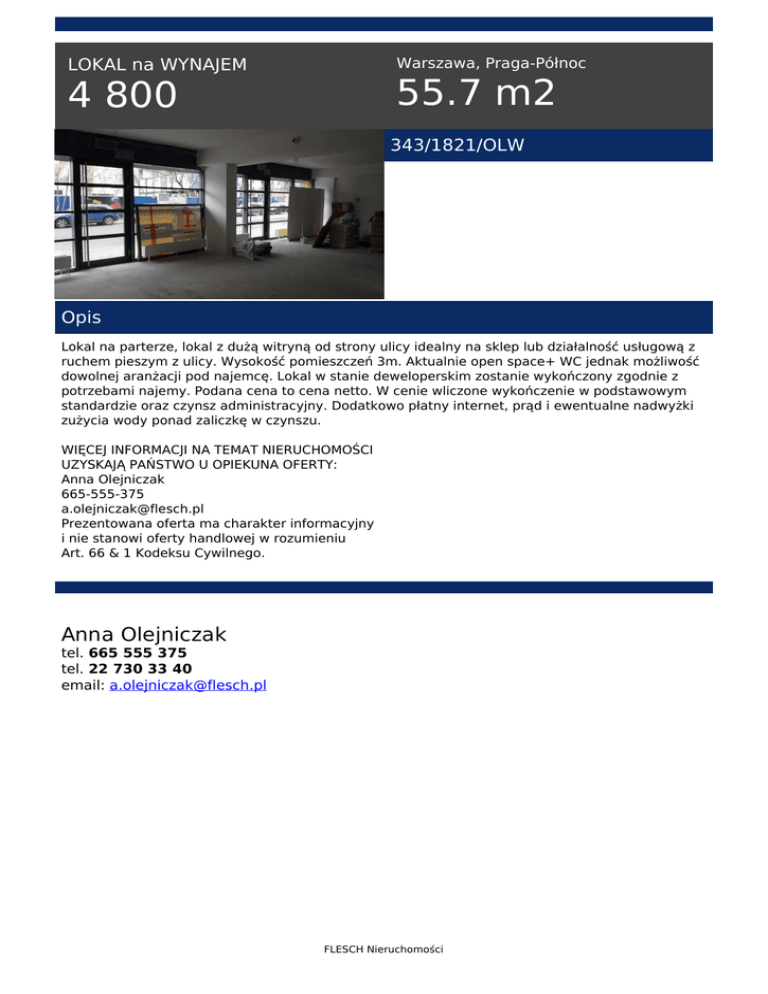 Warszawa, Praga-Północ LOKAL na WYNAJEM 55.7 m2 4 800 343/1821/OLW Opis Lokal na parterze, lokal z dużą witryną od strony ulicy idealny na sklep lub działalność usługową z ruchem pieszym z ulicy. Wysokość pomieszczeń 3m. Aktualnie open space+ WC jednak możliwość dowolnej aranżacji pod najemcę. Lokal w stanie deweloperskim zostanie wykończony zgodnie z potrzebami najemy. Podana cena to cena netto. W cenie wliczone wykończenie w podstawowym standardzie oraz czynsz administracyjny. Dodatkowo płatny internet, prąd i ewentualne nadwyżki zużycia wody ponad zaliczkę w czynszu. WIĘCEJ INFORMACJI NA TEMAT NIERUCHOMOŚCI UZYSKAJĄ PAŃSTWO U OPIEKUNA OFERTY: Anna Olejniczak 665-555-375 [email protected] Prezentowana oferta ma charakter informacyjny i nie stanowi oferty handlowej w rozumieniu Art. 66 & 1 Kodeksu Cywilnego. Anna Olejniczak tel. 665 555 375 tel. 22 730 33 40 email: [email protected] FLESCH Nieruchomości Powered by TCPDF (www.tcpdf.org)