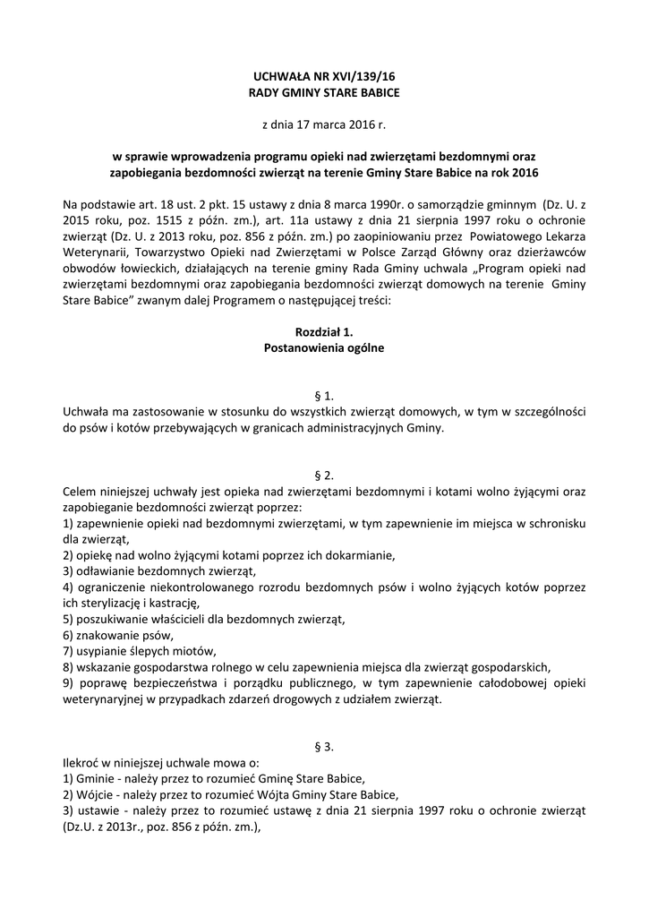 UCHWAŁA NR XVI/139/16 RADY GMINY STARE BABICE z dnia 17 marca 2016 r. w sprawie wprowadzenia programu opieki nad zwierzętami bezdomnymi oraz zapobiegania bezdomności zwierząt na terenie Gminy Stare Babice na rok 2016 Na podstawie art. 18 ust. 2 pkt. 15 ustawy z dnia 8 marca 1990r. o samorządzie gminnym (Dz. U. z 2015 roku, poz. 1515 z późn. zm.), art. 11a ustawy z dnia 21 sierpnia 1997 roku o ochronie zwierząt (Dz. U. z 2013 roku, poz. 856 z późn. zm.) po zaopiniowaniu przez Powiatowego Lekarza Weterynarii, Towarzystwo Opieki nad Zwierzętami w Polsce Zarząd Główny oraz dzierżawców obwodów łowieckich, działających na terenie gminy Rada Gminy uchwala „Program opieki nad zwierzętami bezdomnymi oraz zapobiegania bezdomności zwierząt domowych na terenie Gminy Stare Babice” zwanym dalej Programem o następującej treści: Rozdział 1. Postanowienia ogólne § 1. Uchwała ma zastosowanie w stosunku do wszystkich zwierząt domowych, w tym w szczególności do psów i kotów przebywających w granicach administracyjnych Gminy. § 2. Celem niniejszej uchwały jest opieka nad zwierzętami bezdomnymi i kotami wolno żyjącymi oraz zapobieganie bezdomności zwierząt poprzez: 1) zapewnienie opieki nad bezdomnymi zwierzętami, w tym zapewnienie im miejsca w schronisku dla zwierząt, 2) opiekę nad wolno żyjącymi kotami poprzez ich dokarmianie, 3) odławianie bezdomnych zwierząt, 4) ograniczenie niekontrolowanego rozrodu bezdomnych psów i wolno żyjących kotów poprzez ich sterylizację i kastrację, 5) poszukiwanie właścicieli dla bezdomnych zwierząt, 6) znakowanie psów, 7) usypianie ślepych miotów, 8) wskazanie gospodarstwa rolnego w celu zapewnienia miejsca dla zwierząt gospodarskich, 9) poprawę bezpieczeństwa i porządku publicznego, w tym zapewnienie całodobowej opieki weterynaryjnej w przypadkach zdarzeń drogowych z udziałem zwierząt. § 3. Ilekroć w niniejszej uchwale mowa o: 1) Gminie - należy przez to rozumieć Gminę Stare Babice, 2) Wójcie - należy przez to rozumieć Wójta Gminy Stare Babice, 3) ustawie - należy przez to rozumieć ustawę z dnia 21 sierpnia 1997 roku o ochronie zwierząt (Dz.U. z 2013r., poz. 856 z późn. zm.), 4) posiadaczu zwierzęcia – należy przez to rozumieć osobę będącą mieszkańcem gminy Stare Babice, posiadającą zwierzę lub zwierzęta, o których mowa w niniejszej uchwale, Rozdział 2. Ograniczenie niekontrolowanego rozrodu domowych psów i kotów § 4. Gmina pokrywa koszty sterylizacji lub kastracji bezdomnych zwierząt, a w szczególności kotów i psów przebywających na terenie Gminy: 1) Gmina zgodnie z ustawą prawo zamówień publicznych wyłania zakład leczniczy dla zwierząt, z którym zawierana jest umowa na dokonywanie zabiegów kastracji i sterylizacji bezdomnych zwierząt, opiekę pooperacyjną oraz elektroniczne znakowanie psów, 2) na warunkach określonych w umowie, Gmina pokrywa 100% kosztów zabiegu zakładowi leczniczemu dla zwierząt na podstawie wystawionego rachunku. § 5. 1. Gmina pokrywa 100% kosztów uśpienia ślepych miotów bezdomnych psów lub kotów. 2. Określa się następujące zasady finansowania zabiegów, o których mowa w ust. 1. 1) uśpieniu mogą podlegać wyłącznie zwierzęta, które są jeszcze ślepe i nie ma możliwości znalezienia dla nich właściciela, 2) zabieg uśpienia na zasadach określonych w pkt. 1 przeprowadza wyłącznie lekarz weterynarii, z którym Gmina zawarła umowę na świadczenie usług w tym zakresie, 3) Gmina płaci zakładowi leczniczemu dla zwierząt za czynności opisane w niniejszym paragrafie, zgodnie z warunkami określonymi w umowie, Rozdział 3. Trwałe oznakowanie psów § 6. 1. Gmina finansuje elektroniczne znakowanie bezdomnych psów w wysokości 100% kosztów. 2. Poza elektronicznym znakowaniem dopuszczalne są także inne formy oznakowania psów umożliwiające jednoznaczna identyfikację jego posiadacza. Rozdział 4. Poprawa bezpieczeństwa i porządku publicznego § 7. 1. Posiadacz zwierzęcia, który w przypadku wyjątkowej konieczności, spowodowanej losową sytuacją życiową, zamierza pozbyć się zwierzęcia jest za niego odpowiedzialny i zobowiązany do zapewnienia mu opieki do czasu przekazania zwierzęcia nowemu posiadaczowi. 2. Za poszukiwanie nowych posiadaczy dla psów i kotów odpowiadają ich dotychczasowi posiadacze. 3. Gmina prowadzi poszukiwania nowych posiadaczy dla bezdomnych zwierząt poprzez prowadzenie akcji adopcyjnej bezdomnych zwierząt wyłapanych z terenu Gminy, tj. stworzenie elektronicznej bazy danych na stronie internetowej oraz umieszczanie zdjęć i informacji dotyczącej wyłapanych zwierząt na tej stronie. Rozdział 5. Opieka nad zwierzętami bezdomnymi § 8. 1. Gmina prowadzi wyłapywanie zwierząt bezdomnych - to jest takich, które uciekły, zabłąkały się lub zostały porzucone i nie ma możliwości ustalenia ich posiadaczy lub innych osób, pod których opieką zwierzęta dotychczas przebywały. 2. Wyłapywanie bezdomnych zwierząt z terenu gminy realizowane jest przez „Vetriver” Klinika Weterynaryjna Andrzeja Małkowski z siedzibą w Laskach przy ul. 3 Maja 89, po otrzymaniu zgłoszenia od mieszkańca, Straży Gminnej, Policji lub uprawnionego podmiotu, z którym Gmina zawarła umowę na świadczenie usług w tym zakresie. Podmiot wyłapujący bezdomne zwierzęta zobowiązany jest używać urządzeń i środków niestwarzających zagrożenia dla życia i zdrowia wyłapanych zwierząt środki i urządzenia użyte do wyłapywania bezdomnych zwierząt a także sposób wyłapywania nie może zadawać zwierzętom cierpienia. Podczas akcji odłowu bezdomnych zwierząt podmiot wyłapujący zwierzęta zobowiązany jest zapewnić im opiekę weterynaryjną. 3. Gmina zapewnia odłowionym psom miejsce w Schronisku dla Bezdomnych Zwierząt w Skierniewicach, na podstawie zawartej umowy, w celu zapewnienia im bezterminowej opieki do czasu ich adopcji. Wszystkie zwierzęta trafiające do sch