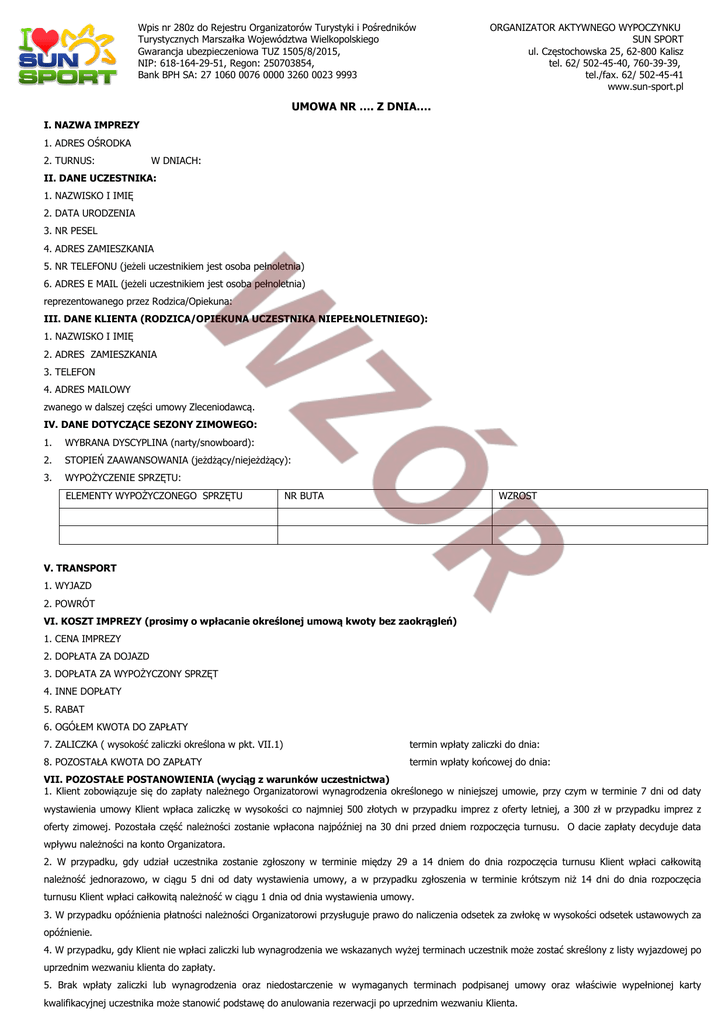 Wpis nr 280z do Rejestru Organizatorów Turystyki i Pośredników Turystycznych Marszałka Województwa Wielkopolskiego Gwarancja ubezpieczeniowa TUZ 1505/8/2015, NIP: 618-164-29-51, Regon: 250703854, Bank BPH SA: 27 1060 0076 0000 3260 0023 9993 ORGANIZATOR AKTYWNEGO WYPOCZYNKU SUN SPORT ul. Częstochowska 25, 62-800 Kalisz tel. 62/ 502-45-40, 760-39-39, tel./fax. 62/ 502-45-41 www.sun-sport.pl UMOWA NR …. Z DNIA…. I. NAZWA IMPREZY 1. ADRES OŚRODKA 2. TURNUS: W DNIACH: II. DANE UCZESTNIKA: 1. NAZWISKO I IMIĘ 2. DATA URODZENIA 3. NR PESEL 4. ADRES ZAMIESZKANIA 5. NR TELEFONU (jeżeli uczestnikiem jest osoba pełnoletnia) 6. ADRES E MAIL (jeżeli uczestnikiem jest osoba pełnoletnia) reprezentowanego przez Rodzica/Opiekuna: III. DANE KLIENTA (RODZICA/OPIEKUNA UCZESTNIKA NIEPEŁNOLETNIEGO): 1. NAZWISKO I IMIĘ 2. ADRES ZAMIESZKANIA 3. TELEFON 4. ADRES MAILOWY zwanego w dalszej części umowy Zleceniodawcą. IV. DANE DOTYCZĄCE SEZONY ZIMOWEGO: 1. WYBRANA DYSCYPLINA (narty/snowboard): 2. STOPIEŃ ZAAWANSOWANIA (jeżdżący/niejeżdżący): 3. WYPOŻYCZENIE SPRZĘTU: ELEMENTY WYPOŻYCZONEGO SPRZĘTU NR BUTA WZROST V. TRANSPORT 1. WYJAZD 2. POWRÓT VI. KOSZT IMPREZY (prosimy o wpłacanie określonej umową kwoty bez zaokrągleń) 1. CENA IMPREZY 2. DOPŁATA ZA DOJAZD 3. DOPŁATA ZA WYPOŻYCZONY SPRZĘT 4. INNE DOPŁATY 5. RABAT 6. OGÓŁEM KWOTA DO ZAPŁATY 7. ZALICZKA ( wysokość zaliczki określona w pkt. VII.1) termin wpłaty zaliczki do dnia: 8. POZOSTAŁA KWOTA DO ZAPŁATY termin wpłaty końcowej do dnia: VII. POZOSTAŁE POSTANOWIENIA (wyciąg z warunków uczestnictwa) 1. Klient zobowiązuje się do zapłaty należnego Organizatorowi wynagrodzenia określonego w niniejszej umowie, przy czym w terminie 7 dni od daty wystawienia umowy Klient wpłaca zaliczkę w wysokości co najmniej 500 złotych w przypadku imprez z oferty letniej, a 300 zł w przypadku imprez z oferty zimowej. Pozostała część należności zostanie wpłacona najpóźniej na 30 dni przed dniem rozpoczęcia turnusu. O dacie zapłaty decyduje data wpływu należności na konto Organizatora. 2. W przypadku, gdy udział uczestnika zostanie zgłoszony w terminie między 29 a 14 dniem do dnia rozpoczęcia turnusu Klient wpłaci całkowitą należność jednorazowo, w ciągu 5 dni od daty wystawienia umowy, a w przypadku zgłoszenia w terminie krótszym niż 14 dni do dnia rozpoczęcia turnusu Klient wpłaci całkowitą należność w ciągu 1 dnia od dnia wystawienia umowy. 3. W przypadku opóźnienia płatności należności Organizatorowi przysługuje prawo do naliczenia odsetek za zwłokę w wysokości odsetek ustawowych za opóźnienie. 4. W przypadku, gdy Klient nie wpłaci zaliczki lub wynagrodzenia we wskazanych wyżej terminach uczestnik może zostać skreślony z listy wyjazdowej po uprzednim wezwaniu klienta do zapłaty. 5. Brak wpłaty zaliczki lub wynagrodzenia oraz niedostarczenie w wymaganych terminach podpisanej umowy oraz właściwie wypełnionej karty kwalifikacyjnej uczestnika może stanowić podstawę do anulowania rezerwacji po uprzednim wezwaniu Klienta. 6. W przypadku objęcia sprzedaży danej imprezy promocją, warunkiem skorzystania z rabatu jest wpłata należności oraz odesłanie dokumentów w wymaganych terminach. Brak wpłaty w wymaganych terminach skutkuje anulacją przyznanego wcześniej rabatu. 7. Zawarcie Umowy pomiędzy Klientem, a Organizatorem następuje w momencie podpisania Umowy, przy czym wpłata zaliczki w kwocie ustalonej przez Organizatora również oznacza zgodę na zawarcie Umowy na warunkach wskazanych w treści Umowy przesłanej do Klienta. Strony ustalają, że obieg dokumentów związanych z zawarciem umowy nastąpi w formie elektronicznej przy czym każda ze stron na wezwanie drugiej jest obowiązana dostarczyć oryginały dokumentów w terminie siedmiu dni od daty takiego zgłoszenia. 8. Klient ma obowiązek odesłania skanu podpisanej umowy oraz wypełnionej karty kwalifikacyjnej w terminie 7 dni od dnia wystawienia umowy na adres e-mail [email protected]. 9. FV wystawiamy na podstawie deklaracji złożonej w formularzu rezerwacyjnym on-line. W przypadku, gdy taka deklaracja nie została złożona w chwili rezerwacji imprezy konieczne jest wypełnienie formularza „Wniosek o wystawienie FV” dostępnego na www.sun-sport.pl w zakładce „Płatności”. UWAGA! Fakturę wystawiamy po dokonaniu całkowitej płatności i najpóźniej do dwóch tygodni po zakończeniu imprezy! Faktury wysyłamy pocztą elektroniczną w formacie PDF na adres e-mail wskazany w umowie. Faktury pocztą tradycyjną wysyłamy wyłącznie na wyraźne życzenie Klienta. 10. Bardzo prosimy o poinformowanie biura drogą mailową lub telefoniczną o rezygnacji z rezerwacji miejsca. 11. Wyrażam zgodę na przetwarzanie moich danych osobowych w zakresie obejmującym imię, nazwisko, adres zamieszkania, numer telefonu oraz adres e-mail przez Organizatora, w celu przesyłania ofert marketingowych dotyczących własnej działalności biura 12. Wyrażam zgodę na ewentualną publikację wizerunku uczestników w materiałach reklamowych Organizatora. 13. Wszelkie zmiany niniejszej umowy wymagają formy pisemnego aneksu pod rygorem nieważności. Rodzice/opiekunowie prawni oświadczają, że posiadają pełnię praw rodzicielskich. W przypadku złożenia pod niniejszą umową wyłącznie jednego podpisu – rodzic/opiekun prawny oświadcza, że posiada zgodę drugiego z rodziców na zawarcie niniejszej umowy lub też jest jedynym opiekunem prawnym. Rodzice/opiekunowie prawni uczestnika oświadczają, że w imieniu własnym oraz uczestnika zapoznali się postanowieniami niniejszej umowy, szczegółową ofertą znajdującą się na stronie internetowej www.sun-sport.pl, Warunkami uczestnictwa obowiązującymi od 10.09.2016 roku, postanowieniami zawartymi w Karcie kwalifikacyjnej oraz warunkami ubezpieczenia znajdującymi się na stronie www.warta.pl (Pakiet Podróżnik - NNW - WARTA POMOC W WYPADKU, waria