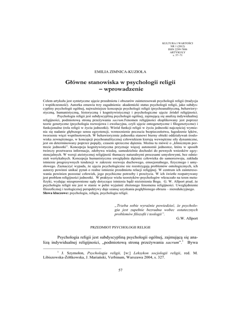 KULTURA I WARTOŚCI NR 1 (2012) ISSN 2299-7806 ARTYKUŁY s. 57–71 EMILIA ZIMNICA-KUZIOŁA Główne stanowiska w psychologii religii – wprowadzenie Celem artykułu jest syntetyczne ujęcie przedmiotu i obszarów zainteresowań psychologii religii (tradycja i współczesność). Autorka omawia trzy zagadnienia: akademicki status psychologii religii, jako subdyscypliny psychologii ogólnej, najważniejsze koncepcje psychologii religii (psychoanalityczną, behawiorystyczną, humanistyczną, historyczną i kognitywistyczną) i psychologiczne ujęcie źródeł religijności. Psychologia religii jest subdyscypliną psychologii ogólnej, zajmującą się analizą indywidualnej religijności, podmiotową stroną przeżywania sacrum.Fenomen religijności eksplikowany jest poprzez teorie genetyczne (psychologia rozwojowa i ewolucyjna, czyli ujęcie ontogenetyczne i filogenetyczne) i funkcjonalne (rola religii w życiu jednostki). Wśród funkcji religii w życiu jednostki najczęściej wymienia się nadanie głębszego sensu egzystencji, wzmocnienie poczucia bezpieczeństwa, łagodzenie lęków, tworzenie więzi wspólnotowych. W behawioryzmie jednostka stanowi bierny obiekt oddziaływań środowiska zewnętrznego, w koncepcji psychoanalitycznej człowiekiem kierują wewnętrzne siły dynamiczne, jest on determinowany poprzez popędy, czasem sprzeczne dążenia. Można tu mówić o „klinicznym portrecie jednostki”. Koncepcja kognitywistyczna przyznaje więcej autonomii jednostce, która w sposób twórczy przetwarza informacje, zdobywa wiedzę, samodzielnie dochodzi do pewnych wniosków egzystencjalnych. W wersji ateistycznej religijność tłumaczy naturalnymi procesami umysłowymi, bez odniesień wertykalnych. Koncepcja humanistyczna uwzględnia dążenie człowieka do samorozwoju, zakłada istnienie progresywnych tendencji w zakresie rozwoju duchowego, emocjonalnego, fizycznego i umysłowego. Zaznaczyć wypada, że ujęcia psychologiczne nie rozstrzygają problemów ontologicznych, ich autorzy powinni unikać pytań o realne istnienie przedmiotu relacji religijnej. W centrum ich zainteresowania powinien pozostać człowiek, jego psychiczne potrzeby i przeżycia. W ich świetle rozpatrywany jest problem religijności jednostki. W praktyce wielu teoretyków-psychologów wkraczało na teren metafizyki, wydając nieuprawnione sądy dotyczące istnienia bądź nieistnienia Boga. G. W. Allport pisał, że psychologia religii nie jest w stanie w pełni wyjaśnić złożonego fenomenu religijności. Uwzględnienie filozoficznej i teologicznej perspektywy daje szansę uzyskania pogłębionego obrazu – nieredukcyjnego. Słowa kluczowe: psychologia, religia, psychologia religii. „Trzeba sobie wyraźnie powiedzieć, że psychologia jest zupełnie bezradna wobec ostatecznych problemów filozofii i teologii”. G.W. Allport PRZEDMIOT PSYCHOLOGII RELIGII Psychologia religii jest subdyscypliną psychologii ogólnej, zajmującą się analizą indywidualnej religijności, „podmiotową stroną przeżywania sacrum”.1 Bywa 1 J. Szymołon, Psychologia religii, [w:] Leksykon socjologii religii, red. M. Libiszowska-Żółtkowska, J. Mariański, Verbinum, Warszawa 2004, s. 327. 57 traktowana jako dział psychologii stosowanej, bądź religioznawstwa. „W pierwszym przypadku – stwierdza J. Szymołon – przedmiotem badań są osobowościowe uwarunkowania religijności, procesy odchodzenia od religii i religijnego nawrócenia oraz wpływ doktryny, kultu i organizacji religijnej na sposób poznawczego, emocjonalnego i działaniowego funkcjonowania człowieka. Obszar zainteresowań religioznawcy koncentruje się na funkcji religii, motywacji religijnej, związkach religijności ze zdrowiem psychicznym oraz procesach psychofizjologicznych, towarzyszących takim stanom świadomości, jak ekstaza, trans czy przeżycie mistyczne. Obejmuje także wyjaśnianie genezy religijności, które przedstawia się w ramach teorii antyredukcjonistycznych i redukcjonistycznych. Podejście antyredukcjonistyczne uznaje religijność za zjawisko autonomiczne, niewyprowadzalne z bardziej pierwotnych źródeł podmiotowych i będące konsekwencją praobjawienia, czy stanowiące wręcz pierwotną intencjonalność. W teoriach redukcjonistycznych religijność jest traktowana jako zjawisko wtórne, będące wytworem życia społecznego, szeroko rozumianej potrzeby zachowania gatunku, czy stanowiące konkretyzację niereligijnych procesów indywidualnych albo grupowych”2. Fenomen religijności eksplikowany jest przez teorie genetyczne (psychologia rozwojowa i ewolucyjna, czyli ujęcie ontogenetyczne i filogenetyczne) i funkcjonalne (rola religii w życiu jednostki). Wśród funkcji religii w życiu jednostki najczęściej wymienia się nadanie głębszego sensu egzystencji, wzmocnienie poczucia bezpieczeństwa, łagodzenie lęków, tworzenie więzi wspólnotowych. Nie jest moim zamiarem systematyczne przedstawienie teoretycznych i empirycznych dokonań psychologii religii (w aspekcie historycznym). Zrobił to gruntownie i ciekawie Jan Szmyd w książce Religijność i transcendencja. Wprowadzenie do psychologii religii i duchowości3. Autor prezentuje najważniejsze postaci światowej i polskiej psychologii religii, omawia zagadnienia teoretyczne i metodologiczne, główne kierunki i orientacje badawcze. Z perspektywy psychologicznej analizuje wybrane zagadnienia z pogranicza dyscypliny i innych nauk społecznych (m.in. problem sekt, psychologię cudu, religijne sanktuaria). Precyzuje także wybrane kategorie psychologii religii, takie jak religijność, doświadczenie religijne, postawy wobec religii, konwersje, etc. Ważną pozycją z tej dziedziny jest też książka H. GrzymałyMoszczyńskiej Religia a kultura. Wybrane zagadnienia z kulturowej psychologii religii4. Oprócz syntetycznej prezentacji dziejów światowej i polskiej psychologii religii, autorka zarysowuje akulturacyjne modele religii, główne koncepcje teoretyc