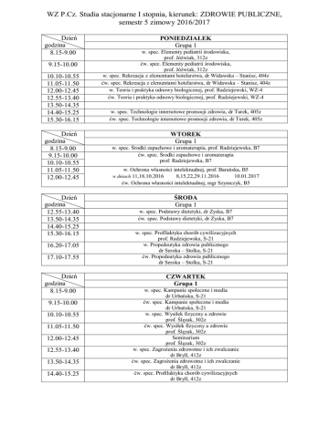 WZ P.Cz. Studia stacjonarne I stopnia, kierunek: ZDROWIE PUBLICZNE, semestr 5 zimowy 2016/2017 Dzień godzina 8.15-9.00 9.15-10.00 10.10-10.55 11.05-11.50 12.00-12.45 12.55-13.40 13.50-14.35 14.40-15.25 15.30-16.15 Dzień godzina 8.15-9.00 9.15-10.00 10.10-10.55 11.05-11.50 12.00-12.45 Dzień godzina 12.55-13.40 13.50-14.35 14.40-15.25 15.30-16.15 16.20-17.05 17.10-17.55 Dzień godzina 8.15-9.00 9.15-10.00 10.10-10.55 11.05-11.50 12.00-12.45 12.55-13.40 13.50-14.35 14.40-15.25 PONIEDZIAŁEK Grupa 1 w. spec. Elementy pediatrii środowiska, prof. Jóźwiak, 312z ćw. spec. Elementy pediatrii środowiska, prof. Jóźwiak, 312z w. spec. Rekreacja z elementami hotelarstwa, dr Widawska – Stanisz, 404z ćw. spec. Rekreacja z elementami hotelarstwa, dr Widawska – Stanisz, 404z w. Teoria i praktyka odnowy biologicznej, prof. Radziejewski, WZ-4 ćw. Teoria i praktyka odnowy biologicznej, prof. Radziejewski, WZ-4 w. spec. Technologie internetowe promocji zdrowia, dr Turek, 405z ćw. spec. Technologie internetowe promocji zdrowia, dr Turek, 405z WTOREK Grupa 1 w. spec. Środki zapachowe i aromaterapia, prof. Radziejewska, B7 ćw. spec. Środki zapachowe i aromaterapia prof. Radziejewska, B7 w. Ochrona własności intelektualnej, prof. Barańska, B5 w dniach 11,18.10.2016 8,15,22,29.11.2016 10.01.2017 ćw. Ochrona własności intelektualnej, mgr Szymczyk, B5 ŚRODA Grupa 1 w. spec. Podstawy dietetyki, dr Zyska, B7 ćw. spec. Podstawy dietetyki, dr Zyska, B7 w. spec. Profilaktyka chorób cywilizacyjnych prof. Radziejewska, S-21 w. Propedeutyka zdrowia publicznego dr Seroka – Stolka, S-21 ćw. Propedeutyka zdrowia publicznego dr Seroka – Stolka, S-21 CZWARTEK Grupa 1 w. spec. Kampanie społeczne i media dr Urbańska, S-21 ćw. spec. Kampanie społeczne i media dr Urbańska, S-21 w. spec. Wysiłek fizyczny a zdrowie prof. Ślęzak, 302z ćw. spec. Wysiłek fizyczny a zdrowie prof. Ślęzak, 302z Seminarium prof. Ślęzak, 302z w. spec. Zagrożenia zdrowotne i ich zwalczanie dr Bryll, 412z ćw. spec. Zagrożenia zdrowotne i ich zwalczanie dr Bryll, 412z ćw. spec. Profilaktyka chorób cywilizacyjnych dr Bryll, 412z