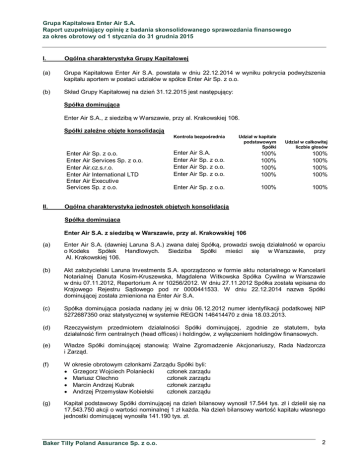 Grupa Kapitałowa Enter Air S.A. Raport uzupełniający opinię z badania skonsolidowanego sprawozdania finansowego za okres obrotowy od 1 stycznia do 31 grudnia 2015 I. Ogólna charakterystyka Grupy Kapitałowej (a) Grupa Kapitałowa Enter Air S.A. powstała w dniu 22.12.2014 w wyniku pokrycia podwyższenia kapitału aportem w postaci udziałów w spółce Enter Air Sp. z o.o. (b) Skład Grupy Kapitałowej na dzień 31.12.2015 jest następujący: Spółka dominująca Enter Air S.A., z siedzibą w Warszawie, przy al. Krakowskiej 106. Spółki zależne objęte konsolidacją Kontrola bezpośrednia Enter Air Sp. z o.o. Enter Air Services Sp. z o.o. Enter Air.cz.s.r.o. Enter Air International LTD Enter Air Executive Services Sp. z o.o. II. Udział w kapitale podstawowym Spółki Udział w całkowitej liczbie głosów Enter Air S.A. Enter Air Sp. z o.o. Enter Air Sp. z o.o. Enter Air Sp. z o.o. 100% 100% 100% 100% 100% 100% 100% 100% Enter Air Sp. z o.o. 100% 100% Ogólna charakterystyka jednostek objętych konsolidacją Spółka dominująca Enter Air S.A. z siedzibą w Warszawie, przy al. Krakowskiej 106 (a) Enter Air S.A. (dawniej Laruna S.A.) zwana dalej Spółką, prowadzi swoją działalność w oparciu o Kodeks Spółek Handlowych. Siedziba Spółki mieści się w Warszawie, przy Al. Krakowskiej 106. (b) Akt założycielski Laruna Investments S.A. sporządzono w formie aktu notarialnego w Kancelarii Notarialnej Danuta Kosim-Kruszewska, Magdalena Witkowska Spółka Cywilna w Warszawie w dniu 07.11.2012, Repertorium A nr 10256/2012. W dniu 27.11.2012 Spółka została wpisana do Krajowego Rejestru Sądowego pod nr 0000441533. W dniu 22.12.2014 nazwa Spółki dominującej została zmieniona na Enter Air S.A. (c) Spółka dominująca posiada nadany jej w dniu 06.12.2012 numer identyfikacji podatkowej NIP 5272687350 oraz statystycznej w systemie REGON 146414470 z dnia 18.03.2013. (d) Rzeczywistym przedmiotem działalności Spółki dominującej, zgodnie ze statutem, była działalność firm centralnych (head offices) i holdingów, z wyłączeniem holdingów finansowych. (e) Władze Spółki dominującej stanowią: Walne Zgromadzenie Akcjonariuszy, Rada Nadzorcza i Zarząd. (f) W (g) Kapitał podstawowy Spółki dominującej na dzień bilansowy wynosił 17.544 tys. zł i dzielił się na 17.543.750 akcji o wartości nominalnej 1 zł każda. Na dzień bilansowy wartość kapitału własnego jednostki dominującej wynosiła 141.190 tys. zł. okresie obrotowym członkami Zarządu Spółki byli: Grzegorz Wojciech Polaniecki członek zarządu Mariusz Olechno członek zarządu Marcin Andrzej Kubrak członek zarządu Andrzej Przemysław Kobielski członek zarządu Baker Tilly Poland Assurance Sp. z o.o. 2 Grupa Kapitałowa Enter Air S.A. Raport uzupełniający opinię z badania skonsolidowanego sprawozdania finansowego za okres obrotowy od 1 stycznia do 31 grudnia 2015 (h) Akcje w Spółce dominującej na dzień bilansowy były objęte następująco: akcji Wartość akcji w zł % posiadanych głosów 6 872 883 2 318 699 6 872 883 2 318 699 39% 13% 2 000 000 2 000 000 11% 1 522 000 1 522 000 9% 1 350 000 3 480 168 17 543 750 1 350 000 3 480 168 17 543 750 8% 20% 100% akcji Wartość akcji w zł % posiadanych głosów 6 860 132 2 314 939 527 187 420 746 420 746 10 543 750 6 860 132,00 2 314 939,00 527 187,00 420 746,00 420 746,00 10 543 750,00 65% 22% 5% 4% 4% 100% Ilość Marcin Andrzej Kubrak Grzegorz Wojciech Polaniecki Fundusze Zarządzane przez NationaleNederlanden Powszechne Towarzystwo Emerytalne S.A. Fundusze Zarządzane przez Inwestors Towarzystwo Funduszy Inwestycyjnych S.A. OFE Generali S.A. Pozostali (jednostkowo poniżej 5%) (i) Akcje w Spółce na koniec okresu ubiegłego były objęte następująco: Ilość Marcin Andrzej Kubrak Grzegorz Wojciech Polaniecki Grzegorz Badziak Mariusz Olechno Andrzej Przemysław Kobielski (f) W dniu 23.02.2015 Walne Zgromadzenie Akcjonariuszy uchwaliło podwyższenie kapitału zakładowego Spółki o kwotę nie niższą niż o 1 zł i nie wyższą niż o 7.000.000 zł w drodze emisji akcji serii C. Emisja akcji serii C nastąpiła w formie subskrypcji otwartej w rozumieniu art. 431 § 2 pkt 3 KSH przeprowadzonej w drodze oferty publicznej w rozumieniu ustawy z dnia 29.07.2005, o ofercie publicznej i warunkach wprowadzania instrumentów finansowych do zorganizowanego systemu obrotu oraz o spółkach publicznych. Podwyższenie kapitału nastąpiło w drodze emisji 7.000.000 akcji zwykłych na okaziciela serii C o wartości nominalnej 1 zł każda. Cena emisyjna 1 akcji wynosiła 14 zł. Wszystkie akcje zostały objęte w drodze oferty publicznej. Postanowienie sądu rejestrowego w sprawie podwyższenia kapitału podstawowego Spółki zostało wydane w dniu 30.12.2015. (j) Skonsolidowane sprawozdanie finansowe Grupy Kapitałowej za okres od 01.01.2014 do 31.12.2014 zostało zbadane Baker Tilly Poland Assurance Sp. z o.o. z siedzibą w Warszawie przy ul. Hrubieszowskiej 2 i uzyskało opinię bez zastrzeżeń. (k) Skonsolidowane sprawozdanie finansowe Grupy Kapitałowej za okres od 01.12.2014 do 31.12.2014 zostało zatwierdzone uchwałą Zwyczajnego Walnego Zgromadzenia Akcjonariuszy w dniu 10.06.2015. (l) Skonsolidowane sprawozdanie za ubiegły okres obrotowy zostało złożone w Krajowym Rejestrze Sądowym w dniu 19.06.2015. (m) Sprawozdanie finansowe jednostki dominującej za okres od 01.12.2015 do 31.12.2015 zostało zbadane przez Baker Tilly Poland Assurance Sp. z o.o. z siedzibą w Warszawie przy ul. Hrubieszowskiej 2 i uzyskało opinię bez zastrzeżeń. Baker Tilly Poland Assurance Sp. z o.o. 3 Grupa Kapitałowa Enter Air S.A. Raport uzupełniający opinię z badania skonsolidowanego sprawozdania finansowego za okres obrotowy od 1 stycznia do 31 grudnia 2015 Jednostki zależne objęte konsolidacją (n) Podstawowe dane podmiotów przedstawiono poniżej. zależnych objętych konsolidacją w badanym okresie Dane jednostki Adres siedziby Zakres działalno