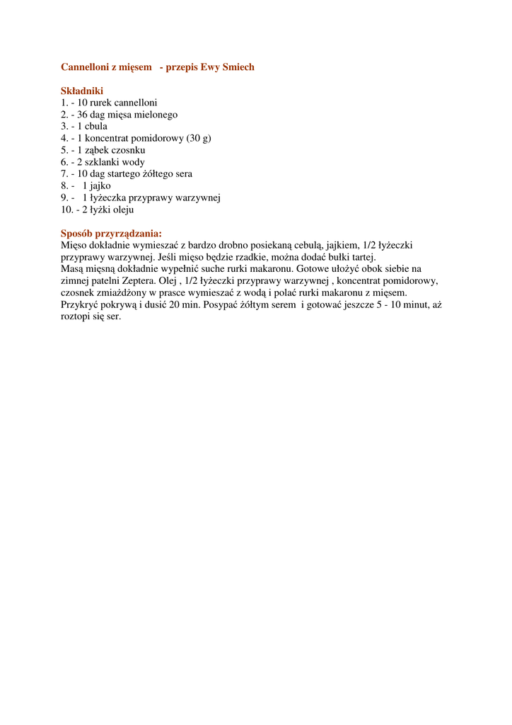 Cannelloni z mięsem - przepis Ewy Smiech Składniki 1. - 10 rurek cannelloni 2. - 36 dag mięsa mielonego 3. - 1 cbula 4. - 1 koncentrat pomidorowy (30 g) 5. - 1 ząbek czosnku 6. - 2 szklanki wody 7. - 10 dag startego Ŝółtego sera 8. - 1 jajko 9. - 1 łyŜeczka przyprawy warzywnej 10. - 2 łyŜki oleju Sposób przyrządzania: Mięso dokładnie wymieszać z bardzo drobno posiekaną cebulą, jajkiem, 1/2 łyŜeczki przyprawy warzywnej. Jeśli mięso będzie rzadkie, moŜna dodać bułki tartej. Masą mięsną dokładnie wypełnić suche rurki makaronu. Gotowe ułoŜyć obok siebie na zimnej patelni Zeptera. Olej , 1/2 łyŜeczki przyprawy warzywnej , koncentrat pomidorowy, czosnek zmiaŜdŜony w prasce wymieszać z wodą i polać rurki makaronu z mięsem. Przykryć pokrywą i dusić 20 min. Posypać Ŝółtym serem i gotować jeszcze 5 - 10 minut, aŜ roztopi się ser.